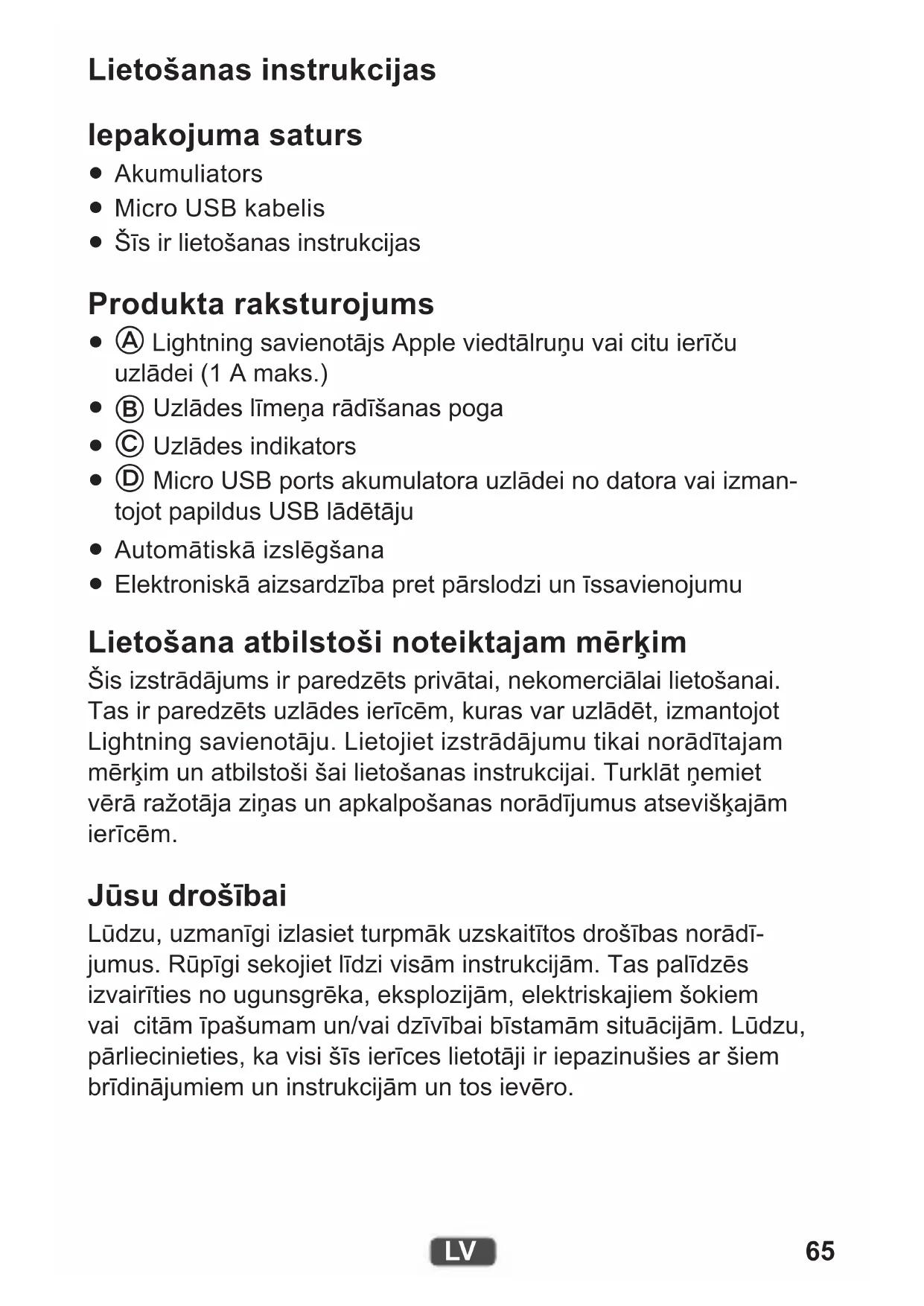 Elektroniskā aizsardzība pret pārslodzi un īssavienojumu Lietošana atbilstoši noteiktajam mērķim Šis izstrādājums ir paredzēts privātai, nekomerciālai lietošanai. Tas ir paredzēts uzlādes ierīcēm, kuras var uzlādēt, izmantojot Lightning savienotāju. Lietojiet izstrādājumu tikai norādītajam mērķim un atbilstoši šai lietošanas instrukcijai. Turklāt ņemiet vērā ražotāja ziņas un apkalpošanas norādījumus atsevišķajām ierīcēm. Jūsu drošībai Lūdzu, uzmanīgi izlasiet turpmāk uzskaitītos drošības norādī- jumus. Rūpīgi sekojiet līdzi visām instrukcijām. Tas palīdzēs izvairīties no ugunsgrēka, eksplozijām, elektriskajiem šokiem vai citām īpašumam un/vai dzīvībai bīstamām situācijām. Lūdzu, pārliecinieties, ka visi šīs ierīces lietotāji ir iepazinušies ar šiem brīdinājumiem un instrukcijām un tos ievēro.66