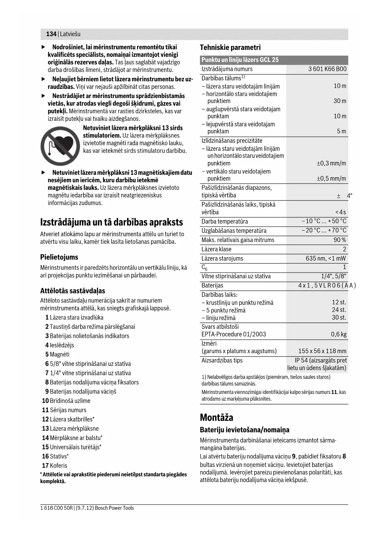 - Attēlotie vai aprakstītie piederumi neietilpst standarta piegādes komplektā. Tehniskie parametri Montāža Bateriju ievietošana/nomaiņa Mērinstrumenta darbināšanai ieteicams izmantot sārma- mangāna baterijas. Lai atvērtu bateriju nodalījuma vāciņu 9, pabīdiet fiksatoru 8 bultas virzienā un noņemiet vāciņu. Ievietojiet baterijas nodalījumā. Ievērojiet pareizu pievienošanas polaritāti, kas attēlota bateriju nodalījuma vāciņa iekšpusē. Punktu un līniju lāzers GCL 25 Izstrādājuma numurs 3 601 K66 B00 Darbības tālums