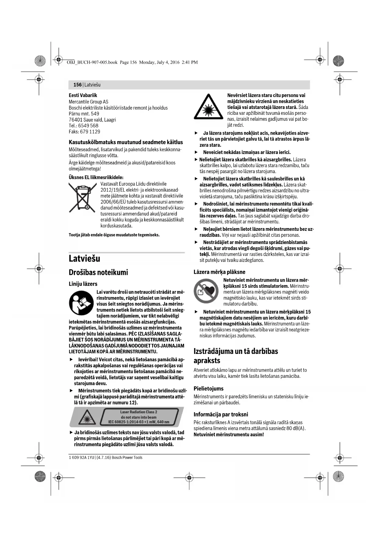 OBJ_BUCH-907-005.book Page 155 Monday, July 4, 2016 2:41 PM156 | Latviešu 1 609 92A 1YU | (4.7.16) Bosch Power Tools Eesti Vabariik Mercantile Group AS Boschi elektriliste käsitööriistade remont ja hooldus Pärnu mnt. 549 76401 Saue vald, Laagri Tel.: 6549 568 Faks: 679 1129 Kasutuskõlbmatuks muutunud seadmete käitlus Mõõteseadmed, lisatarvikud ja pakendid tuleks keskkonna- säästlikult ringlusse võtta. Ärge käidelge mõõteseadmeid ja akusid/patareisid koos olmejäätmetega! Üksnes EL liikmesriikidele: Vastavalt Euroopa Liidu direktiivile 2012/19/EL elektri- ja elektroonikasead- mete jäätmete kohta ja vastavalt direktiivile 2006/66/EÜ tuleb kasutusressursi ammen- danud mõõteseadmed ja defektsed või kasu- tusressursi ammendanud akud/patareid eraldi kokku koguda ja keskkonnasäästlikult korduskasutada. Tootja jätab endale õiguse muudatuste tegemiseks. Latviešu Drošības noteikumi Līniju lāzers Lai varētu droši un netraucēti strādāt ar mē- rinstrumentu, rūpīgi izlasiet un ievērojiet visus šeit sniegtos norādījumus. Ja mērins- truments netiek lietots atbilstoši šeit snieg- tajiem norādījumiem, var tikt nelabvēlīgi ietekmētas mērinstrumentā esošās aizsargfunkcijas. Parūpējieties, lai brīdinošās uzlīmes uz mērinstrumenta vienmēr būtu labi salasāmas. PĒC IZLASĪŠANAS SAGLA- BĀJIET ŠOS NORĀDĪJUMUS UN MĒRINSTRUMENTA TĀ- LĀKNODOŠANAS GADĪJUMĀ NODODIET TOS JAUNAJAM LIETOTĀJAM KOPĀ AR MĒRINSTRUMENTU. Ievērībai! Veicot citas, nekā lietošanas pamācībā ap- rakstītās apkalpošanas vai regulēšanas operācijas vai rīkojoties ar mērinstrumentu lietošanas pamācībā ne- paredzētā veidā, lietotājs var saņemt veselībai kaitīgu starojuma devu. Mērinstruments tiek piegādāts kopā ar brīdinošu uzlī- mi (grafiskajā lappusē parādītajā mērinstrumenta attē- lā tā ir apzīmēta ar numuru 12). Ja brīdinošās uzlīmes teksts nav jūsu valsts valodā, tad pirms pirmās lietošanas pārlīmējiet tai pāri kopā ar mē- rinstrumentu piegādāto uzlīmi jūsu valsts valodā. Nevērsiet lāzera staru citu personu vai mājdzīvnieku virzienā un neskatieties tiešajā vai atstarotajā lāzera starā. Šāda rīcība var apžilbināt tuvumā esošās perso- nas, izraisīt nelaimes gadījumus vai pat bo- jāt redzi. Ja lāzera starojums nokļūst acīs, nekavējoties aizve- riet tās un pārvietojiet galvu tā, lai tā atrastos ārpus lā- zera stara. Neveiciet nekādas izmaiņas ar lāzera ierīci. Nelietojiet lāzera skatbrilles kā aizsargbrilles. Lāzera skatbrilles kalpo, lai uzlabotu lāzera stara redzamību, taču tās nespēj pasargāt no lāzera starojuma. Nelietojiet lāzera skatbrilles kā saulesbrilles un kā aizsargbrilles, vadot satiksmes līdzekļus. Lāzera skat- brilles nenodrošina pilnvērtīgu redzes aizsardzību no ultra- violetā starojuma, taču pasliktina krāsu izšķirtspēju. Nodrošiniet, lai mērinstrumentu remontētu tikai kvali- ficēts speciālists, nomaiņai izmantojot vienīgi oriģinā- lās rezerves daļas. Tas ļaus saglabāt vajadzīgo darba dro- šības līmeni, strādājot ar mērinstrumentu. Neļaujiet bērniem lietot lāzera mērinstrumentu bez uz- raudzības. Viņi var nejauši apžilbināt citas personas. Nestrādājiet ar mērinstrumentu sprādzienbīstamās vietās, kur atrodas viegli degoši šķidrumi, gāzes vai pu- tekļi. Mērinstrumentā var rasties dzirksteles, kas var izrai- sīt putekļu vai tvaiku aizdegšanos. Lāzera mērķa plāksne Netuviniet mērinstrumentu un lāzera mēr- ķplāksni 15 sirds stimulatoriem. Mērinstru- menta un lāzera mērķplāksnes magnēti veido magnētisko lauku, kas var ietekmēt sirds sti- mulatoru darbību. Netuviniet mērinstrumentu un lāzera mērķplāksni 15 magnētiskajiem datu nesējiem un ierīcēm, kuru darbī- bu ietekmē magnētiskais lauks. Mērinstrumenta un lāze- ra mērķplāksnes magnētu iedarbība var izraisīt neatgrieze- niskus informācijas zudumus. Izstrādājuma un tā darbības apraksts Atveriet atlokāmo lapu ar mērinstrumenta attēlu un turiet to atvērtu visu laiku, kamēr tiek lasīta lietošanas pamācība. Pielietojums Mērinstruments ir paredzēts līmenisku un statenisku līniju ie- zīmēšanai un pārbaudei. Informācija par troksni Pēc raksturlīknes A izsvērtais tonālā signāla radītā skaņas spiediena līmenis viena metra attālumā sasniedz 80 dB(A). Netuviniet mērinstrumentu ausīm! Laser Radiation Class 2do not stare into beamIEC 60825-1:2014-03 <1 mW, 640 nm OBJ_BUCH-907-005.book Page 156 Monday, July 4, 2016 2:41 PMLatviešu | 157 Bosch Power Tools 1 609 92A 1YU | (4.7.16) Attēlotās sastāvdaļas Attēloto sastāvdaļu numerācija sakrīt ar numuriem mērinstru- menta attēlā, kas sniegts grafiskajā lappusē. 1 Lāzera stara izvadlūka 2 Baterijas nolietošanās indikators 3 Taustiņš impulsu funkcijas ieslēgšanai 4 Impulsu funkcijas indikators 5 Taustiņš darba režīma pārslēgšanai 6 Indikators darbam bez automātiskas pašizlīdzināšanās 7 Ieslēdzējs 8 5/8" vītne stiprināšanai uz statīva 9 1/4" vītne stiprināšanai uz statīva 10 Bateriju nodalī juma vāciņš 11 Baterijas nodalījuma vāciņa fiksators 12 Brīdinošā uzlīme 13 Sērijas numurs 14 Magnēti 15 Lāzera mērķplāksne 16 Mērplāksne ar balstu* 17 Lāzera starojuma uztvērējs* 18 Aizsargsoma* 19 Universālais turētājs* 20 Teleskopiskais stienis* 21 Lāzera skatbrilles* 22 Statīvs*