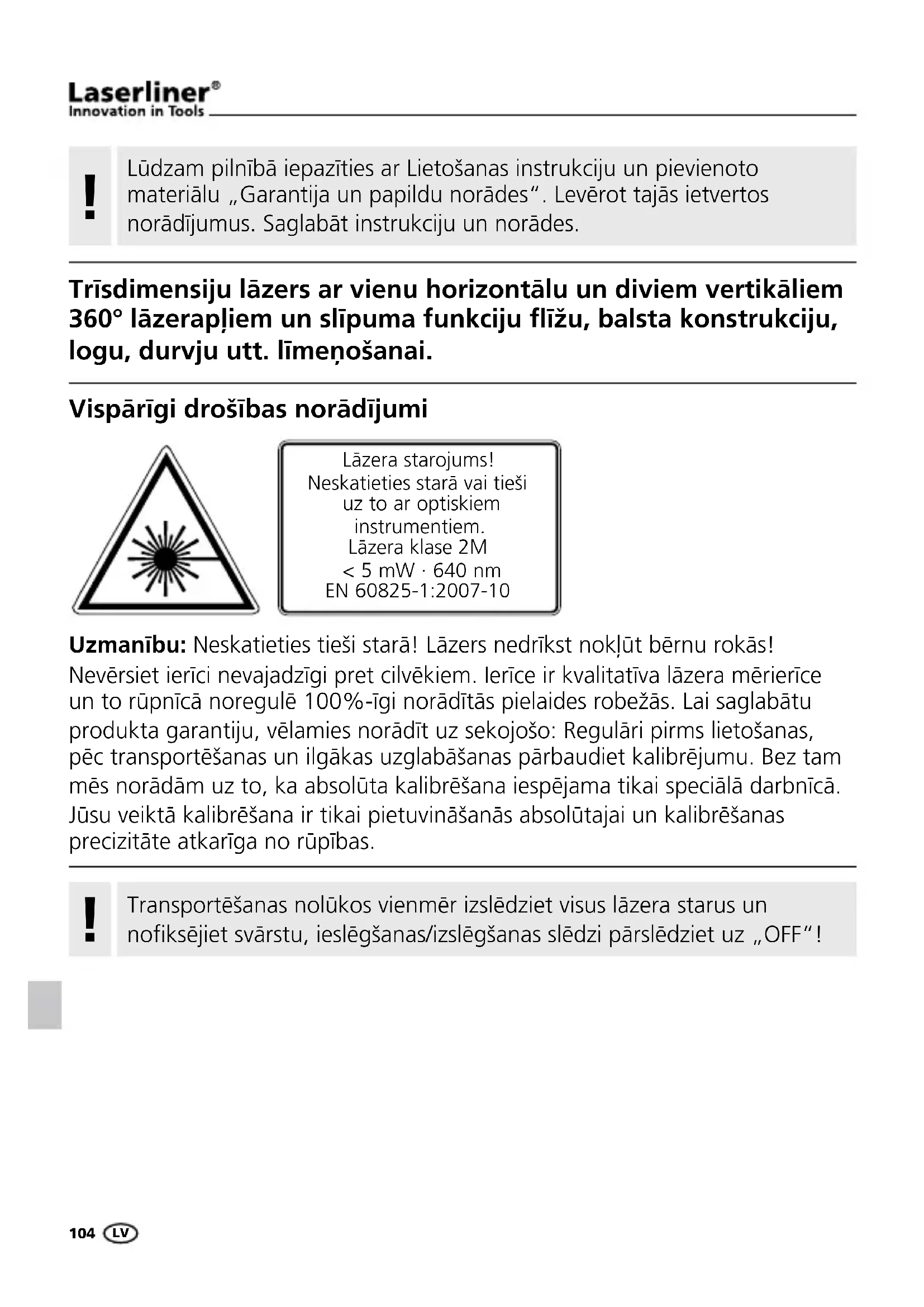Vispārīgi drošības norādījumi Uzmanību: Neskatieties tieši starā! Lāzers nedrīkst nokļūt bērnu rokās! Nevērsiet ierīci nevajadzīgi pret cilvēkiem. Ierīce ir kvalitatīva lāzera mērierīce un to rūpnīcā noregulē 100%-īgi norādītās pielaides robežās. Lai saglabātu produkta garantiju, vēlamies norādīt uz sekojošo: Regulāri pirms lietošanas, pēc transportēšanas un ilgākas uzglabāšanas pārbaudiet kalibrējumu. Bez tam mēs norādām uz to, ka absolūta kalibrēšana iespējama tikai speciālā darbnīcā. Jūsu veiktā kalibrēšana ir tikai pietuvināšanās absolūtajai un kalibrēšanas precizitāte atkarīga no rūpības. Lāzera starojums! Neskatieties starā vai tieši uz to ar optiskiem instrumentiem. Lāzera klase 2M < 5 mW · 640 nm EN 60825-1:2007-10 Transportēšanas nolūkos vienmēr izslēdziet visus lāzera starus un nofiksējiet svārstu, ieslēgšanas/izslēgšanas slēdzi pārslēdziet uz „OFF“!