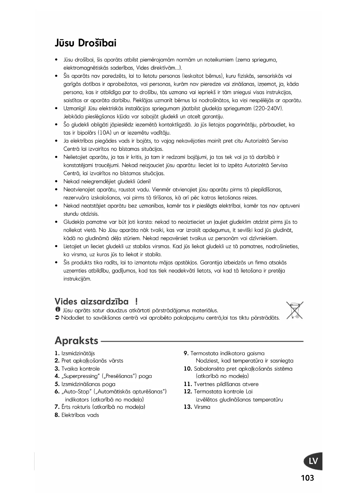 Šis produkts tika radīts, lai to izmantotu mājas apstākļos. Garantija izbeidzās un firma atsakās uzņemties atbildību, gadījumos, kad tas tiek neadekvāti lietots, vai kad tā lietošana ir pretēja instrukcijām. Vides aizsardzība ! Jūsu aprāts satur daudzus atkārtoti pārstrādājamus materiālus. Ü Nododiet to savākšanas centrā vai aprobēto pakalpojumu centrā,lai tas tiktu pārstrādāts. Apraksts