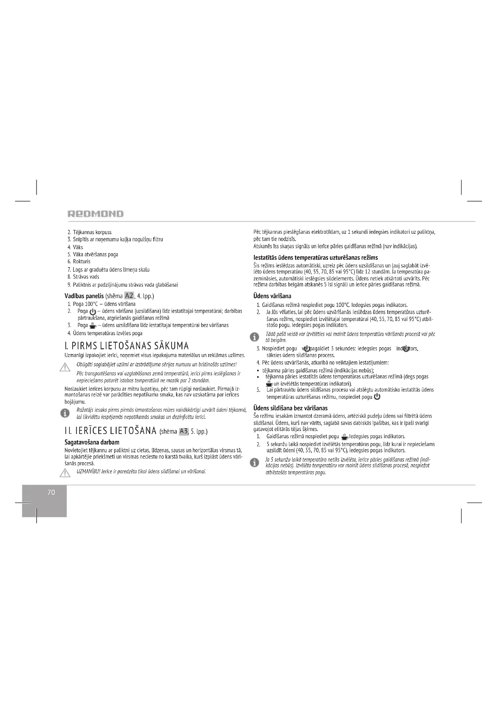 2. Poga — ūdens vārīšana (uzsildīšana) līdz iestatītajai temperatūrai; darbības