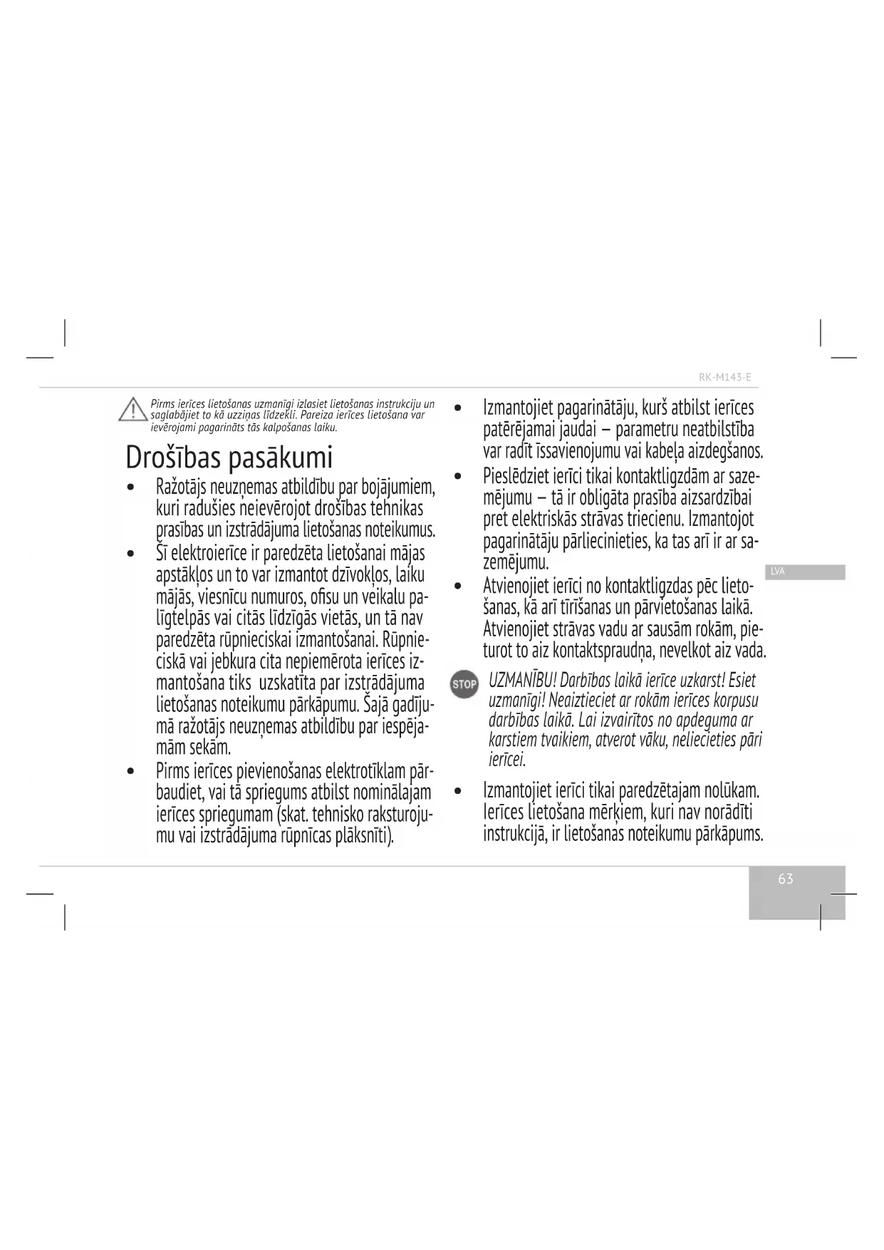 Uzmanīgi izpakojiet ierīci, noņemiet visus iepakojuma materiālus un reklāmas uzlīmes. Obligāti saglabājiet uzlīmi ar izstrādājuma sērijas numuru un brīdinošās uzlīmes. Ja uz ierīces nav sērijas numura, tas automātiski liedz tiesības uz garantijas apkal-pošanu. Noslaukiet ierīces korpusu ar mitru lupatiņu, pēc tam rūpīgi noslaukiet. Pirmajā iz-mantošanas reizē var parādīties nepatīkama smaka, kas nav uzskatāma par ierīces bojājumu. Pēc transportēšanas vai uzglabāšanas zemā temperatūrā, ierīci pirms ieslēg-šanas ir nepieciešams paturēt istabas temperatūrā ne mazāk par 2 stundām.Ražotājs iesaka pirms pirmās izmantošanas reizes vairākkārtīgi uzvārīt ūdeni tējkannā, lai likvidētu iespējamās nepatīkamās smakas un dezincētu ierīci. listiem. Neprofesionāli izpildīti darbi var izrai- sīt ierīces salūšanu, traumas un īpašuma bojā- jumus. UZMANĪBU! Aizliegts izmantot ierīci jebkādu bojājumu gadījumā. Tehniskais raksturojums Modelis ......................................................................................................................RK-M143-E Jauda ......................................................................................................................1850-2100 W Spriegums ............................................................................................... 220-240 V, 50/60 Hz Tilpums ....................................................................................................................................1,7 l Korpusa materiāls ..................................................................................nerūsējošais tērauds Filtrs pret apkaļķošanos .........................................................................................noņemams Lineāra ūdens līmeņa skala .................................................................................................... ir LED apgaismojums ....................................................................................................................ir Automātiska izslēgšanās pēc ūdens uzvārīšanās ............................................................. ir Automātiska izslēgšanās ūdens trūkuma gadījumā ........................................................ir Automātiska izslēgšanās noņemot no paliktņa ................................................................ ir Sildelements ................................................................................................................diskveida Rotācija uz paliktņa ............................................................................................................ 360° Kontaktgrupa ar termosensoru ........................................................................................ Strix Nodalījums strāvas vada glabāšanai ....................................................................................ir Strāvas vada garums ...................................................................................................... 0,75 m Gabarītizmēri .........................................................................................215 × 155 × 223 mm Neto svars .................................................................................................................950 g ± 3%66