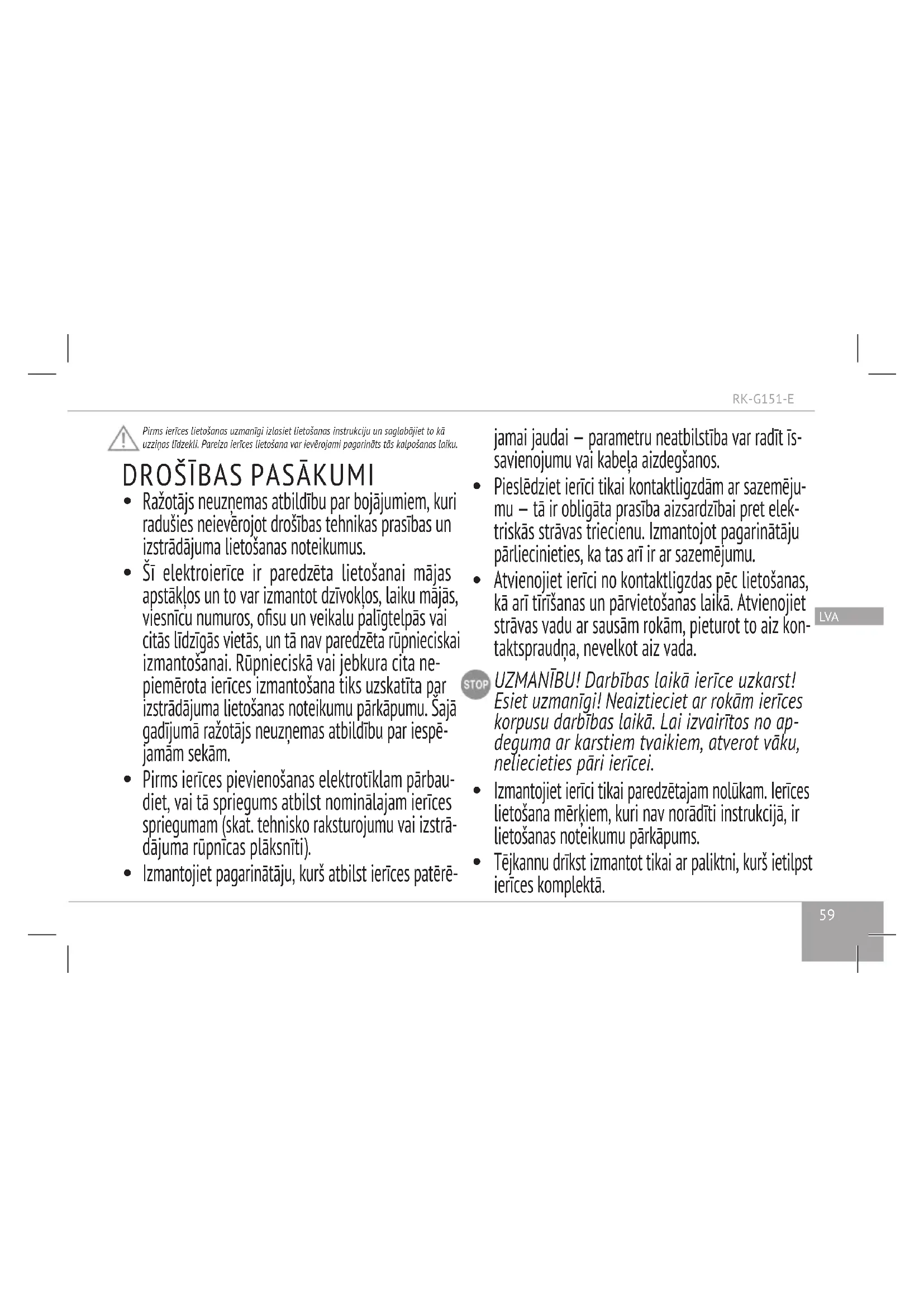 Šim izstrādājumam tiek piešķirta garantija uz 2 gadi no tā iegādāšanās mirkļa. Garantijas perioda laikā ražotājs uzņemas pienākumu novērst, veicot remontu, nomainot detaļas vai nomainot visu izstrādājumu, jebkurus ražošanas defektus, kurus izraisījusi nepietiekama materiālu vai montāžas kvalitāte. Garantija stājas spēkā tikai tajā gadījumā, ja iegādāšanās datums ir apstiprināts ar veikala zīmogu un pārdevēja parakstu oriģinālajā garantijas talonā. Šī garantija tiek atzīta par spēkā esošu tikai tad, ja izstrādājums ir lietots atbilsto- ši lietošanas instrukcijai, nav ticis remontēts, izjaukts un nav bijis sabojāts nepareizas rī- cības ar to rezultātā, kā arī saglabāta pilna izstrādājuma komplektācija. Šī garantija nav attiecināma uz dabīgo izstrādājuma nolietojumu un patērējamajiem materiāliem (ltriem, lampiņām, keramiskajiem un teona pārklājumiem, gumijas blīvējumiem utt.). Izstrādājuma kalpošanas termiņš un ar to saistīto garantijas saistību darbības termiņš tiek aprēķināts no pārdošanas dienas vai no izstrādājuma izgatavošanas datuma (ga- dījumā, ja pārdošanas datumu nav iespējams noteikt). Ierīces izgatavošanas datums ir atrodams sērijas numurā, kas atrodas identikācijas uzlīmē uz izstrādājuma korpusa. Sērijas numurs sastāv no 13 zīmēm. 6. un 7. zīme apzīmē mēnesi, 8. zīme – ierīces izlaiduma gadu. Ražotāja noteiktais ierīces kalpošanas termiņš ir 3 gadi no tā iegādāšanās dienas. Termiņš ir spēkā esošs pie nosacījuma, ka izstrādājuma ekspluatācija notikusi atbilstoši šai instrukcijai un lietojamajiem tehniskajiem standartiem. Šis termiņš ir spēkā tikai ar nosacījumu, ka šī izstrādā- juma ekspluatācija notiek, strikti ievērojot šo instrukciju un uzstādītās tehniskās prasības. Ekoloģiski nekaitīga utilizācija (elektronisko un elektrisko ierīču utilizācija) Iepakojumu, lietošanas instrukciju, kā arī pašu ierīci nepieciešams utilizēt at- bilstoši vietējai atkritumu pārstrādes programmai. Rūpējieties par apkārtējo dabu: neizmetiet šādus izstrādājumus kopā ar parastajiem sadzīves atkritumiem. Izmantotās (vecās) ierīces nedrīkst izmest kopā ar citiem sadzīves atkritu- miem, tos ir nepieciešams utilizēt atsevišķi. Vecās tehnikas īpašniekiem ir jānodod to speciālos pieņemšanas punktos vai atbilstošai organizācijai. Tādā veidā Jūs palīdzat vērtīgo izejvielu pārstrādes procesam. Dotā ierīce ir nomarķēta atbilstoši Eiropas direktīvai 2012/19/EU, kas regulē elektrisko un elektronisko iekārtu utilizāciju. Dotā direktīva nosaka galvenās elektrisko un elektroniski iekārtu atkritumu utilizācijas un pārstrādes prasības, kuras darbojas visā Eiropas Savienības teritorijā.RK-G151-E