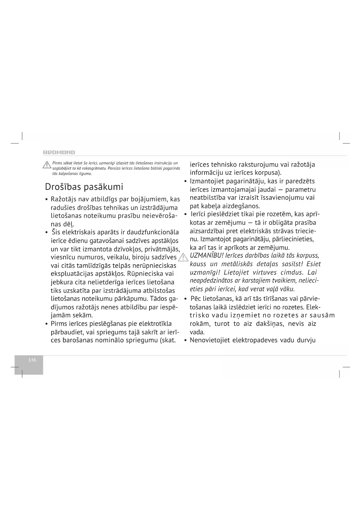 - Ierīci pieslēdziet tikai pie rozetēm, kas aprī- kotas ar zemējumu — tā ir obligāta prasība aizsardzībai pret elektriskās strāvas triecie- nu. Izmantojot pagarinātāju, pārliecinieties, ka arī tas ir aprīkots ar zemējumu. UZMANĪBU! Ierīces darbības laikā tās korpuss, kauss un metāliskās detaļas sasilst! Esiet uzmanīgi! Lietojiet virtuves cimdus. Lai neapdedzinātos ar karstajiem tvaikiem, nelieci- eties pāri ierīcei, kad verat vaļā vāku.