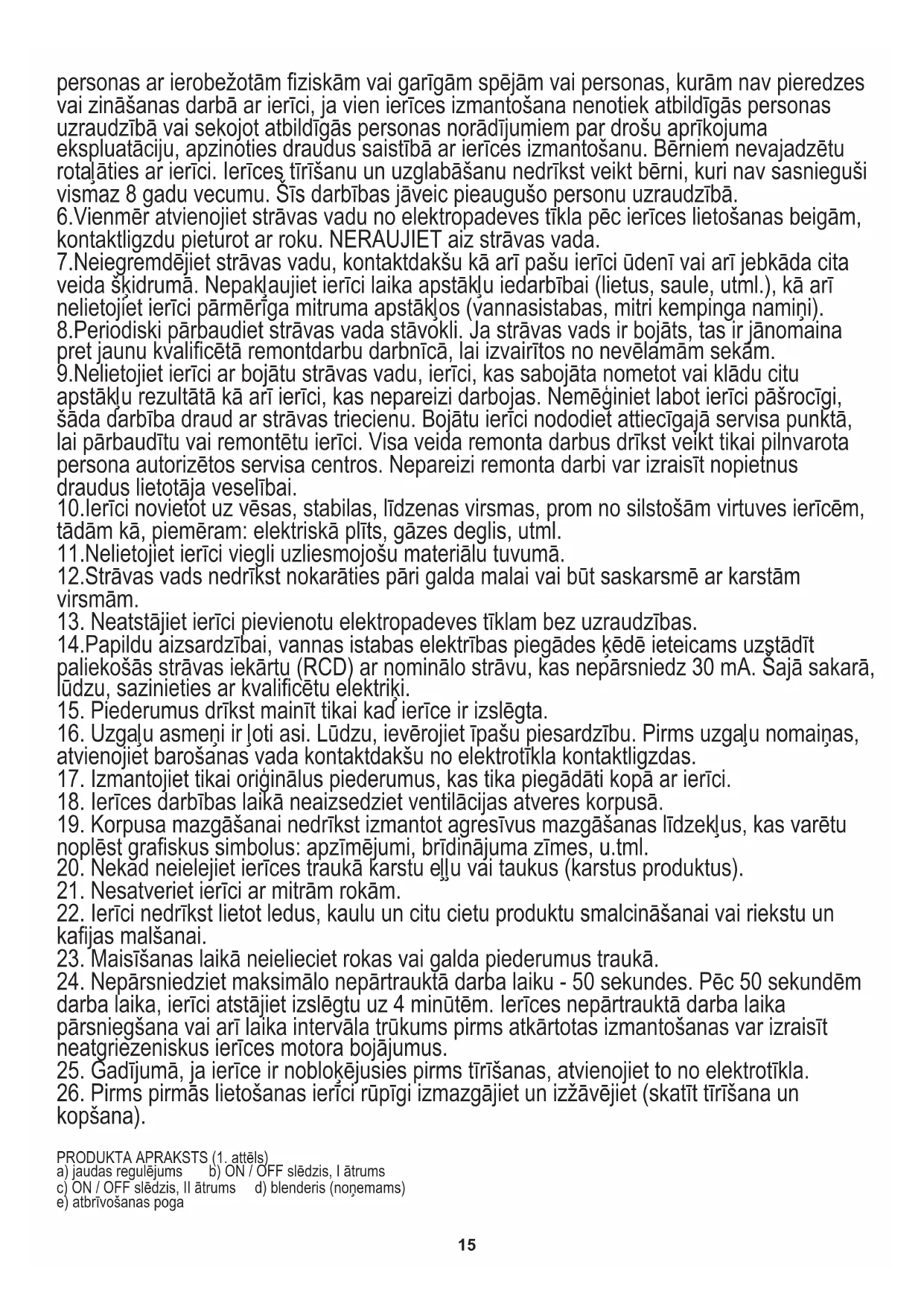 kopšana). PRODUKTA APRAKSTS (1. attēls) a) jaudas regulējums b) ON / OFF slēdzis, I ātrums c) ON / OFF slēdzis, II ātrums d) blenderis (noņemams) e) atbrīvošanas poga