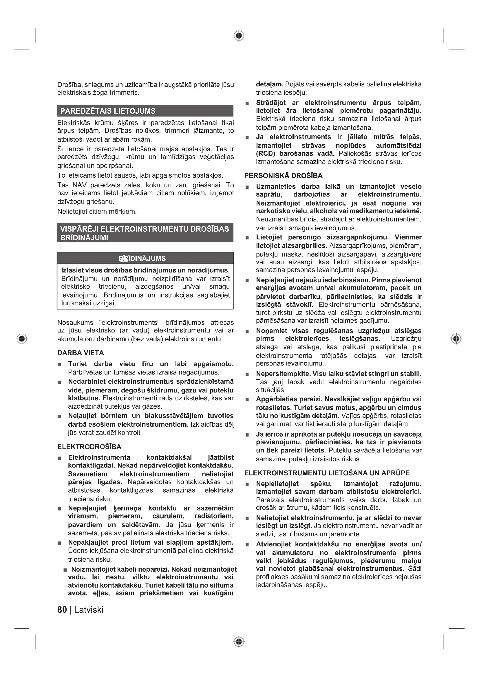 ■ Glabājiet neizmantotus elektroinstrumentus bērniem nepieejamās vietās un neļaujiet neapmācītām personām darboties ar elektroinstrumentiem. Elektroinstrumenti ir bīstami neapmācītu personu rokās. ■ Apkopt elektroinstrumentus. Pārbaudiet kustīgo detaļu savienojumu pareizību, detaļu berzi un citus apstākļus, kas var ietekmēt elektroinstrumenta darbu. Ja elektroinstruments ir bojāts, pirms lietošanas veiciet tā remontu. Daudzus negadījumus izraisa slikti apkopti elektroinstrumenti. ■ Turiet griezējrīkus asus un tīrus. Pareizi apkopti griezējinstrumenti ar asām griezējšķautnēm retāk pielīp un ir vieglāk vadāmi. ■ Izmantojiet elektroierīci, piederumus, darbinstrumentus u.c. saskaņā ar šiem norādījumiem, ņemiet vērā darba apstākļus un veicamo darbu. Elektroinstrumenta izmantošana neparedzētu darbību veikšanai var radīt bīstamu situāciju. APKOPE ■ Vai jūsu elektroinstrumentu apkalpo kvalificēts personāls, izmantojot tikai identiskas rezerves daļas. Tas nodrošinās elektroinstrumenta drošības saglabāšanu. DZĪVŽOGA TRIMMERA DROŠĪBAS BRĪDINĀJUMI ■ Turiet visas ķermeņa daļas prom no asmens. Nenoņemiet sagrieztus materiālus un neturiet griešanai paredzētus materiālus, kad asmeņi atrodas kustībā. Pārliecinieties, vai slēdzis ir izslēgts pirms atbrīvošanās no iestrēgušiem materiāliem. Neuzmanīga rīcība, darbojoties ar ierīci var radīt smagu personisku traumu. ■ Pārnēsājiet dzīvžogu trimmeri aiz roktura un ar apturētu asmeni. Pārvietojot vai novietojot dzīvžogu trimmeri, vienmēr uzlieciet griešanas ierīces pārsegu. Pareiza rīkošanās ar dzīvžogu trimmeri samazinās iespējamu savainojumu gūšanu no asmeņiem. ■ Turiet elektroinstrumentu tikai aiz izolētajām satveršanai paredzētajām virsmām, jo asmens var nonākt saskarē ar apslēptu elektroinstalāciju vai pats ar savu kabeli. Ar spriegumam pieslēgtu vadu saskarē nonākuši asmeņi var radīt spriegumu elektroinstrumenta atklātajās metāla daļās un pakļaut operatoru elektrošokam. ■ Turiet kabeli ārpus griešanas zonas. Izmantošanas laikā, kabelis var atrasties krūmos un var tikt nejauši pārgriezts ar asmeni.