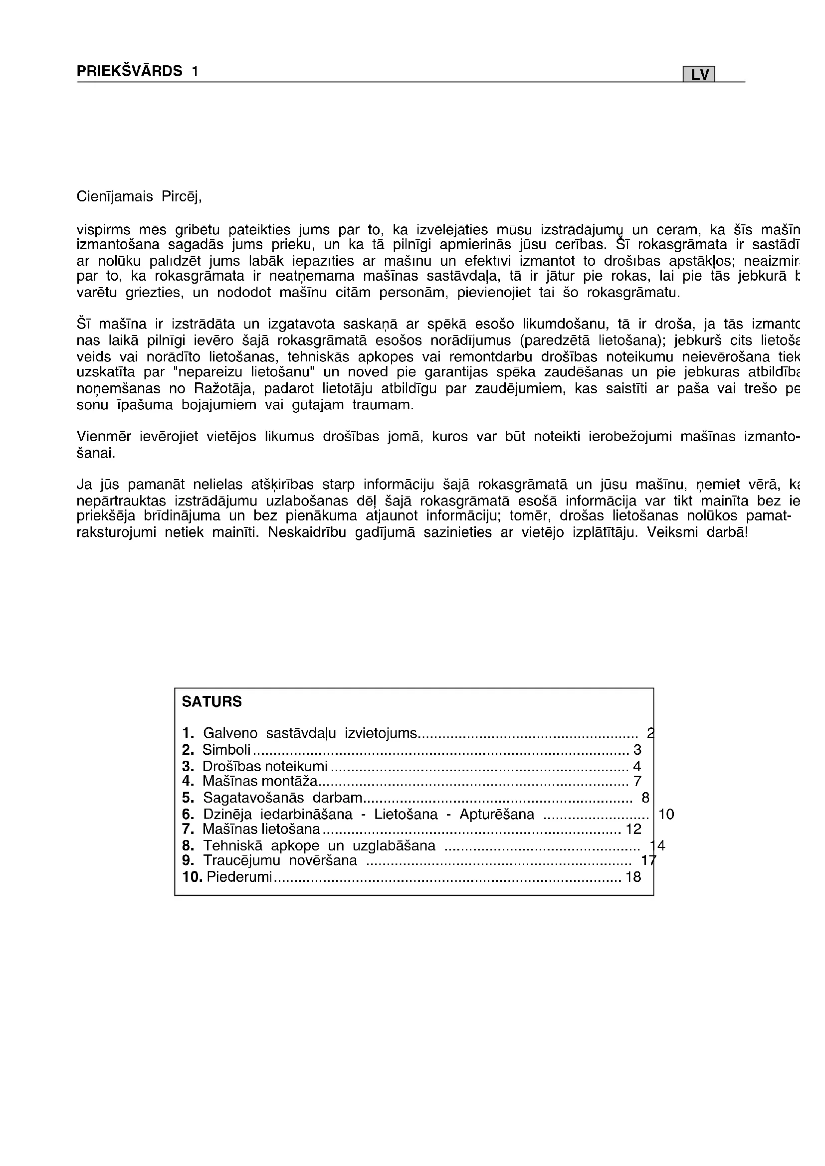 Cienījamais Pircēj, vispirms mēs gribētu pateikties jums par to, ka izvēlējāties mūsu izstrādājumu un ceram, ka šīs mašīnas izmantošana sagadās jums prieku, un ka tā pilnīgi apmierinās jūsu cerības. Šī rokasgrāmata ir sastādīta ar nolūku palīdzēt jums labāk iepazīties ar mašīnu un efektīvi izmantot to drošības apstākļos; neaizmirstiet par to, ka rokasgrāmata ir neatņemama mašīnas sastāvdaļa, tā ir jātur pie rokas, lai pie tās jebkurā brīdī varētu griezties, un nododot mašīnu citām personām, pievienojiet tai šo rokasgrāmatu. Šī mašīna ir izstrādāta un izgatavota saskaņā ar spēkā esošo likumdošanu, tā ir droša, ja tās izmantoša- nas laikā pilnīgi ievēro šajā rokasgrāmatā esošos norādījumus (paredzētā lietošana); jebkurš cits lietošanas veids vai norādīto lietošanas, tehniskās apkopes vai remontdarbu drošības noteikumu neievērošana tiek uzskatīta par "nepareizu lietošanu" un noved pie garantijas spēka zaudēšanas un pie jebkuras atbildības noņemšanas no Ražotāja, padarot lietotāju atbildīgu par zaudējumiem, kas saistīti ar paša vai trešo per- sonu īpašuma bojājumiem vai gūtajām traumām. Vienmēr ievērojiet vietējos likumus drošības jomā, kuros var būt noteikti ierobežojumi mašīnas izmanto- šanai. Ja jūs pamanāt nelielas atšķirības starp informāciju šajā rokasgrāmatā un jūsu mašīnu, ņemiet vērā, ka nepārtrauktas izstrādājumu uzlabošanas dēļ šajā rokasgrāmatā esošā informācija var tikt mainīta bez ie- priekšēja brīdinājuma un bez pienākuma atjaunot informāciju; tomēr, drošas lietošanas nolūkos pamat- raksturojumi netiek mainīti. Neskaidrību gadījumā sazinieties ar vietējo izplātītāju. Veiksmi darbā! SATURS