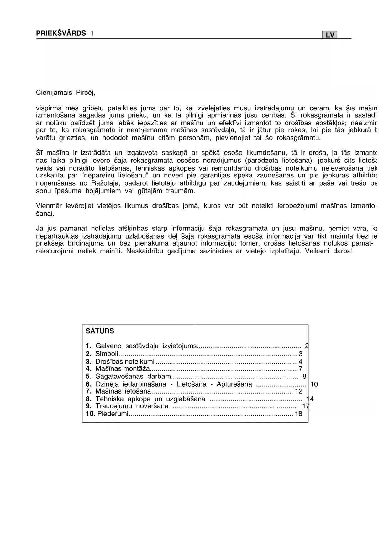 Cienījamais Pircēj, vispirms mēs gribētu pateikties jums par to, ka izvēlējāties mūsu izstrādājumu un ceram, ka šīs mašīnas izmantošana sagadās jums prieku, un ka tā pilnīgi apmierinās jūsu cerības. Šī rokasgrāmata ir sastādīta ar nolūku palīdzēt jums labāk iepazīties ar mašīnu un efektīvi izmantot to drošības apstākļos; neaizmirstiet par to, ka rokasgrāmata ir neatņemama mašīnas sastāvdaļa, tā ir jātur pie rokas, lai pie tās jebkurā brīdī varētu griezties, un nododot mašīnu citām personām, pievienojiet tai šo rokasgrāmatu. Šī mašīna ir izstrādāta un izgatavota saskaņā ar spēkā esošo likumdošanu, tā ir droša, ja tās izmantoša- nas laikā pilnīgi ievēro šajā rokasgrāmatā esošos norādījumus (paredzētā lietošana); jebkurš cits lietošanas veids vai norādīto lietošanas, tehniskās apkopes vai remontdarbu drošības noteikumu neievērošana tiek uzskatīta par "nepareizu lietošanu" un noved pie garantijas spēka zaudēšanas un pie jebkuras atbildības noņemšanas no Ražotāja, padarot lietotāju atbildīgu par zaudējumiem, kas saistīti ar paša vai trešo per- sonu īpašuma bojājumiem vai gūtajām traumām. Vienmēr ievērojiet vietējos likumus drošības jomā, kuros var būt noteikti ierobežojumi mašīnas izmanto- šanai. Ja jūs pamanāt nelielas atšķirības starp informāciju šajā rokasgrāmatā un jūsu mašīnu, ņemiet vērā, ka nepārtrauktas izstrādājumu uzlabošanas dēļ šajā rokasgrāmatā esošā informācija var tikt mainīta bez ie- priekšēja brīdinājuma un bez pienākuma atjaunot informāciju; tomēr, drošas lietošanas nolūkos pamat- raksturojumi netiek mainīti. Neskaidrību gadījumā sazinieties ar vietējo izplātītāju. Veiksmi darbā! SATURS