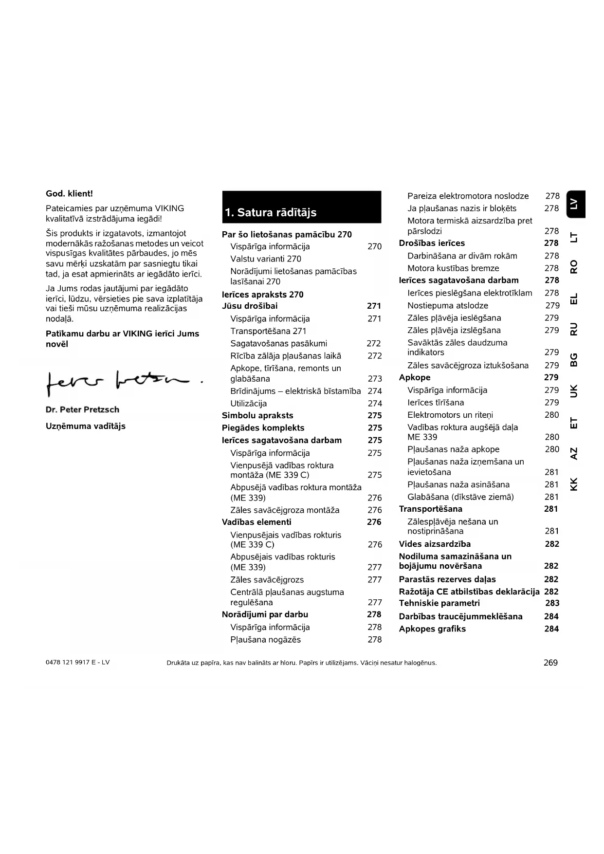 Šī lietošanas pamācība saskaņā ar EK direktīvu 2006/42/EC ir ražotāja oriģinālā lietošanas pamācība. Uzņēmums VIKING nepārtraukti strādā, lai attīstītu piedāvātos produktus. Tāpēc mēs saglabājam tiesības veikt piegādes komplekta izmaiņas, kas attiecas uz produktu formu, tehniku un aprīkojumu. Tādējādi nevar izvirzīt nekādas prasības, atsaucoties uz šajā brošūrā minētajiem datiem un attēliem.