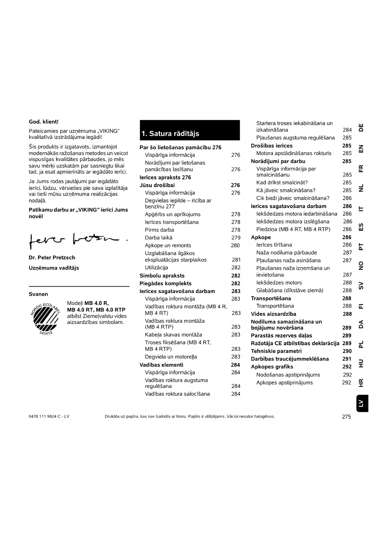 Datum obavljenog servisa Datum sljedećeg servisa275 DEENFRNLITESPTNOSVFIDAPLHUHRLV 0478 111 9924 C - LV God. klient! Pateicamies par uzņēmuma „VIKING” kvalitatīvā izstrādājuma iegādi! Šis produkts ir izgatavots, izmantojot modernākās ražošanas metodes un veicot vispusīgas kvalitātes pārbaudes, jo mēs savu mērķi uzskatām par sasniegtu tikai tad, ja esat apmierināts ar iegādāto ierīci. Ja Jums rodas jautājumi par iegādāto ierīci, lūdzu, vērsieties pie sava izplatītāja vai tieši mūsu uzņēmuma realizācijas nodaļā. Patīkamu darbu ar „VIKING” ierīci Jums novēl Uzņēmuma vadītājs Svanen Modeļi MB 4.0 R,
