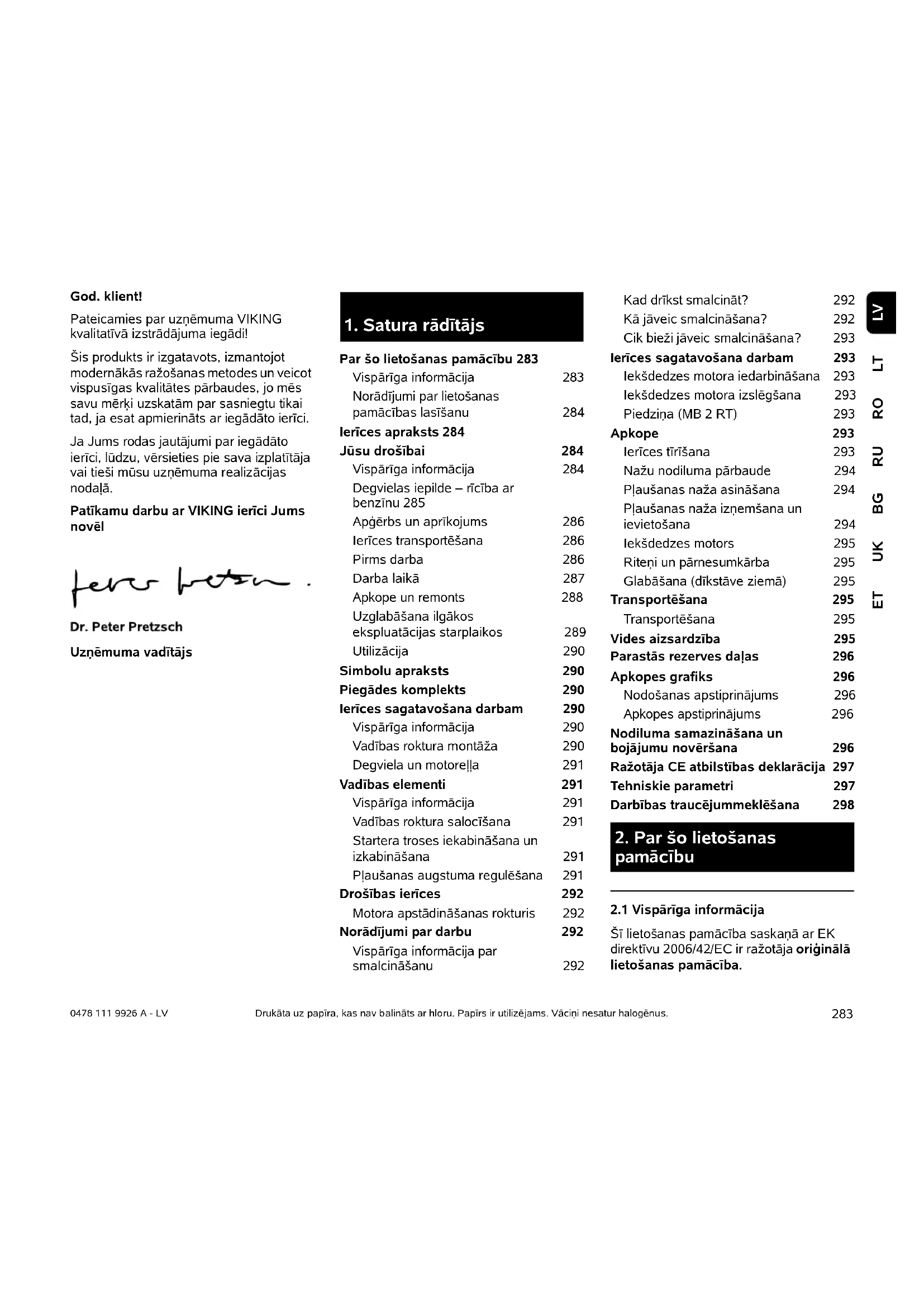 LTRORUBGUKET 0478 111 9926 A - LV God. klient! Pateicamies par uzņēmuma VIKING kvalitatīvā izstrādājuma iegādi! Šis produkts ir izgatavots, izmantojot modernākās ražošanas metodes un veicot vispusīgas kvalitātes pārbaudes, jo mēs savu mērķi uzskatām par sasniegtu tikai tad, ja esat apmierināts ar iegādāto ierīci. Ja Jums rodas jautājumi par iegādāto ierīci, lūdzu, vērsieties pie sava izplatītāja vai tieši mūsu uzņēmuma realizācijas nodaļā. Patīkamu darbu ar VIKING ierīci Jums novēl Uzņēmuma vadītājs