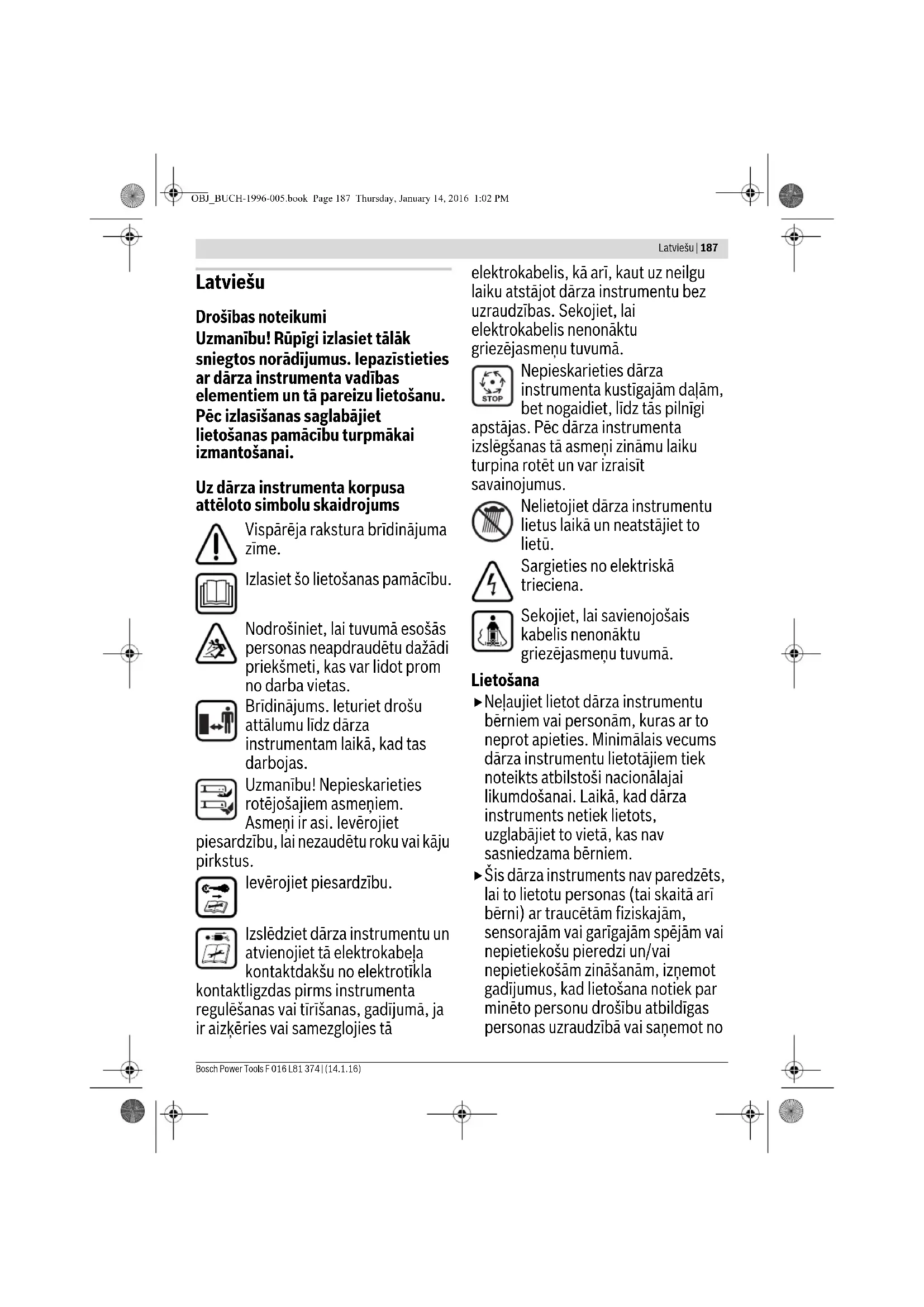 OBJ_BUCH-1996-005.book Page 185 Thursday, January 14, 2016 1:02 PM186 | Eesti F 016 L81 374 | (14.1.16) Bosch Power Tools Vea otsing Klienditeenindus ja müügijärgne nõustamine www.bosch-garden.com Järelepärimiste esitamisel ja varuosade tellimisel näidake kindlasti ära seadme andmesildil olev 10-kohaline tootenumber. Eesti Vabariik Mercantile Group AS Boschi elektriliste käsitööriistade remont ja hooldus Pärnu mnt. 549 76401 Saue vald, Laagri Tel.: 6549 568 Faks: 679 1129 Kasutuskõlbmatuks muutunud seadmete käitlus Aiatööriistad, lisatarvikud ja pakend tuleb keskkonnasäästlikult ringlusse võtta. Ärge visake kasutusressursi ammendanud aiatööriistu olmejäätmete hulka! Üksnes EL liikmesriikidele: Vastavalt Euroopa Liidu direktiivile 2012/19/EL elektri- ja elektroonikaseadmete jäätmete kohta ning direktiivi kohaldamisele liikmesriikides tuleb kasutusressursi ammendanud elektrilised tööriistad eraldi kokku koguda ja keskkonnasäästlikult ringlusse võtta. Tootja jätab endale õiguse muudatuste tegemiseks. STOP Tunnused Võimalik põhjus Kõrvaldamine Mootor ei tööta Puudub võrgupinge Kontrollige ja lülitage sisse Pistikupesa on defektne Kasutage teist pistikupesa Pikendusjuhe on vigastatud Kontrollige toitejuhe üle ja vahetage välja, kui see on vigastatud Kaitse on rakendunud Vahetage kaitse välja Muru on liiga kõrge Reguleerige välja suurem lõikekõrgus ja kallutage aiatööriista, et esialgset koormust vähendada Mootori kaitsesidur rakendus Laske mootoril jahtuda ja reguleerige välja suurem lõikekõrgus Seade töötab katkendlikult Pikendusjuhe on vigastatud Kontrollige toitejuhe üle ja vahetage välja, kui see on vigastatud Seadme siseühendused ei ole korras Pöörduge remonditöökotta Mootori kaitsesidur rakendus Laske mootoril jahtuda ja reguleerige välja suurem lõikekõrgus Niitmistulemus on ebaühtlane ja/või Mootor töötab raskelt Lõikekõrgus on liiga madal Reguleerige välja suurem lõikekõrgus Lõiketera on nüri Lõiketerade vahetus Võimalik on ummistus Kontrollige aiatööriista alumist külge ja vajaduse korral puhastage see (kandke alati aiakindaid) Lõiketera on valepidi monteeritud Monteerige lõiketera õigetpidi Pärast seadme sisselülitamist lõiketera ei pöörle Rohi takistab lõiketera tööd Lülitage seade välja Eemaldage ummistus (kandke alati aiakindaid) Lõiketera mutter/kruvi on lõtv Pingutage lõiketera mutrit/kruvi (17 Nm) Tugev vibratsioon/müra Lõiketera mutter/kruvi on lõtv Pingutage lõiketera mutrit/kruvi (17 Nm) Lõiketera on vigastatud Lõiketerade vahetus OBJ_BUCH-1996-005.book Page 186 Thursday, January 14, 2016 1:02 PMLatviešu | 187 Bosch Power Tools F 016 L81 374 | (14.1.16) Latviešu Drošības noteikumi Uzmanību! Rūpīgi izlasiet tālāk sniegtos norādījumus. Iepazīstieties ar dārza instrumenta vadības elementiem un tā pareizu lietošanu. Pēc izlasīšanas saglabājiet lietošanas pamācību turpmākai izmantošanai. Uz dārza instrumenta korpusa attēloto simbolu skaidrojums Vispārēja rakstura brīdinājuma zīme. Izlasiet šo lietošanas pamācību. Nodrošiniet, lai tuvumā esošās personas neapdraudētu dažādi priekšmeti, kas var lidot prom no darba vietas. Brīdinājums. Ieturiet drošu attālumu līdz dārza instrumentam laikā, kad tas darbojas. Uzmanību! Nepieskarieties rotējošajiem asmeņiem. Asmeņi ir asi. Ievērojiet piesardzību, lai nezaudētu roku vai kāju pirkstus. Ievērojiet piesardzību. Izslēdziet dārza instrumentu un atvienojiet tā elektrokabeļa kontaktdakšu no elektrotīkla kontaktligzdas pirms instrumenta regulēšanas vai tīrīšanas, gadījumā, ja ir aizķēries vai samezglojies tā elektrokabelis, kā arī, kaut uz neilgu laiku atstājot dārza instrumentu bez uzraudzības. Sekojiet, lai elektrokabelis nenonāktu griezējasmeņu tuvumā. Nepieskarieties dārza instrumenta kustīgajām daļām, bet nogaidiet, līdz tās pilnīgi apstājas. Pēc dārza instrumenta izslēgšanas tā asmeņi zināmu laiku turpina rotēt un var izraisīt savainojumus. Nelietojiet dārza instrumentu lietus laikā un neatstājiet to lietū. Sargieties no elektriskā trieciena. Sekojiet, lai savienojošais kabelis nenonāktu griezējasmeņu tuvumā. Lietošana Neļaujiet lietot dārza instrumentu bērniem vai personām, kuras ar to neprot apieties. Minimālais vecums dārza instrumentu lietotājiem tiek noteikts atbilstoši nacionālajai likumdošanai. Laikā, kad dārza instruments netiek lietots, uzglabājiet to vietā, kas nav sasniedzama bērniem. Šis dārza instruments nav paredzēts, lai to lietotu personas (tai skaitā arī bērni) ar traucētām fiziskajām, sensorajām vai garīgajām spējām vai nepietiekošu pieredzi un/vai nepietiekošām zināšanām, izņemot gadījumus, kad lietošana notiek par minēto personu drošību atbildīgas personas uzraudzībā vai saņemot no OBJ_BUCH-1996-005.book Page 187 Thursday, January 14, 2016 1:02 PM188 | Latviešu F 016 L81 374 | (14.1.16) Bosch Power Tools tās norādījumus, kā lietojams dārza instruments. Bērniem jānodrošina vajadzīgā uzraudzība, lai viņi nesāktu rotaļāties ar dārza instrumentu. Neveiciet zāliena appļaušanu, ja darba vietas tiešā tuvumā atrodas citas personas (it īpaši bērni) vai mājdzīvnieki. Instrumenta lietotājs nes atbildību par kaitējumu, kas tā darbības rezultātā tiek nodarīts citām personām vai viņu īpašumam. Nestrādājiet ar dārza instrumentu basām kājām vai vaļējās sandalēs. Darba laikā vienmēr nēsājiet stabilus apavus un garās bikses. Pirms darba rūpīgi pārbaudiet apstrādājamo vietu un attīriet to no akmeņiem, auklām, stieplēm, kauliem un citiem svešķermeņiem. Ik reizi pirms darba pārbaudiet, vai instrumenta asmens, tā stiprinājuma skrūves un griezējmezgls nav nolietojies vai bojāts. Lai saglabātos griezējmezgla līdzsvarojums, nomainiet nolietoto vai bojāto asmeni un tā stiprinājuma skrūves tikai komplekta 