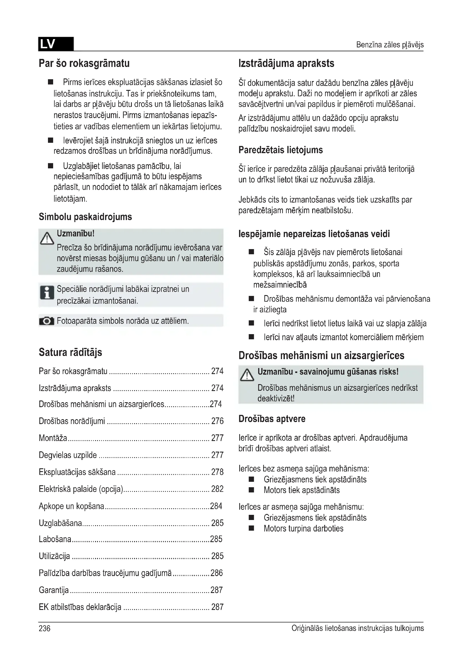 - EKatbilstībasdeklarācija Par šo rokasgrāmatu Pirmsierīcesekspluatācijassākšanasizlasietšo lietošanas instrukciju. Tas ir priekšnoteikums tam, laidarbsarpļāvējubūtudrošsuntālietošanaslaikā nerastostraucējumi.Pirmsizmantošanasiepazīs- tietiesarvadībaselementiemuniekārtaslietojumu. Ievērojietšajāinstrukcijāsniegtosunuzierīces redzamosdrošībasunbrīdinājumanorādījumus. Uzglabājietlietošanaspamācību,lai nepieciešamībasgadījumātobūtuiespējams pārlasīt,unnododiettotālākarīnākamajamierīces lietotājam. Simbolu paskaidrojums Uzmanību! Precīzašobrīdinājumanorādījumuievērošanavar novērstmiesasbojājumugūšanuun/vaimateriālo zaudējumurašanos. Speciālienorādījumilabākaiizpratneiun precīzākaiizmantošanai. Fotoaparātasimbolsnorādauzattēliem. Izstrādājuma apraksts Šīdokumentācijasaturdažādubenzīnazālespļāvēju modeļuaprakstu.Dažinomodeļiemiraprīkotiarzāles savācējtvertniun/vaipapildusirpiemērotimulčēšanai. Arizstrādājumuattēluundažādoopcijuaprakstu palīdzībunoskaidrojietsavumodeli. Paredzētais lietojums Šīierīceirparedzētazālājapļaušanaiprivātāteritorijā untodrīkstlietottikaiuznožuvušazālāja. Jebkādscitstoizmantošanasveidstiekuzskatītspar paredzētajammērķimneatbilstošu. Iespējamie nepareizas lietošanas veidi Šiszālājapļāvējsnavpiemērotslietošanai publiskāsapstādījumuzonās,parkos,sporta kompleksos,kāarīlauksaimniecībāun mežsaimniecībā Drošībasmehānismudemontāžavaipārvienošana ir aizliegta Ierīcinedrīkstlietotlietuslaikāvaiuzslapjazālāja Ierīcinavatļautsizmantotkomerciāliemmērķiem Drošības mehānismi un aizsargierīces Uzmanību - savainojumu gūšanas risks! Drošībasmehānismusunaizsargierīcesnedrīkst deaktivizēt! Drošības aptvere Ierīceiraprīkotaardrošībasaptveri.Apdraudējuma brīdīdrošībasaptveriatlaist. Ierīcesbezasmeņasajūgamehānisma: Griezējasmenstiekapstādināts Motorstiekapstādināts Ierīcesarasmeņasajūgamehānismu: Griezējasmenstiekapstādināts Motors turpina darbotiesLV 237455 999_a 1 Startera trose 9 Griešanasaugstumaregulētājs* 2 Palaide,apstādināšana* 10 Asmeņasajūgamehānisms* 3 Riteņupiedziņasmehānisms* 11 Bezpakāpjuvariātorapārnesumkārba* 4 Drošībasaptvere 12 Lietošanas instrukcija 5 Ergonomisksaugstumaregulētājs* 13 Izsviedes ieliktnis* 6 Iepildeslīmeņaindikators* 14 Noslēgvāks* 7 Atvairītājs* 15 Mulčēšanaskomplekts* 8 Zālessavācējtvertne* 16 Elektriskais starteris aizdedzes 17 Īsurokasgrāmatu Simboli uz ierīces Uzmanību! Lietojotievērotīpašupiesardzību. Pirmsdarbošanāsargriezējmehānismu atvienotaizdedzessvečukontaktspraudni. Pirmsekspluatācijassākšanasizlasītlietošanas instrukciju! Īsurokasgrāmatu Atlaist motora bremzi. Nepieļauttrešopersonuuzturēšanosriskazonā! Īsurokasgrāmatu Ieslēgtriteņupiedziņasmehānismu. Rokasunkājasturētpienācīgāattālumāno griezējmehānisma! Īsurokasgrāmatu Gāzestālvadībassistēmapalaidei/ apstādināšanai. Ievērotattālumulīdzriskazonai. Atvairītājs Atvairītājspasargānonopļautāzālājaizsviešanasgaisā.LV Oriģinālās lietošanas instrukcijas tulkojums p. 287