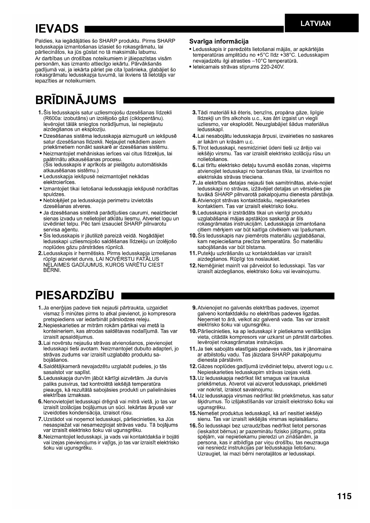 - Šis ledusskapis ir jāutilizē pareizā veidā. Nogādājiet ledusskapi uzliesmojošo saldēšanas līdzekļu un izolējošo noplūdes gāzu pārstrādes rūpnīcā. 2.Ledusskapis ir hermētisks. Pirms ledusskapja izmešanas rūpīgi aizveriet durvis, LAI NOVĒRSTU FATĀLUS NELAIMES GADĪJUMUS, KUROS VARĒTU CIEST BĒRNI. 3.Tādi materiāli kā ēteris, benzīns, propāna gāze, lipīgie līdzekļi un tīrs alkohols u.c., kas ātri izgaist un viegli uzliesmo, var eksplodēt. Neuzglabājiet šādus materiālus ledusskapī. 4.Lai nesabojātu ledusskapja ārpusi, izvairieties no saskares ar lakām un krāsām u.c. 5.Tīrot ledusskapi, nesmidziniet ūdeni tieši uz ārējo vai iekšējo virsmu. Tas var izraisīt elektrisko izolāciju rūsu un nolietošanos. 6.Lai tīrītu elektrisko detaļu tuvumā esošās zonas, vispirms atvienojiet ledusskapi no barošanas tīkla, lai izvairītos no elektriskās strāvas trieciena. 7.Ja elektrības detaļas nejauši tiek samitrinātas, atvie-nojiet ledusskapi no strāvas, izžāvējiet detaļas un vērsieties pie tuvākā SHARP pilnvarotā pakalpojumu dienesta pārstāvja. 8.Atvienojot strāvas kontaktdakšu, nepieskarieties kontaktiem. Tas var izraisīt elektrisko šoku. 9.Ledusskapis ir izstrādāts tikai un vienīgi produktu uzglabāšanai mājas apstākļos saskaņā ar šīs rokasgrāmatas instrukcijām. Ledusskapja izmantošana citiem mērķiem var būt kaitīga cilvēkiem vai īpašumam. 10.Šis ledusskapis nav piemērots materiālu uzglabāšanai, kam nepieciešama precīza temperatūra. Šo materiālu sabojāšanās var būt bīstama. 11.Putekļu uzkrāšanās uz kontaktdakšas var izraisīt aizdegšanos. Rūpīgi tos noslaukiet. 12.Nemēģiniet mainīt vai pārveidot šo ledusskapi. Tas var izraisīt aizdegšanos, elektrisko šoku vai ievainojumu. PIESARDZĪBU 1.Ja enerģijas padeve tiek nejauši pārtraukta, uzgaidiet vismaz 5 minūtes pirms to atkal pievienot, jo kompresora pretspiediens var iedarbināt pārslodzes releju. 2.Nepieskarieties ar mitrām rokām pārtikai vai metā la konteineriem, kas atrodas saldētavas nodalījumā. Tas var izraisīt apsaldējumus. 3.Lai novērstu nejaušu strāvas atvienošanos, pievienojiet ledusskapi tieši avotam. Neizmantojiet dubulto adapteri, jo strāvas zudums var izraisīt uzglabāto produktu sa- bojāšanos. 4.Saldētājkamerā nevajadzētu uzglabāt pudeles, jo tās sasalstot var saplīst. 5.Ledusskapja durvīm jābūt kārtīgi aizvērtām. Ja durvis paliks pusvirus, tad kontrolētā iekšējā temperatūra pieaugs, kā rezultātā sabojāsies produkti un palielināsies elektrības izmaksas. 6.Nenovietojiet ledusskapi drēgnā vai mitrā vietā, jo tas var izraisīt izolācijas bojājumus un sūci. Iekārtas ārpusē var izveidoties kondensācija, izraisot rūsu. 7.Uzstādot vai noņemot ledusskapi, pārliecinieties, ka Jūs nesaspiežat vai nesamezglojat strāvas vadu. Tā bojājums var izraisīt elektrisko šoku vai ugunsgrēku. 8.Neizmantojiet ledusskapi, ja vads vai kontaktdakša ir bojāti vai izejas pievienojums ir vaļīgs, jo tas var izraisīt elektrisko šoku vai ugunsgrēku. 9.Atvienojiet no galvenās elektrības padeves, izņemot galveno kontaktdakšu no elektrības padeves ligzdas. Neņemiet to ārā, velkot aiz galvenā vada. Tas var izraisīt elektrisko šoku vai ugunsgrēku. 10.Pārliecinieties, ka ap ledusskapi ir pietiekama ventilācijas vieta, citādāk kompresors var uzkarst un pārstāt darboties. Ievērojiet rokasgrāmatas instrukcijas. 11.Ja tiek sabojāts elastīgais padeves vads, tas ir jānomaina ar atbilstošu vadu. Tas jāizdara SHARP pakalpojumu dienesta pārstāvim. 12.Gāzes noplūdes gadījumā izvēdiniet telpu, atverot logu u.c. Nepieskarieties ledusskapim strāvas izejas vietā. 13.Uz ledusskapja nedrīkst likt smagus vai trauslus priekšmetus. Atverot vai aizverot ledusskapi, priekšmeti var nokrist, izraisot savainojumu. 14.Uz ledusskapja virsmas nedrīkst likt priekšmetus, kas satur šķidrumus. To izšļakstīšanās var izraisīt elektrisko šoku vai ugunsgrēku. 15.Nemetiet produktus ledusskapī, kā arī nesitiet iekšējo sienu. Tas var izraisīt iekšējās virsmas ieplaisāšanu. 16.Šo ledusskapi bez uzraudzības nedrīkst lietot personas (ieskaitot bērnus) ar pazeminātu fizisko jūtīgumu, prāta spējām, vai nepietiekamu pieredzi un zināšanām, ja persona, kas ir atbildīga par viņu drošību, tas neuzrauga vai nesniedz instrukcijas par ledusskapja lietošanu. Uzraugiet, lai mazi bērni nerotaļātos ar ledusskapi. A808-3 校 _(P115-P123)Latvian_ ラトビア .fm Page 115 Monday, June 16, 2008 2:53 PM116