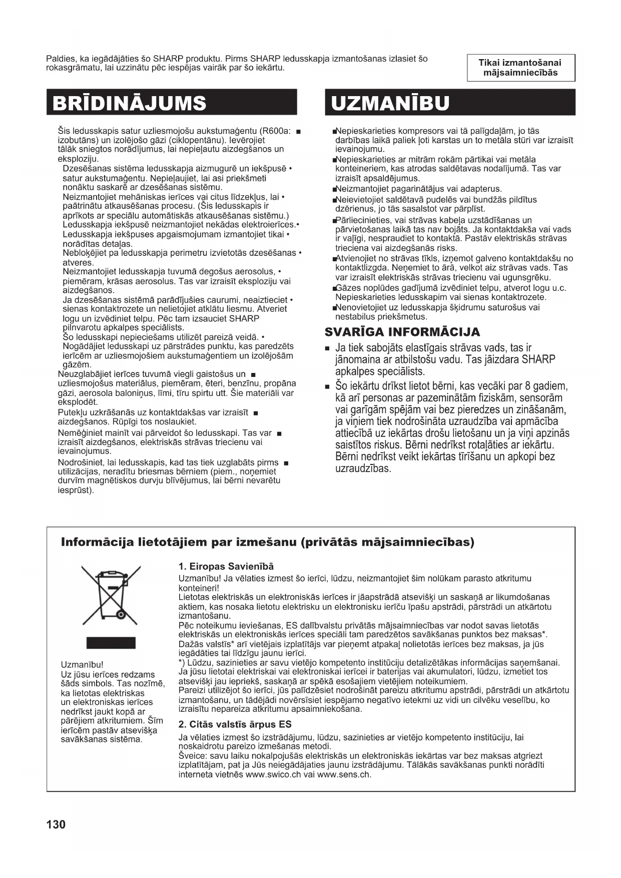 Kreipkitės į artimiausią SHARP įgaliotą aptarnavimo atstovą. (B504)-E.indb 129 2013/11/01 12:37:23130 Tikai izmantošanai mājsaimniecībās Paldies, ka iegādājāties šo SHARP produktu. Pirms SHARP ledusskapja izmantošanas izlasiet šo rokasgrāmatu, lai uzzinātu pēc iespējas vairāk par šo iekārtu. Šis ledusskapis satur uzliesmojošu aukstumaģentu (R600a: ■ izobutāns) un izolējošo gāzi (ciklopentānu). Ievērojiet tālāk sniegtos norādījumus, lai nepieļautu aizdegšanos un eksploziju. Dzesēšanas sistēma ledusskapja aizmugurē un iekšpusē • satur aukstumaģentu. Nepieļaujiet, lai asi priekšmeti nonāktu saskarē ar dzesēšanas sistēmu. Neizmantojiet mehāniskas ierīces vai citus līdzekļus, lai • paātrinātu atkausēšanas procesu. (Šis ledusskapis ir aprīkots ar speciālu automātiskās atkausēšanas sistēmu.) Ledusskapja iekšpusē neizmantojiet nekādas elektroierīces.• Ledusskapja iekšpuses apgaismojumam izmantojiet tikai • norādītas detaļas. Nebloķējiet pa ledusskapja perimetru izvietotās dzesēšanas • atveres. Neizmantojiet ledusskapja tuvumā degošus aerosolus, • piemēram, krāsas aerosolus. Tas var izraisīt eksploziju vai aizdegšanos. Ja dzesēšanas sistēmā parādījušies caurumi, neaiztieciet • sienas kontaktrozete un nelietojiet atklātu liesmu. Atveriet logu un izvēdiniet telpu. Pēc tam izsauciet SHARP pilnvarotu apkalpes speciālists. Šo ledusskapi nepieciešams utilizēt pareizā veidā. • Nogādājiet ledusskapi uz pārstrādes punktu, kas paredzēts ierīcēm ar uzliesmojošiem aukstumaģentiem un izolējošām gāzēm. Neuzglabājiet ierīces tuvumā viegli gaistošus un ■ uzliesmojošus materiālus, piemēram, ēteri, benzīnu, propāna gāzi, aerosola baloniņus, līmi, tīru spirtu utt. Šie materiāli var eksplodēt. Putekļu uzkrāšanās uz kontaktdakšas var izraisīt ■ aizdegšanos. Rūpīgi tos noslaukiet. Nemēģiniet mainīt vai pārveidot šo ledusskapi. Tas var ■ izraisīt aizdegšanos, elektriskās strāvas triecienu vai ievainojumus. Nodrošiniet, lai ledusskapis, kad tas tiek uzglabāts pirms ■ utilizācijas, neradītu briesmas bērniem (piem., noņemiet durvīm magnētiskos durvju blīvējumus, lai bērni nevarētu iesprūst).