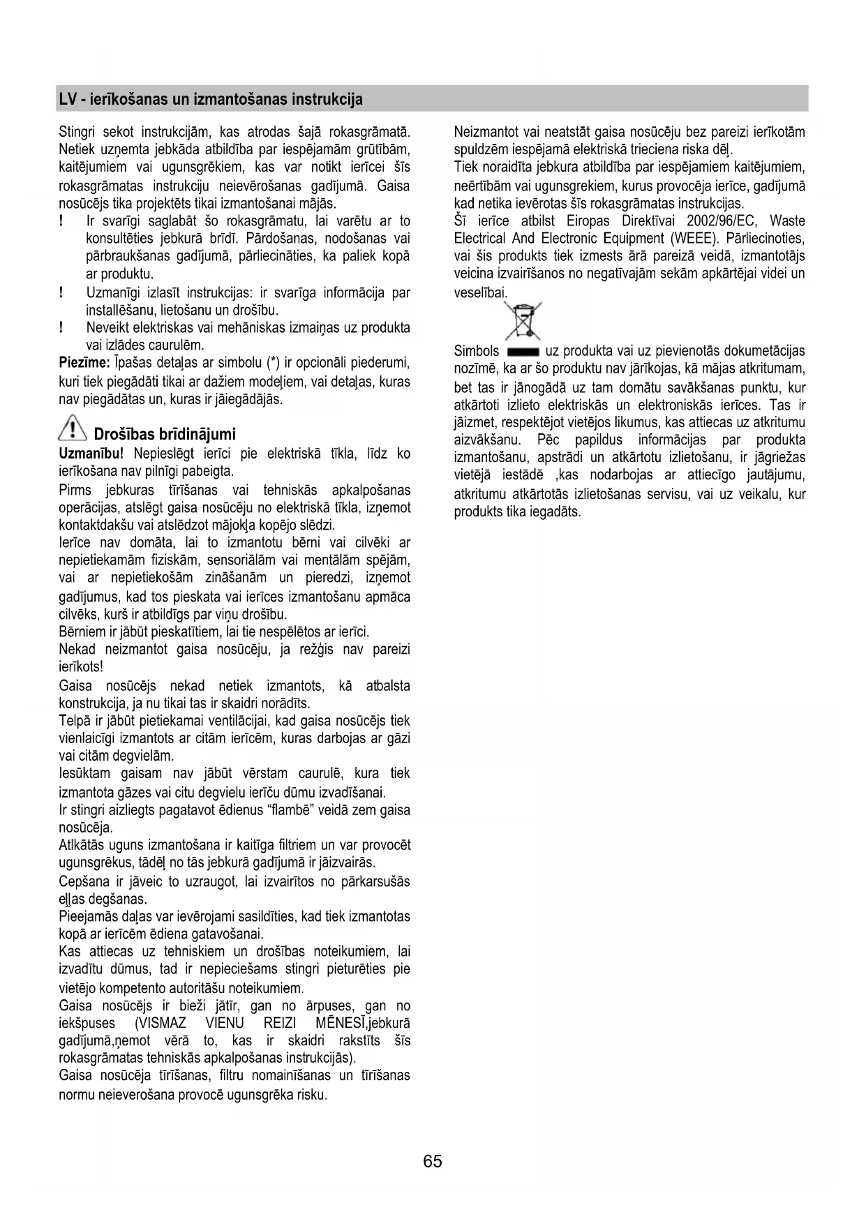 vietā, veikt šo operāciju tikai ja esat droši par veicamo ierīkošanas veidu. Uzmanību! Dažos modeļos aizmugurējās izejas atvērums nav uzreiz sasniedzams, pat noņemot aizbāzni (ja tas ir jau iemontēts), šajā gadījumā noņemt plastmasas detaļu E1 vai E2, kas nobloķē atvērumu izņemot to, ar knaibļu vai neliela nazīša palīdzību. Pārbaudīt, ka iesūkšanas/filtra slēdzis (gaisa nosūcēja iekšpusē) G ir iesūkšanas pozīcijā (A). Versija ar filtru Gadījumā, ja nav iespējams izvadīt ēdiena pagatavošanas dūmus un tvaikus uz ārpusi, var izmantot gaisa nosūcēju versijā ar filtru, ierīkojot ogļu filtru, dūmi un tvaiki tiek attīrīti caur priekšējo režģi, kas atrodas virs komandu paneļa. Pārbaudīt, ka iesūkšanas/filtra slēdzis ir fitra pozīcijā (F). Modeļi bez iesūkšanas motora darbojas tikai iesūkšanas versijā un tiem ir jābūt pievienotiem pie perifēriskas iesūkšanas vienības (nav piegādāta ar ierīci). Savienosanas instrukcijas ir sniegtas kopā ar perifērisko vienību. Ierīkošana Minimālam attālumam starp plīts virsmu, kur tiek novietoti tilpumi un viszemākās gaisa nosūcēja daļas nav jābūt mazākam par 60cm elektriskās plīts gadījumā un 70cm gāzes un kombinētas virtuves gadījumā. Gadījumā, ja ierīkošanas instrukcijās gāzes ierīcei tiek precizēts lielāks attālums, ir nepieciešams to ievērot. Elektriskā pieslēgšana Tīkla spriegumam ir jāatbilst spriegumam, kurš ir atzīmēts uz īpašas etiķetes, kura atrodas gaisa nosūcēja iekšpusē. Ja nosūcējam ir kontaktdakša, pievienot to rozetei, kura atbilst pastāvošiem likumiem un atrodas pieejamā zonā arī pēc installēšanas. Ja gaisa nosūcējam nav kontaktdakšas (tieša pieslēgšana pie elektriskās sistēmas) vai arī kontaktdakša neatrodas pieejamā zonā, arī pēc installēšanas, pielietot normām atbilstošu bipolāru slēdzi, kurš nodrošina pilnu atslēgšanu no tīkla sprieguma, pārslodzes kategorijas III nosacījumos, saskaņā ar ierīkošanas likumiem. Uzmanību! pirms pieslēgt gaisa nosūcējau pie tīkla barošanas un pirms pārbaudīt t ā pareizu darbošanos, vienmēr pārbaudīt ka tīkla kabelis ir ierīkots pareizi. Uzmanību! Barošanas vada nomainīšanu ir jāveic tehniskās apkalpošanas dienestam, lai novērstu jebkuru risku. Ierīkošana Gaisa nosūcējs var būt ierīkots uz sienas vai plakta dibenā; ja tika iedots līdzi, izmantojiet šablonu H, lai urbtu pareizā attālumā, pretējā gadījumā atbalstīt gaisa nosūcēju pret sienu vai plaukta dibenu un atzīmēt ar zīmuli atvērumus, kuri ir jāveic. Fiksēšana pie sienas – Ievietot sienas enkurus J veiktajos atvērumos un divas skrūves K augšējos atvērumos, noņemt režģi un uzkārt gaisa nosūcēju uz 2 skrūvēm, beigās, no iekšpuses, ievietot trešo skrūvi L un piestiprināt tās visas. Fiksēšana pie plaukta – Piefiksēt gaisa nosūc ēju ar 4 skrūvēm M no plaukta iekšpuses.67 Darbošanās izmantot taustus, kuri atrodas uz nosūcēja priekšdaļas lai ieslēgtu gaismas un iesūkšanas motoru. Izmantot augstāku ātrumu īpašas virtuves dūmu koncentrācijas gadījumā. Iesakām ieslēgt iesūkšanu 5 minūtes pirms ēdiena gatavošanas sākšanas un neslēgt to ārā vēl 15 minūtes pēc ēdiena gatavošanas pabeigšanas. Vienmēr atvērt tvaiku savācēju N*. Ja Jūsu produktam nav elekriskās vai mehaniskās iedarbināšanas vārsta, rīcībā esošie tausti un/vai pogas un/vai rokturis ir domāti gaismu kontrolei un vārsta atvēršanai un aizvēršanai. Tehniskā apkalpošana Pirms jebkura veida tehniskās apkalošanas darba, atslēgt gaisa nosūcēju no elektrības.