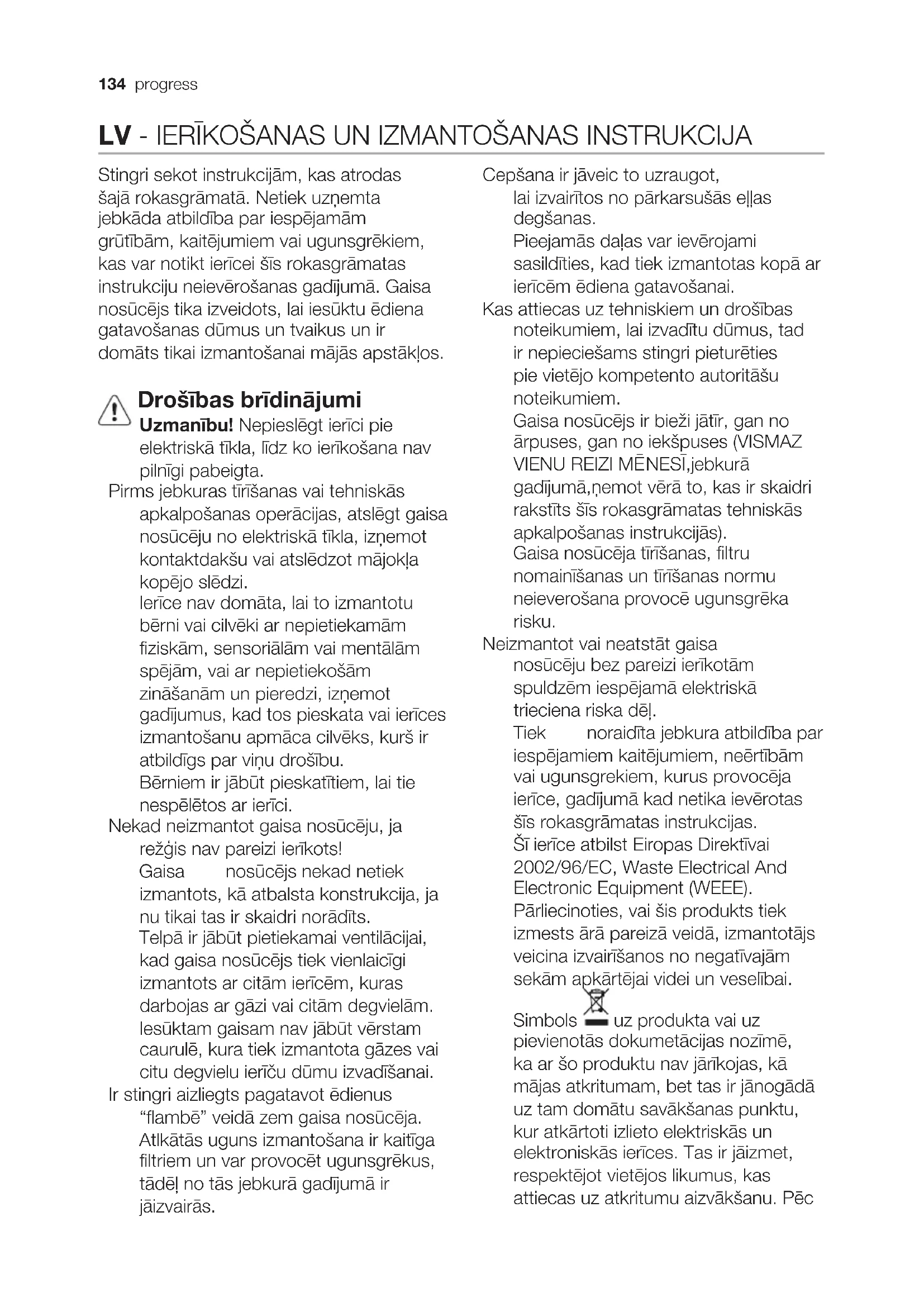 NESĪ,jebkurā gadījumā,ņemot vērā to, kas ir skaidri rakstīts šīs rokasgrāmatas tehniskās apkalpošanas instrukcijās). Gaisa nosūcēja tīrīšanas, filtru nomainīšanas un tīrīšanas normu neieverošana provocē ugunsgrēka risku. Neizmantot vai neatstāt gaisa nosūcēju bez pareizi ierīkotām spuldzēm iespējamā elektriskā trieciena riska dēļ. Tiek noraidīta jebkura atbildība par iespējamiem kaitējumiem, neērtībām vai ugunsgrekiem, kurus provocēja ierīce, gadījumā kad netika ievērotas šīs rokasgrāmatas instrukcijas. Šī ierīce atbilst Eiropas Direktīvai 2002/96/EC, Waste Electrical And Electronic Equipment (WEEE). Pārliecinoties, vai šis produkts tiek izmests ārā pareizā veidā, izmantotājs veicina izvairīšanos no negatīvajām sekām apkārtējai videi un veselībai. Simbols uz produkta vai uz pievienotās dokumetācijas nozīmē, ka ar šo produktu nav jārīkojas, kā mājas atkritumam, bet tas ir jānogādā uz tam domātu savākšanas punktu, kur atkārtoti izlieto elektriskās un elektroniskās ierīces. Tas ir jāizmet, respektējot vietējos likumus, kas attiecas uz atkritumu aizvākšanu. Pēcprogress 135 papildus informācijas par produkta izmantošanu, apstrādi un atkārtotu izlietošanu, ir jāgriežas vietējā iestādē ,kas nodarbojas ar attiecīgo jautājumu, atkritumu atkārtotās izlietošanas servisu, vai uz veikalu, kur produkts tika iegadāts. Izmantošana Gaisa nosūcējs tika izveidots, lai tas būtu izmantots iesūkšanas versijā ar evakuēšanu uz ārpusi vai ar fi ltru ar iekšēju cirkulēšanu . Ierīkošana Šim gaisa nosūcēja veidam ir jābūt piefi ksētam pie griestiem. Ļoti smaga iekārta: Gaisa nosūcēja pārvietošanu un ierīkošanu ir jāveic vismaz diviem vai vairakiem cilvekiem. Minimālam attālumam starp plīts virsmu, kur tiek novietoti tilpumi un viszemākās gaisa nosūcēja daļas nav jābūt mazākam par 40cm elektriskās plīts gadījumā un 55cm gāzes un kombinētas virtuves gadījumā. Gadījumā, ja ierīkošanas instrukcijās gāzes ierīcei tiek precizēts lielāks attālums, ir nepieciešams to ievērot. Tīkla spriegumam ir jāatbilst spriegumam, kurš ir atz īmēts uz īpašas etiķetes, kura atrodas gaisa nosūcēja iekšpusē. Ja nosūcējam ir kontaktdakša, pievienot to rozetei, kura atbilst pastāvošiem likumiem un atrodas pieejamā zonā arī pēc installēšanas. Ja gaisa nosūcējam nav kontaktdakšas (tieša pieslēgšana pie elektriskās sistēmas) vai arī kontaktdakša neatrodas pieejamā zonā, arī pēc installēšanas, pielietot normām atbilstošu bipolāru slēdzi, kurš nodrošina pilnu atslēgšanu no tīkla sprieguma, pārslodzes kategorijas III nosacījumos, saskaņā ar ierīkošanas likumiem. Uzmanību! pirms pieslēgt gaisa nosūcējau pie tīkla barošanas un pirms pārbaudīt tā pareizu darbošanos, vienmēr pārbaudīt ka tīkla kabelis ir ierīkots pareizi. Gaisa nosūcējam ir īpaša barošanas caurule; caurules bojašanās gadījumā, pieprasīt to tehniskās apskalpošanas servisam. Darbošanās Izmantot augstāku ātrumu īpašas virtuves dūmu koncentrācijas gadījumā. Iesakām ieslēgt iesūkšanu 5 minūtes pirms ēdiena gatavošanas sākšanas un neslēgt to ārā vēl 15 minūtes pēc ēdiena gatavošanas pabeigšanas. T1T6 T2 T3 T4 T5 L1 L3 L2 L4 T1. Gaismu ON/OFF T2. Ātruma samazināšana Piespiežot taustu “T2” tiek panākta ātruma pazemināšana, no 4.ātruma (intensīvais) uz 1.ātrumu. Piespiežot taustu “T2” darbošanās laikā 1.ātrumā, gaisa nosūcējs iet uz stāvokli OFF. T3. Ātruma palielināšana Piespiežot taustu T3 gaisa nosūcējs no stāvokļa OFF pāriet 1.ātrumā. Piespiežot taustu (gaisa nosūcējs stāvoklī OFF) tiek palielināts dzinēja ātrums no 1.ātruma uz intensīvo ātrumu (taimeris). 1.ātrums 1 LED L1 2.ātrums LED L1+L2 3.ātrums LED L1+L2+L3 Intensīvais ātrums (ar taimeri) LED L1+L2+L3+L4 mirguļo Piezīme: 4.ātrums (intensīvais ar ātrumu) paliek darbībā 5 minūtes, pēc kā gaisa nosūcējs automātiski uzstāda 2.ātrumu. T4. Ātruma taimeris Ātruma taimeris ieslēdzas piespiežot taustu T4; kad laiks beidzas, gaisa nosūcējs izslēdzas.136 progress Taimerim ir sekojoši uzstādījumi: 1.ātrums - 20 minūtes (LED L1 mirguļo) 2.ātrums - 15 minūtes (LED L2 mirguļo) 3.ātrums - 10 minūtes (LED L3 mirguļo) Intensīvais ātrums - 5 minūtes (LED L4 mirguļo) Darbošanās ar taimeri laikā, piespiežot taustu T2 gaisa nosūcējs iziet no režīma ar taimeri un samazina ātrumu. Piespiežot taustu T3 gaisa nosūcējs iziet no režīma ar taimeri un palielina ātrumu. Piespiežot taustu T4 gaisa nosūcējs iziet no režīma ar taimeri, uzturot uzstādīto ātrumu.. T5. Filtru piesātināšanās paziņojuma kontroles un konfigurācijas tausts: Skatīties attiecīgās instrukcijas tālākajos paragrāfos. T6. Iesūkšanas dzinēja ON/OFF: Kad gaisa nosūcējs ir ieslēgts jebkurā ātrumā, piespiežot taustu T6 gaisa nosūcējs izslēdzas. Kad gaisa nosūcējs ir izslēgts (OFF) piespiežot taustu T6 gaisa nosūcējs ieslēdzas 1.ātrumā. Tauku fi ltru paziņojums Pēc 40.darbošanās stundām mirguļo LED L1. Kad parādās šāda veida paziņojums, ir jāveic tauku fi ltru tehniskā apkope. Lai paziņojumu iestatītu uz nulli, ir jātur piespiests tausts T5 5 sekundes. (gaisa nosūcējs ir stāvoklī ON). Gaisa nosūcējs izdos skaņas signālu “BEEP” un LED L1 pārtrauks mirguļošanu. Ogļu fi ltra paziņojums Pēc 160. darbošanās stundām mirguļo LED L2. Kad parādās šāda veida paziņojums, ir jāveic ogļu fi ltra tehniskā apkope. Lai paziņojumu iestatītu uz nulli, ir jātur piespiests tausts T5 5 sekundes. (gaisa nosūcējs ir stāvoklī ON). Gaisa nosūcējs izdos skaņas signālu “BEEP” un LED L2 pārtrauks mirgu ļošanu. Abu fi ltru vienlaicīgas paziņošanas gadījumā, LED L1 un L2 mirguļos pēc kārtas. Iestatīšana uz nulli notiek, kad augst