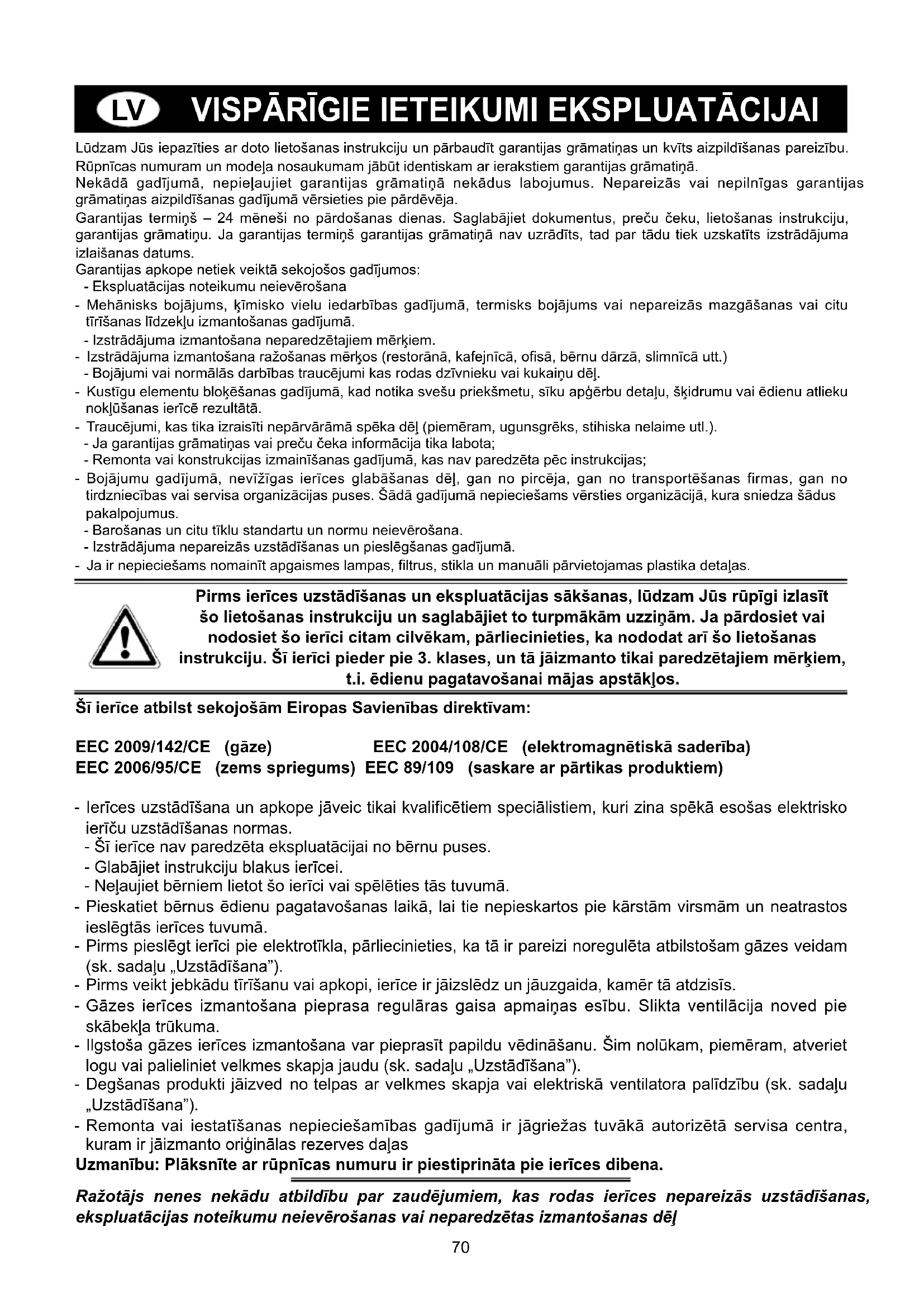 Pirms ierīces uzstādīšanas un ekspluatācijas sākšanas, lūdzam Jūs rūpīgi izlasīt šo lietošanas instrukciju un saglabājiet to turpmākām uzziņām. Ja pārdosiet vai nodosiet šo ierīci citam cilvēkam, pārliecinieties, ka nododat arī šo lietošanas instrukciju. Šī ierīci pieder pie 3. klases, un tā jāizmanto tikai paredzētajiem mērķiem, t.i. ēdienu pagatavošanai mājas apstākļos. Šī ierīce atbilst sekojošām Eiropas Savienības direktīvam: EEC 2009/142/CE (gāze) EEC 2004/108/CE (elektromagnētiskā saderība) EEC 2006/95/CE (zems spriegums) EEC 89/109 (saskare ar pārtikas produktiem) - Ierīces uzstādīšana un apkope jāveic tikai kvalificētiem speciālistiem, kuri zina spēkā esošas elektrisko ierīču uzstādīšanas normas. - Šī ierīce nav paredzēta ekspluatācijai no bērnu puses. - Glabājiet instrukciju blakus ierīcei. - Neļaujiet bērniem lietot šo ierīci vai spēlēties tās tuvumā. - Pieskatiet bērnus ēdienu pagatavošanas laikā, lai tie nepieskartos pie kārstām virsmām un neatrastos ieslēgtās ierīces tuvumā. - Pirms pieslēgt ierīci pie elektrotīkla, pārliecinieties, ka tā ir pareizi noregulēta atbilstošam gāzes veidam (sk. sadaļu „Uzstādīšana”). - Pirms veikt jebkādu tīrīšanu vai apkopi, ierīce ir jāizslēdz un jāuzgaida, kamēr tā atdzisīs. - Gāzes ierīces izmantošana pieprasa regulāras gaisa apmaiņas esību. Slikta ventilācija noved pie skābekļa trūkuma. - Ilgstoša gāzes ierīces izmantošana var pieprasīt papildu vēdināšanu. Šim nolūkam, piemēram, atveriet logu vai palieliniet velkmes skapja jaudu (sk. sadaļu „Uzstādīšana”). - Degšanas produkti jāizved no telpas ar velkmes skapja vai elektriskā ventilatora palīdzību (sk. sadaļu „Uzstādīšana”). - Remonta vai iestatīšanas nepieciešamības gadījumā ir jāgriežas tuvākā autorizētā servisa centra, kuram ir jāizmanto oriģinālas rezerves daļas Uzmanību: Plāksnīte ar rūpnīcas numuru ir piestiprināta pie ierīces dibena. Ražotājs nenes nekādu atbildību par zaudējumiem, kas rodas ierīces nepareizās uzstādīšanas, ekspluatācijas noteikumu neievērošanas vai neparedzētas izmantošanas dēļ Lūdzam Jūs iepazīties ar doto lietošanas instrukciju un pārbaudīt garantijas grāmatiņas un kvīts aizpildīšanas pareizību. Rūpnīcas numuram un modeļa nosaukumam jābūt identiskam ar ierakstiem garantijas grāmatiņā. Nekādā gadījumā, nepieļaujiet garantijas grāmatiņā nekādus labojumus. Nepareizās vai nepilnīgas garantijas grāmatiņas aizpildīšanas gadījumā vērsieties pie pārdēvēja. Garantijas termiņš – 24 mēneši no pārdošanas dienas. Saglabājiet dokumentus, preču čeku, lietošanas instrukciju, garantijas grāmatiņu. Ja garantijas termiņš garantijas grāmatiņā nav uzrādīts, tad par tādu tiek uzskatīts izstrādājuma izlaišanas datums. Garantijas apkope netiek veiktā sekojošos gadījumos: - Ekspluatācijas noteikumu neievērošana - Mehānisks bojājums, ķīmisko vielu iedarbības gadījumā, termisks bojājums vai nepareizās mazgāšanas vai citu tīrīšanas līdzekļu izmantošanas gadījumā. - Izstrādājuma izmantošana neparedzētajiem mērķiem. - Izstrādājuma izmantošana ražošanas mērķos (restorānā, kafejnīcā, ofisā, bērnu dārzā, slimnīcā utt.) - Bojājumi vai normālās darbības traucējumi kas rodas dzīvnieku vai kukaiņu dēļ. - Kustīgu elementu bloķēšanas gadījumā, kad notika svešu priekšmetu, sīku apģērbu detaļu, šķidrumu vai ēdienu atlieku nokļūšanas ierīcē rezultātā. - Traucējumi, kas tika izraisīti nepārvārāmā spēka dēļ (piemēram, ugunsgrēks, stihiska nelaime utl.). - Ja garantijas grāmatiņas vai preču čeka informācija tika labota; - Remonta vai konstrukcijas izmainīšanas gadījumā, kas nav paredzēta pēc instrukcijas; - Bojājumu gadījumā, nevīžīgas ierīces glabāšanas dēļ, gan no pircēja, gan no transportēšanas firmas, gan no tirdzniecības vai servisa organizācijas puses. Šādā gadījumā nepieciešams vērsties organizācijā, kura sniedza šādus pakalpojumus. - Barošanas un citu tīklu standartu un normu neievērošana. - Izstrādājuma nepareizās uzstādīšanas un pieslēgšanas gadījumā. - Ja ir nepieciešams nomainīt apgaismes lampas, filtrus, stikla un manuāli pārvietojamas plastika detaļas.71