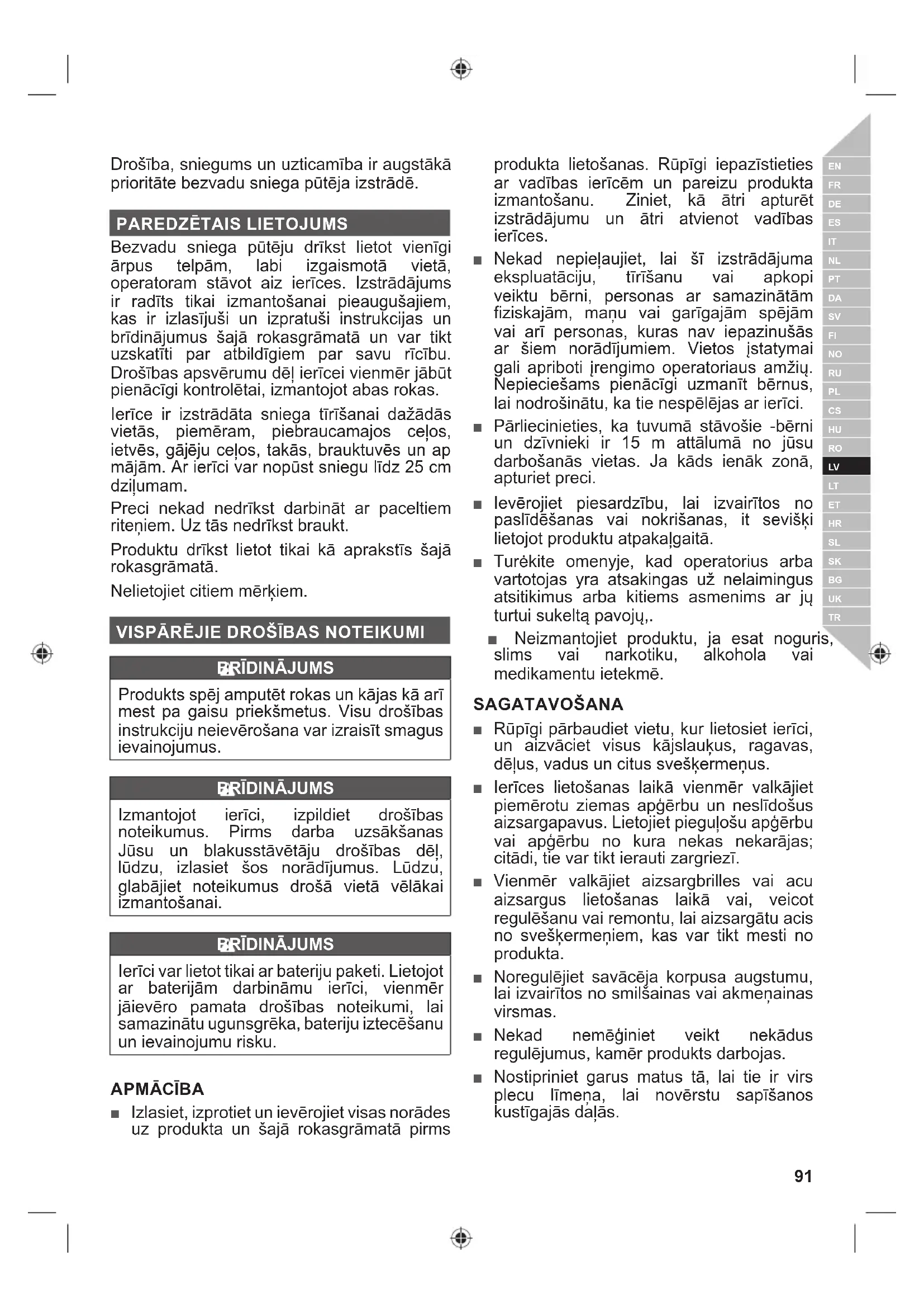 IERĪČU LIETOŠANA UN KOPŠANA ■ Uzlādējiet tikai ar ražotāja noteikto lādētāju. Lādētājs, kas paredzēts lietošanai ar viena veida akumulatoru, var būt ugunsnedrošs, ja to izmanto ar citu akumulatoru. ■ Lietojiet elektriskos instrumentus tikai ar konkrētajai ierīcei paredzēto akumulatoru. Jebkura cita akumulatora lietošana var radīt ievainojumu un ugunsgrēka risku. ■ Kad nelietojat akumulatoru, neturiet to citu metāla priekšmetu tuvumā, piemēram: papīra saspraudes, monētas, atslēgas, naglas, skrūves vai citi sīki metāla priekšmeti, kas var veidot savienojumu starp spailēm. Akumulatora spaiļu īsslēgums var radīt aizdegšanos vai ugunsgrēku. ■ Nepareizas rīcības gadījumā no akumulatora var izkļūt šķidrums; izvairieties no saskares ar to. Nejaušas saskares gadījumā skalojiet skarto vietu ar ūdeni. Ja šķidrums nokļūst acīs, nepieciešama arī medicīniskā palīdzība. No akumulatora izkļuvušais šķidrums var izraisīt kairinājumu vai apdegumus. ■ Neizmantojiet akumulatoru bloku, kas ir bojāts vai pārveidots. Bojāts vai pārveidots akumulatoru bloks var izraisīt neparedzamu darbību, kas var izraisīt uzliesmošanu, sprādzienu vai ievainojumu risku. ■ Nepakļaujiet akumulatoru bloku vai instrumentu liesmu vai paaugstinātas temperatūras iedarbībai. Pakļaujot liesmām vai temperatūrai virs 130°C var izraisīt sprādzienu. ■ Ievērojiet visas lādēšanas instrukcijas un nelādējiet akumulatoru bloku vai instrumentu, ja temperatūra ir ārpus diapazona, kas norādīts instrukcijās. Nepareiza lādēšana vai lādēšana temperatūrā, kas ir ārpus norādītā diapazona, var izraisīt akumulatora bojājumus un palielināt uzliesmošanas risku. SNIEGA PŪTĒJA DROŠĪBAS NOTEIKUMI ■ Nenovietojiet rokas vai kājas zem rotējošām detaļām vai to tuvumā. Visada laikykitės saugaus atstumo nuo išmetimo angos. Nelieciet nekādus priekšmetus atverēs. ■ Ievērojiet īpašu piesardzību, lietojot to uz vai šķērsojot akmeņainas brauktuves vai gājēju celiņus. Uzmanieties no slēptām briesmām, ievērojiet piesardzību, lietojot koplietošanas ceļu tuvumā. ■ Lai samazinātu tādu ievainojumu risku, kas saistīti ar saskarsmi ar rotējošām daļām, vienmēr apturiet izstrādājumu un noņemiet akumulatoru bloku. Pārliecinieties, ka visas kustīgās daļas ir pilnīgi apstājušās: ● Sazāģējot nezināmu priekšmetu, pārbaudiet, vai ierīce nav bojāta. ● ja izstrādājums sāk neparasti vibrēt, nekavējoties pārbaudiet cēloni. Paprastai vibracija yra įspėjimas. ● pirms tīrīšanas vai šķēršļu izciršanas ● pirms atstāt izstrādājumu bez uzraudzības ● pirms ierīces pārbaudīšanas, apkopes vai darbināšanas ■ Netīriet sniegu pret nogāzi. Būkite itin atsargūs ant šlaitų keisdami kryptį. Nemēģiniet notīrīt stāvas nogāzes. ■ Nekādā gadījumā nedarbiniet ierīci bez atbilstošiem aizsargiem, plāksnēm un citām drošības palīgierīcēm. ■ Nekad nevērsiet izmešanas atveri pret cilvēkiem vai vietām, kur var notikt īpašuma bojāšana. Turiet bērnus un pārējos atstatu. ■ Nepārslogojiet ierīci, mēģinot notīrīt sniegu pārāk ātri. ■ Nekad nelietojiet izstrādājumu ar augstu pārvietošanās ātrumu uz slidenām virsmām. Skatieties aiz muguras un ievērojiet piesardzību, lietojot atpakaļgaitā. ■ Atvienojiet piedziņu savācējam/gliemezim, kad produkts tiek pārvadāts vai netiek lietots. ■ Lietojiet tikai oriģinālās ražotāja rezerves daļas, piederumus un uzgaļus.93 Latviski |