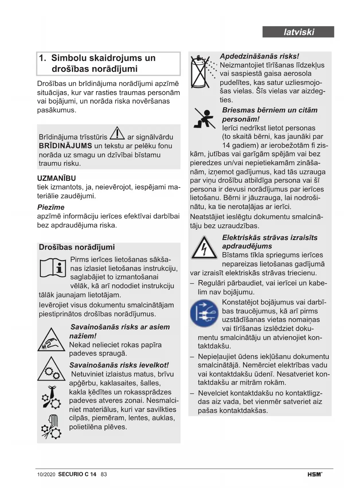 Bīstams tīkla sprie- gums! Nepareiza ierīces lietošana var izraisīt strā- vas triecienu. Pirms uzstādīšanas vietas nomaiņas vai ierīces tīrīšanas izslēdziet dokumentu smalcinā- tāju un atvienojiet kontaktdakšu. Apkope darbus, kas saistīti ar korpusa daļu noņemšanu, drīkst veikt tikai HSM klientu dienests un mūsu sadarbības partneru servisa tehniķi. Klientu atbalsta dienesta adreses skatīt