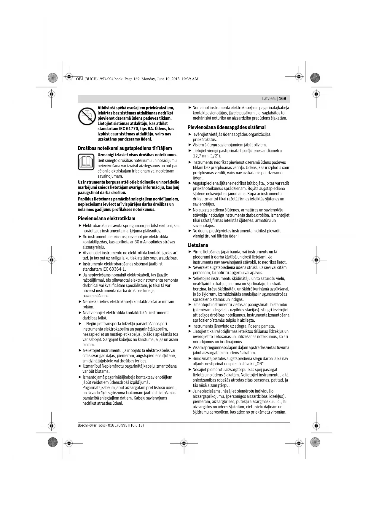 No augstspiediena šļūtenes, armatūras un savienotāju stāvokļa ir atkarīga instrumenta darba drošība. Izmantojiet tikai ražotājfirmas ieteiktās šļūtenes, armatūru un savienotājus. No ūdens pieslēgvietas instrumentam drīkst pievadīt vienīgi tīru vai filtrētu ūdeni. Lietošana Pirms lietošanas jāpārbauda, vai instruments un tā piederumi ir darba kārtībā un droši lietojami. Ja instruments nav nevainojamā stāvoklī, to nedrīkst lietot. Nevērsiet augstspiediena ūdens strūklu uz sevi vai citām personām, lai notīrītu apģērbu vai apavus. Nelietojiet instrumentu šķīdinātāju un to saturošu vielu, neatšķaidītu skābju, acetona un šķīdinātāju, tai skaitā benzīna, krāsu šķīdinātāju un šķidrā kurināmā uzsūkšanai, jo šo šķidrumu izsmidzinātās emulsijas ir ugunsnedrošas, sprādzienbīstamas un indīgas. Izmantojot instrumentu vietās ar paaugstinātu bīstamību (piemēram, degvielas uzpildes stacijās), stingri ievērojiet attiecīgos drošības noteikumus. Instrumenta izmantošana sprādzienbīstamās telpās ir aizliegta. Instruments jānovieto uz stingra, līdzena pamata. Lietojiet tikai ražotājfirmas ieteiktos tīrīšanas līdzekļus un ievērojiet to lietošanas un utilizēšanas noteikumus, kā arī norādījumus un brīdinājumus. Visām spriegumnesošajām daļām apstrādes vietas tuvumā jābūt aizsargātām no ūdens šļakatām. Smidzinātājpistoles augstspiediena slē gu darba laikā nav atļauts nostiprināt nospiestā stāvoklī „ON“. Nēsājiet piemērotu aizsargtērpu, kas spēj pasargāt lietotāju no ūdens šļakatām. Nelietojiet instrumentu, ja tā sniedzamības robežās atrodas citas personas, pat tad, ja tās nēsā aizsargtērpu. Ja nepieciešams, nēsājiet piemērotu individuālo aizsargaprīkojumu, (personīgos aizsardzības līdzekļus), piemēram, aizsargbrilles, putekļu aizsargmasku u. c., lai aizsargātos no ūdens šļakatām, cietu vielu daļiņām un šķidrumu aerosoliem, kas atlec no priekšmetu virsmām. OBJ_BUCH-1953-004.book Page 169 Monday, June 10, 2013 10:39 AM170 | Latviešu F 016 L70 995 | (10.6.13) Bosch Power Tools Lielais ūdens spiediens var izraisīt objektu atlekšanu. Ja nepieciešams, nēsājiet piemērotu individuālo aizsargaprīkojumu, piemēram, aizsargbrilles. Lai augstspiediena ūdens strūkla nesabojātu automašīnu riepas un ventiļus, veiciet to tīrīšanu no vismaz 30 cm liela attāluma. Pirmā bojājumu pazīme ir riepas krāsas maiņa. Bojājumi automašīnas riepās un/vai ventiļos ir bīstami dzīvībai. Nav atļauts apstrādāt ar augstspiediena ūdens strūklu azbestu saturošus un citus līdzīgus materiālus, kas satur veselībai kaitīgas vielas. Nelietojiet ražotājfirmas ieteiktos tīrīšanas līdzekļ