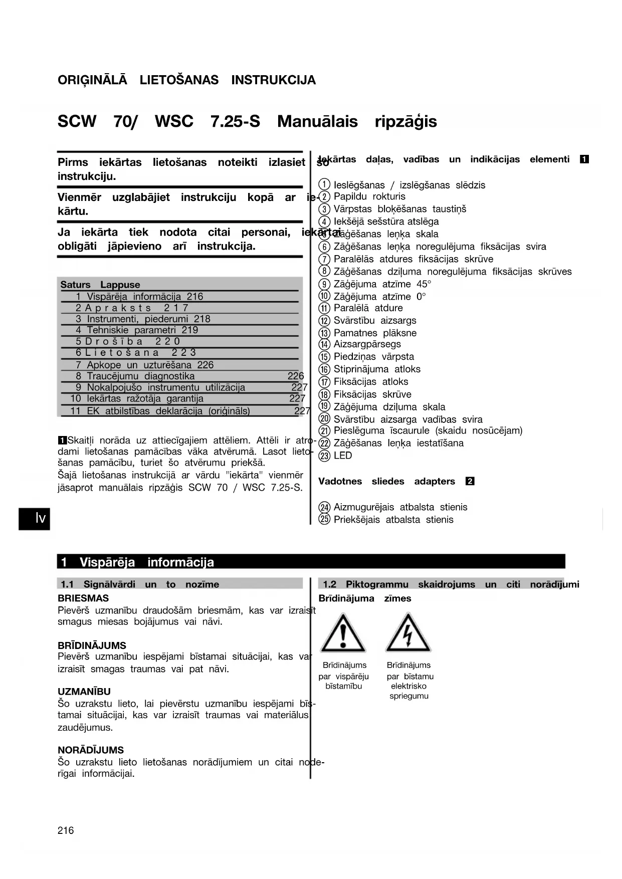 Printed: 14.05.2014 | Doc-Nr: PUB / 5070536 / 000 / 02ORIĢINĀLĀ LIETOŠANAS INSTRUKCIJA SCW 70/ WSC 7.25‑S Manuālais ripzāģis Pirms iekārtas lietošanas noteikti izlasiet šo instrukciju. Vienmēr uzglabājiet instrukciju kopā ar ie- kārtu. Ja iekārta tiek nodota citai personai, iekārtai obligāti jāpievieno arī instrukcija. Saturs Lappuse1 Vispārēja informācija 2162Apraksts 2173 Instrumenti, piederumi 2184 Tehniskie parametri 2195Drošība 2206Lietošana 2237 Apkope un uzturēšana 2268 Traucējumu diagnostika 2269 Nokalpojušo instrumentu utilizācija 22710 Iekārtas ražotāja garantija 22711 EK atbilstības deklarācija (oriģināls) 2271 Skaitļi norāda uz attiecīgajiem attēliem. Attēli ir atro-dami lietošanas pamācības vāka atvērumā. Lasot lieto-šanas pamācību, turiet šo atvērumu priekšā. Šajā lietošanas instrukcijā ar vārdu "iekārta" vienmēr jāsaprot manuālais ripzāģis SCW 70 / WSC 7.25-S.Iekārtas daļas, vadības un indikācijas elementi 1 Ieslēgšanas / izslēgšanas slēdzis Papildu rokturis Vārpstas bloķēšanas taustiņš