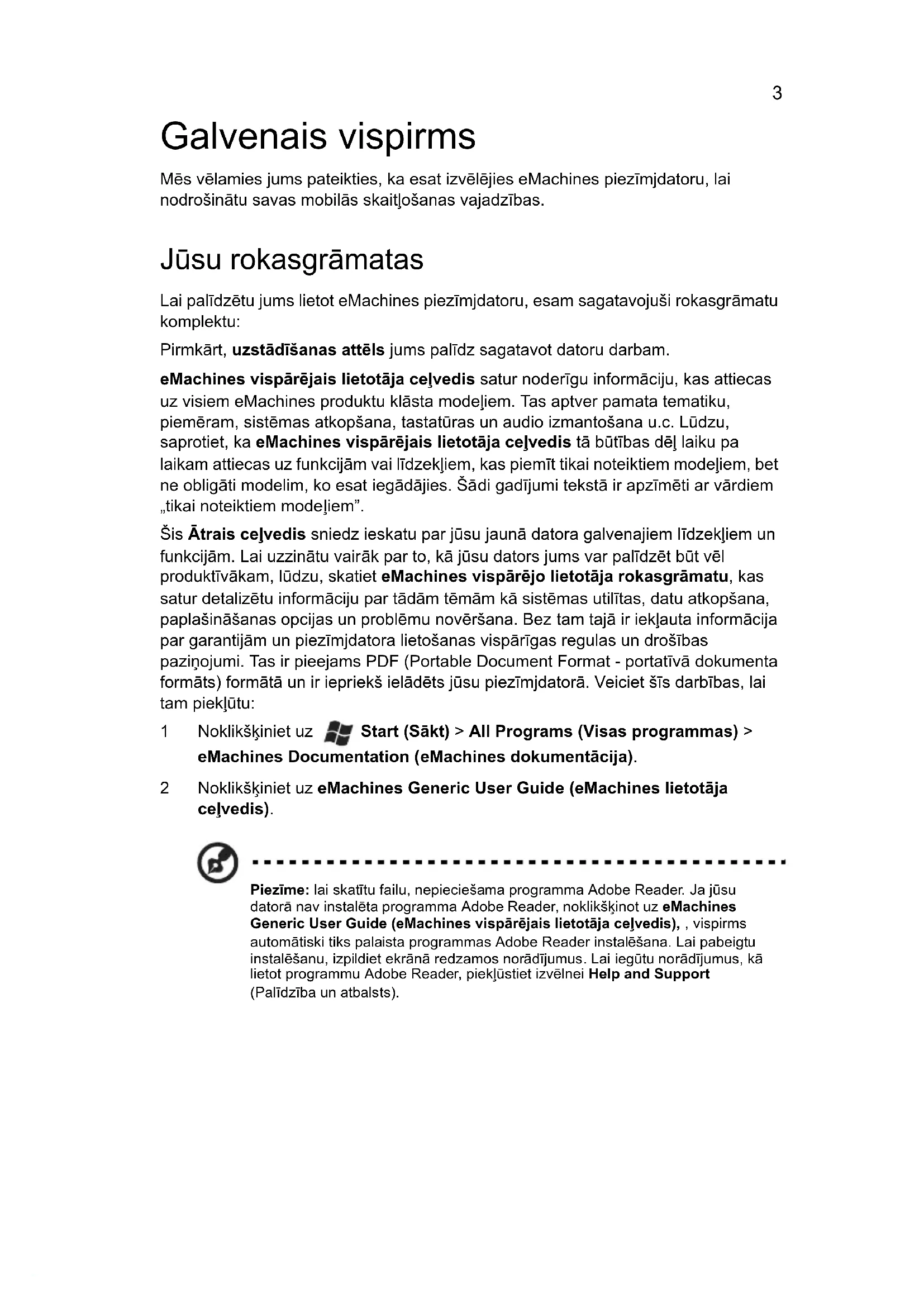 4eMachines piezīmjdatoru sērija ƨtrais ceļvedisModeļa numurs: ________________________________ Sērijas numurs: ________________________________ Pirkuma datums: _______________________________ Pirkuma vieta: _________________________________ © 2010 Visas tiesības aizsargƩtas. eMachines piezīmjdatoru sērijas Ʃtrais ceļvedis OriģinƩlizdevums: 06/20103 Galvenais vispirms Mēs vēlamies jums pateikties, ka esat izvēlējies eMachines piezīmjdatoru, lai nodrošinƩtu savas mobilƩs skaitļošanas vajadzības. Jūsu rokasgrƩmatas Lai palīdzētu jums lietot eMachines piezīmjdatoru, esam sagatavojuši rokasgrƩmatu komplektu: PirmkƩrt, uzstdīšanas attēls jums palīdz sagatavot datoru darbam. eMachines visprējais lietotja ceļvedis satur noderīgu informƩciju, kas attiecas uz visiem eMachines produktu klƩsta modeļiem. Tas aptver pamata tematiku, piemēram, sistēmas atkopšana, tastatūras un audio izmantošana u.c. Lūdzu, saprotiet, ka eMachines visprējais lietotja ceļvedis tƩ būtības dēļ laiku pa laikam attiecas uz funkcijƩm vai līdzekļiem, kas piemīt tikai noteiktiem modeļiem, bet ne obligƩti modelim, ko esat iegƩdƩjies. ŠƩdi gadījumi tekstƩ ir apzīmēti ar vƩrdiem „tikai noteiktiem mode ļiem”. Šis trais ceļvedis sniedz ieskatu par jūsu jaunƩ datora galvenajiem līdzekļiem un funkcijƩm. Lai uzzinƩtu vairƩk par to, kƩ jūsu dators jums var palīdzēt būt vēl produktīvƩkam, lūdzu, skatiet eMachines visprējo lietotja rokasgrmatu, kas satur detalizētu informƩciju par tƩdƩm tēmƩm kƩ sistēmas utilītas, datu atkopšana, paplašinƩšanas opcijas un problēmu novēršana. Bez tam tajƩ ir iekļauta informƩcija par garantijƩm un piezīmjdatora lietošanas vispƩrīgas regulas un drošības paziņojumi. Tas ir pieejams PDF (Portable Document Format - portatīvƩ dokumenta formƩts) formƩtƩ un ir iepriekš ielƩdēts jūsu piezīmjdatorƩ. Veiciet šīs darbības, lai tam piekļūtu: 1Noklikšķiniet uz Start (Skt) > All Programs (Visas programmas) > eMachines Documentation (eMachines dokumentcija). 2Noklikšķiniet uz eMachines Generic User Guide (eMachines lietotja ceļvedis). Piezīme: lai skatītu failu, nepieciešama programma Adobe Reader. Ja jūsu datorƩ nav instalēta programma Adobe Reader, noklikšķinot uz eMachines Generic User Guide (eMachines visprējais lietotja ceļvedis), , vispirms automƩtiski tiks palaista programmas Adobe Reader instalēšana. Lai pabeigtu instalēšanu, izpildiet ekrƩnƩ redzamos norƩdījumus. Lai iegūtu norƩdījumus, kƩ lietot programmu Adobe Reader, piekļūstiet izvēlnei Help and Support (Palīdzība un atbalsts).Latviski