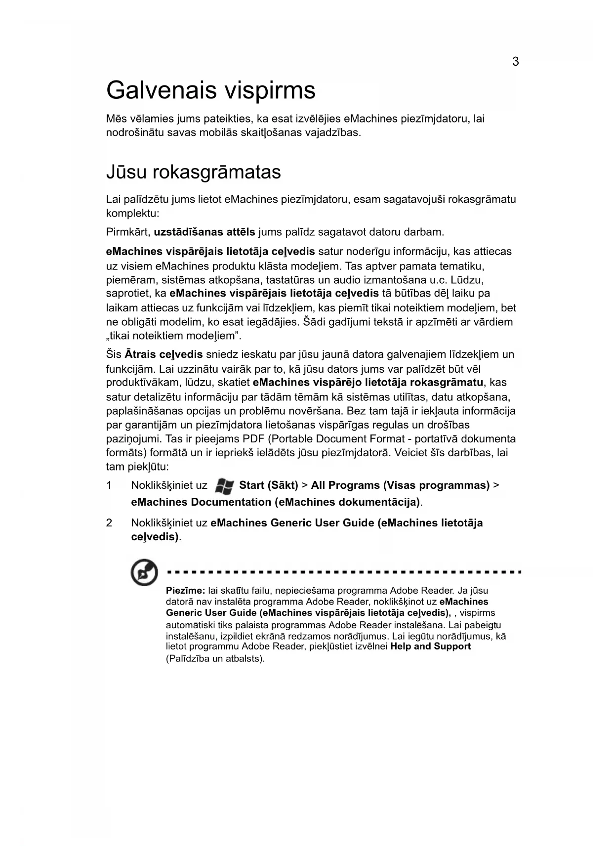 4eMachines piezīmjdatoru sƯrija ƨtrais ceļvedisModeļa numurs: ________________________________ SƯrijas numurs: ________________________________ Pirkuma datums: _______________________________ Pirkuma vieta: _________________________________ © 2010 Visas tiesības aizsargƩtas. eMachines piezīmjdatoru sƯrijas Ʃtrais ceļvedis OriģinƩlizdevums: 07/20103 Galvenais vispirms MƯs vƯlamies jums pateikties, ka esat izvƯlƯjies eMachines piezīmjdatoru, lai nodrošinƩtu savas mobilƩs skaitļošanas vajadzības. Jūsu rokasgrƩmatas Lai palīdzƯtu jums lietot eMachines piezīmjdatoru, esam sagatavojuši rokasgrƩmatu komplektu: PirmkƩrt, uzstdīšanas attēls jums palīdz sagatavot datoru darbam. eMachines visprējais lietotja ceļvedis satur noderīgu informƩciju, kas attiecas uz visiem eMachines produktu klƩsta modeļiem. Tas aptver pamata tematiku, piemƯram, sistƯmas atkopšana, tastatūras un audio izmantošana u.c. Lūdzu, saprotiet, ka eMachines visprējais lietotja ceļvedis tƩ būtības dƯļ laiku pa laikam attiecas uz funkcijƩm vai līdzekļiem, kas piemīt tikai noteiktiem modeļiem, bet ne obligƩti modelim, ko esat iegƩdƩjies. ŠƩdi gadījumi tekstƩ ir apzīmƯti ar vƩrdiem „tikai noteiktiem mode ļiem”. Šis trais ceļvedis sniedz ieskatu par jūsu jaunƩ datora galvenajiem līdzekļiem un funkcijƩm. Lai uzzinƩtu vairƩk par to, kƩ jūsu dators jums var palīdzƯt būt vƯl produktīvƩkam, lūdzu, skatiet eMachines visprējo lietotja rokasgrmatu, kas satur detalizƯtu informƩciju par tƩdƩm tƯmƩm kƩ sistƯmas utilītas, datu atkopšana, paplašinƩšanas opcijas un problƯmu novƯršana. Bez tam tajƩ ir iekļauta informƩcija par garantijƩm un piezīmjdatora lietošanas vispƩrīgas regulas un drošības paziņojumi. Tas ir pieejams PDF (Portable Document Format - portatīvƩ dokumenta formƩts) formƩtƩ un ir iepriekš ielƩdƯts jūsu piezīmjdatorƩ. Veiciet šīs darbības, lai tam piekļūtu: 1Noklikšķiniet uz Start (Skt) > All Programs (Visas programmas) > eMachines Documentation (eMachines dokumentcija). 2Noklikšķiniet uz eMachines Generic User Guide (eMachines lietotja ceļvedis). Piezīme: lai skatītu failu, nepieciešama programma Adobe Reader. Ja jūsu datorƩ nav instalƯta programma Adobe Reader, noklikšķinot uz eMachines Generic User Guide (eMachines visprējais lietotja ceļvedis), , vispirms automƩtiski tiks palaista programmas Adobe Reader instalƯšana. Lai pabeigtu instalƯšanu, izpildiet ekrƩnƩ redzamos norƩdījumus. Lai iegūtu norƩdījumus, kƩ lietot programmu Adobe Reader, piekļūstiet izvƯlnei Help and Support (Palīdzība un atbalsts).4 Latviski eMachines piezīmjdatora pƩrskats Ja esat sagatavojis datoru darbam kƩ redzams uzstƩdīšanas attƯlƩ, ļaujiet mums jūs iepazīstinƩt ar jūsu jauno eMachines piezīmjdatoru. Skats no augšpuses