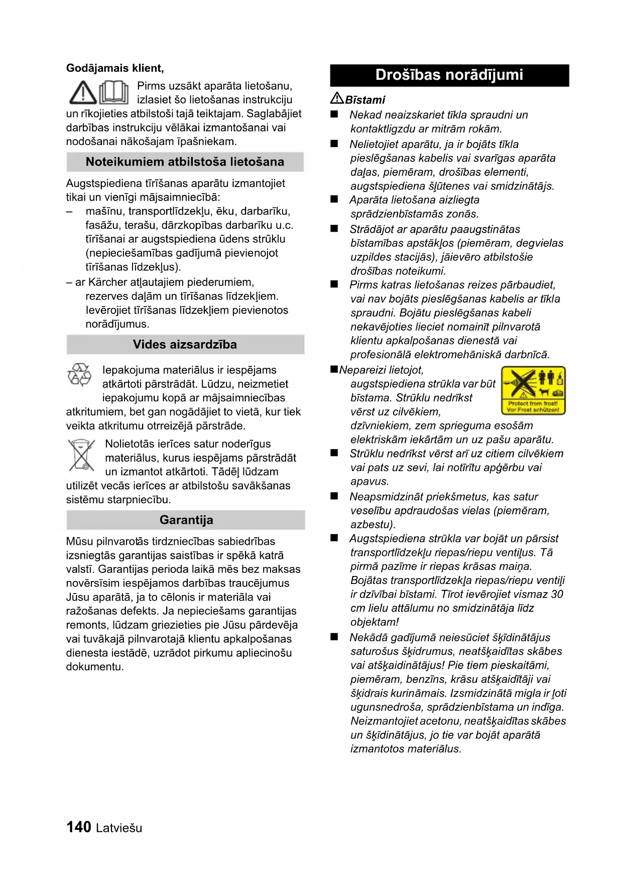 EMÜ) 2000/14/EÜ Kohaldatud ühtlustatud standardid: EN 60335–1 EN 60335–2–79 EN 55014–1: 2000 + A1: 2001 + A2: 2002 EN 55014–2: 1997 + A1: 2001 EN 61000–3–2: 2000 + A2: 2005 EN 61000–3–3: 1995 + A1: 2001 Järgitud vastavushindamise protseduur: Lisa V Helivõimsuse tase dB(A) Mõõdetud: 85 dB(A) Garanteeritud: 87 dB(A)140 Latviešu Godājamais klient, Pirms uzsākt aparāta lietošanu, izlasiet šo lietošanas instrukciju un rīkojieties atbilstoši tajā teiktajam. Saglabājiet darbības instrukciju vēlākai izmantošanai vai nodošanai nākošajam īpašniekam. Augstspiediena tīrīšanas aparātu izmantojiet tikai un vienīgi mājsaimniecībā: –mašīnu, transportlīdzekļu, ēku, darbarīku, fasāžu, terašu, dārzkopības darbarīku u.c. tīrīšanai ar augstspiediena ūdens strūklu (nepieciešamības gadījumā pievienojot tīrīšanas līdzekļus). – ar Kärcher atļautajiem piederumiem, rezerves daļām un tīrīšanas līdzek ļiem. Ievērojiet tīrīšanas līdzekļiem pievienotos norādījumus. Iepakojuma materiālus ir iespējams atkārtoti pārstrādāt. Lūdzu, neizmetiet iepakojumu kopā ar mājsaimniecības atkritumiem, bet gan nogādājiet to vietā, kur tiek veikta atkritumu otrreizējā pārstrāde. Nolietotās ierīces satur noderīgus materiālus, kurus iespējams pārstrādāt un izmantot atkārtoti. Tādēļ lūdzam utilizēt vecās ierīces ar atbilstošu savākšanas sistēmu starpniecību. Mūsu pilnvarot ās tirdzniecības sabiedrības izsniegtās garantijas saistības ir spēkā katrā valstī. Garantijas perioda laikā mēs bez maksas novērsīsim iespējamos darbības traucējumus Jūsu aparātā, ja to cēlonis ir materiāla vai ražošanas defekts. Ja nepieciešams garantijas remonts, lūdzam griezieties pie Jūsu pārdevēja vai tuvākajā pilnvarotajā klientu apkalpošanas dienesta iestādē, uzrādot pirkumu apliecinošu dokumentu. Bīstami ! Nekad neaizskariet tīkla spraudni un kontaktligzdu ar mitrām rokām. ! Nelietojiet aparātu, ja ir bojāts tīkla pieslēgšanas kabelis vai svarīgas aparāta daļas, piemēram, drošības elementi, augstspiediena šļūtenes vai smidzinātājs. ! Aparāta lietošana aizliegta sprādzienbīstamās zonās. ! Strādājot ar aparātu paaugstinātas bīstamības apstākļos (piemēram, degvielas uzpildes stacijās), jāievēro atbilstošie drošības noteikumi. ! Pirms katras lietošanas reizes pārbaudiet, vai nav bojāts pieslēgšanas kabelis ar tīkla spraudni. Bojātu pieslēgšanas kabeli nekavējoties lieciet nomainīt pilnvarotā klientu apkalpošanas dienestā vai profesionālā elektromehāniskā darbnīcā. ! Nepareizi lietojot, augstspiediena strūkla var būt bīstama. Strūklu nedrīkst vērst uz cilvēkiem, dzīvniekiem, zem sprieguma esošām elektriskām iekārtām un uz pašu aparātu. ! Strūklu nedrīkst vērst arī uz citiem cilvēkiem vai pats uz sevi, lai notīrītu apģērbu vai apavus. ! Neapsmidzināt priekšmetus, kas satur veselību apdraudošas vielas (piemēram, azbestu). ! Augstspiediena strūkla var bojāt un pārsist transportlīdzekļu riepas/riepu ventiļus. Tā pirmā pazīme ir riepas krāsas maiņa. Bojātas transportlīdzekļa riepas/riepu ventiļi ir dzīvībai bīstami. Tīrot ievērojiet vismaz 30 cm lielu attālumu no smidzinātāja līdz objektam! ! Nekādā gadījumā neiesūciet šķīdinātājus saturošus šķidrumus, neatšķaidītas skābes vai atšķaidinātājus! Pie tiem pieskaitāmi, piemēram, benzīns, krāsu atšķaidītāji vai šķidrais kurināmais. Izsmidzinātā migla ir ļoti ugunsnedroša, sprādzienbīstama un indīga. Neizmantojiet acetonu, neatšķaidītas skābes un šķīdinātājus, jo tie var bojāt aparātā izmantotos materiālus. Noteikumiem atbilstoša lietošana Vides aizsardzība Garantija Drošības norādījumiLatviešu 141