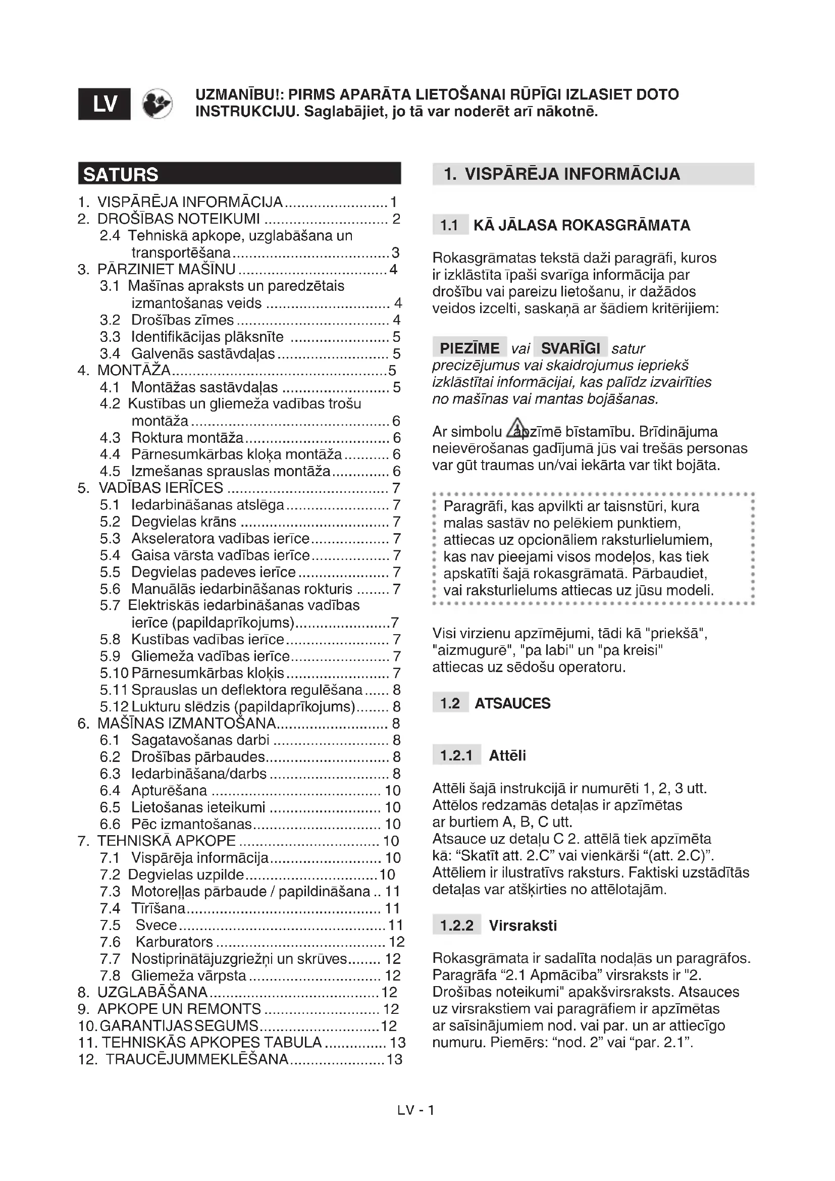 Rokasgrāmata ir sadalīta nodaļās un paragrāfos. Paragrāfa “2.1 Apmācība” virsraksts ir "2. Drošības noteikumi" apakšvirsraksts. Atsauces uz virsrakstiem vai paragrāem ir apzīmētas ar saīsinājumiem nod. vai par. un ar attiecīgo numuru. Piemērs: “nod. 2” vai “par. 2.1”. UZMANĪBU!: PIRMS APARĀTA LIETOŠANAI RŪPĪGI IZLASIET DOTO INSTRUKCIJU. Saglabājiet, jo tā var noderēt arī nākotnē.