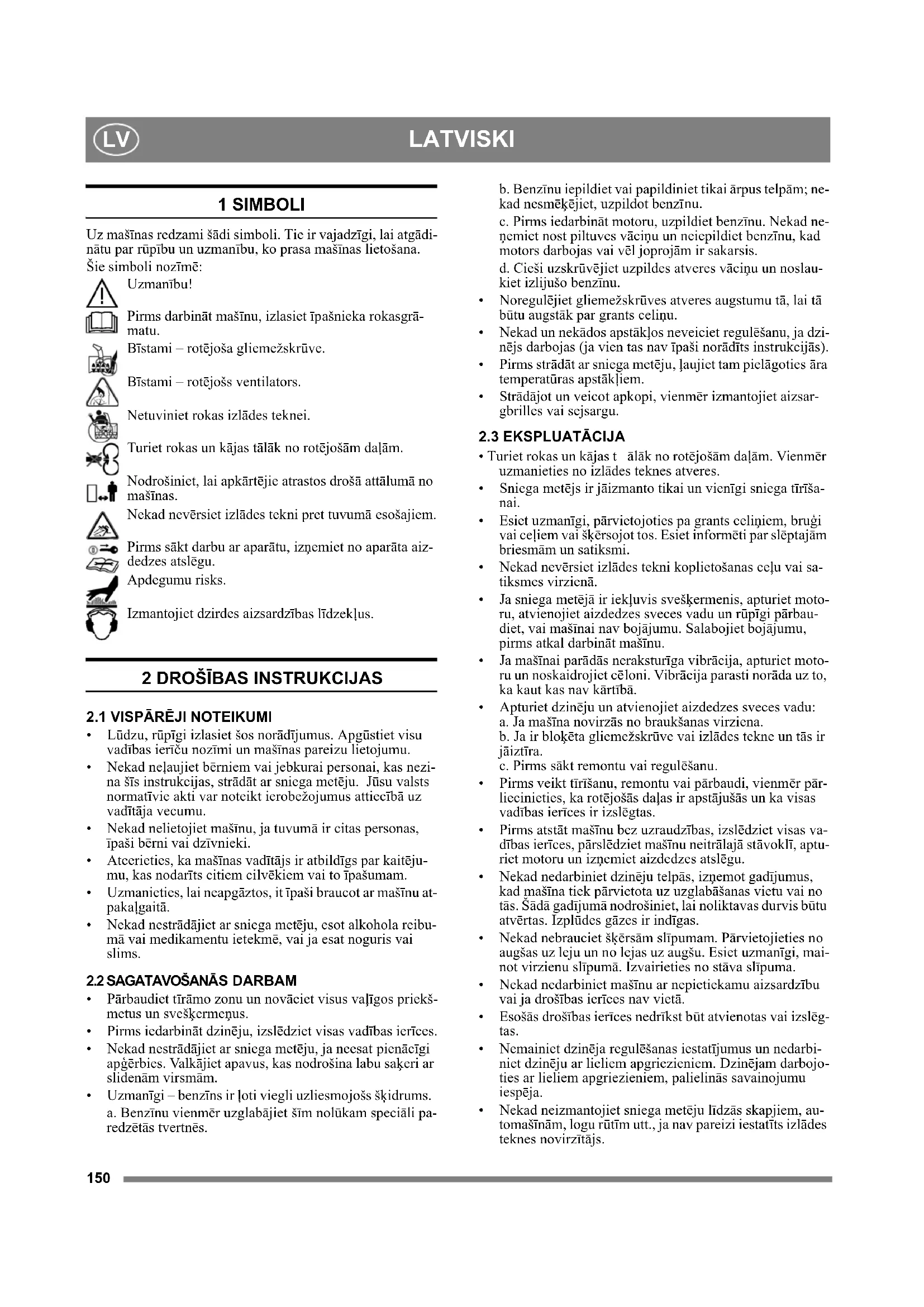 1 SIMBOLI Uz mašīnas redzami šādi simboli. Tie ir vajadzīgi, lai atgādi- nātu par rūpību un uzmanību, ko prasa mašīnas lietošana. Šie simboli nozīmē: Uzmanību! Pirms darbināt mašīnu, izlasiet īpašnieka rokasgrā- matu. Bīstami – rotējoša gliemežskrūve. Bīstami – rotējošs ventilators. Netuviniet rokas izlādes teknei. Turiet rokas un kājas tālāk no rotējošām daļām. Nodrošiniet, lai apkārtējie atrastos drošā attālumā no mašīnas. Nekad nevērsiet izlādes tekni pret tuvumā esošajiem. Pirms sākt darbu ar aparātu, izņemiet no aparāta aiz- dedzes atslēgu. Apdegumu risks. Izmantojiet dzirdes aizsardz ības līdzekļus.