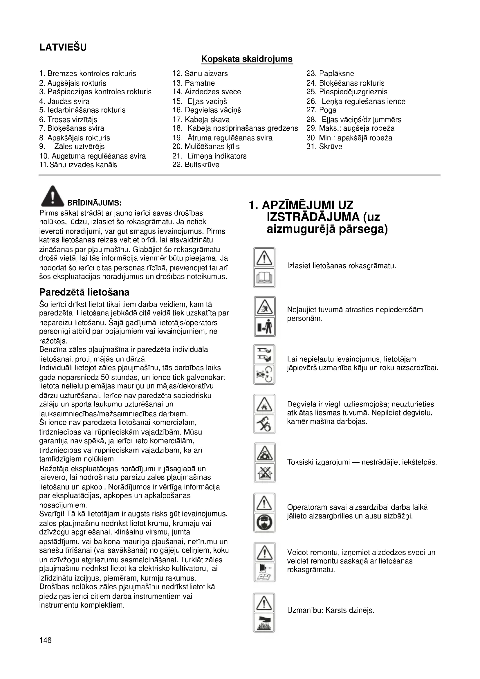 Izlasiet lietošanas rokasgrāmatu. Neļaujiet tuvumā atrasties nepiederošām personām. Lai nepieļautu ievainojumus, lietotājam jāpievērš uzmanība kāju un roku aizsardzībai. Degviela ir viegli uzliesmojoša; neuzturieties atklātas liesmas tuvumā. Nepildiet degvielu, kamēr mašīna darbojas. Toksiski izgarojumi — nestrādājiet iekštelpās. Operatoram savai aizsardzībai darba laikā jālieto aizsargbrilles un ausu aizbāžņi. Veicot remontu, izņemiet aizdedzes sveci un veiciet remontu saskaņā ar lietošanas rokasgrāmatu. Uzmanību: Karsts dzinējs.147