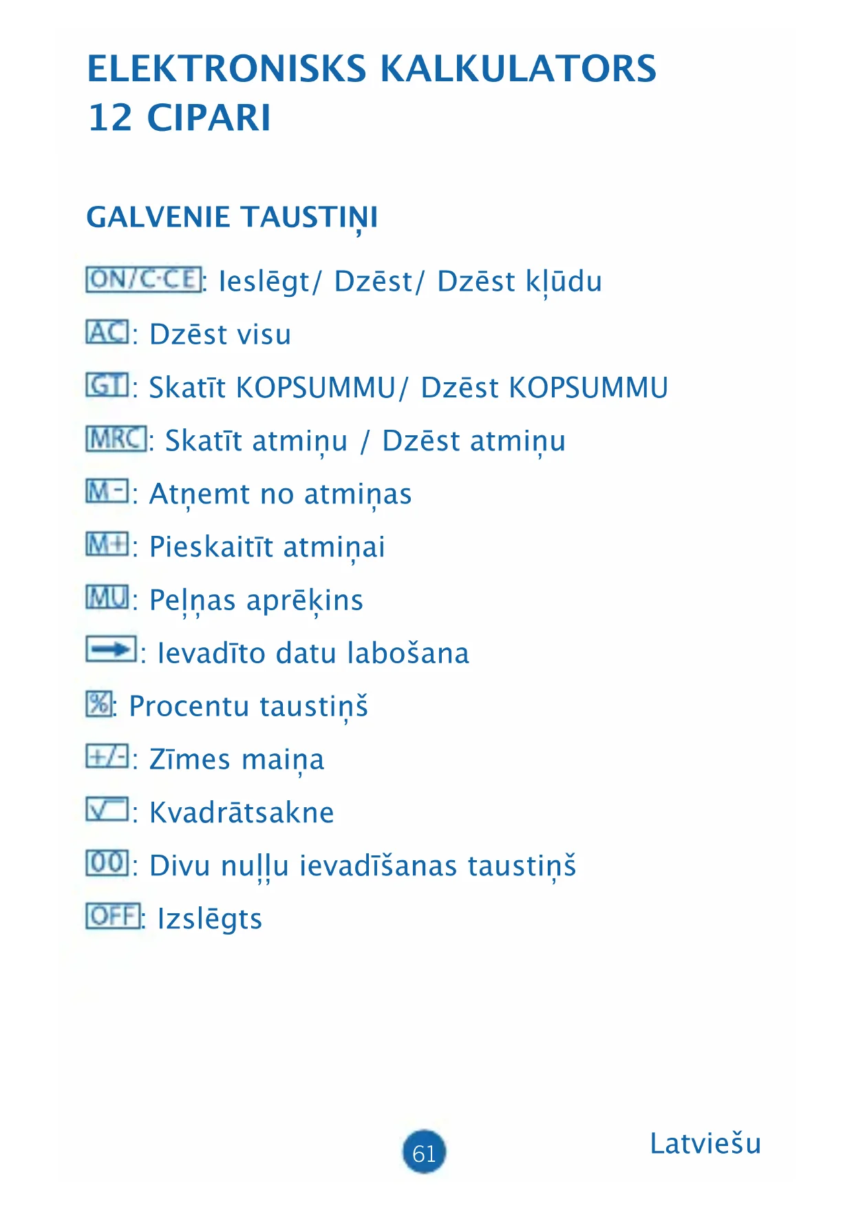 : Ieslēgt/ Dzēst/ Dzēst kļūdu : Dzēst visu : Skatīt KOPSUMMU/ Dzēst KOPSUMMU : Skatīt atmiņu / Dzēst atmiņu : Atņemt no atmiņas : Pieskaitīt atmiņai : Peļņas aprēķins : Ievadīto datu labošana : Procentu taustiņš : Zīmes maiņa : Kvadrātsakne : Divu nuļļu ievadīšanas taustiņš : Izslēgts Latviešu62 SELEKTORU APRAKSTS: