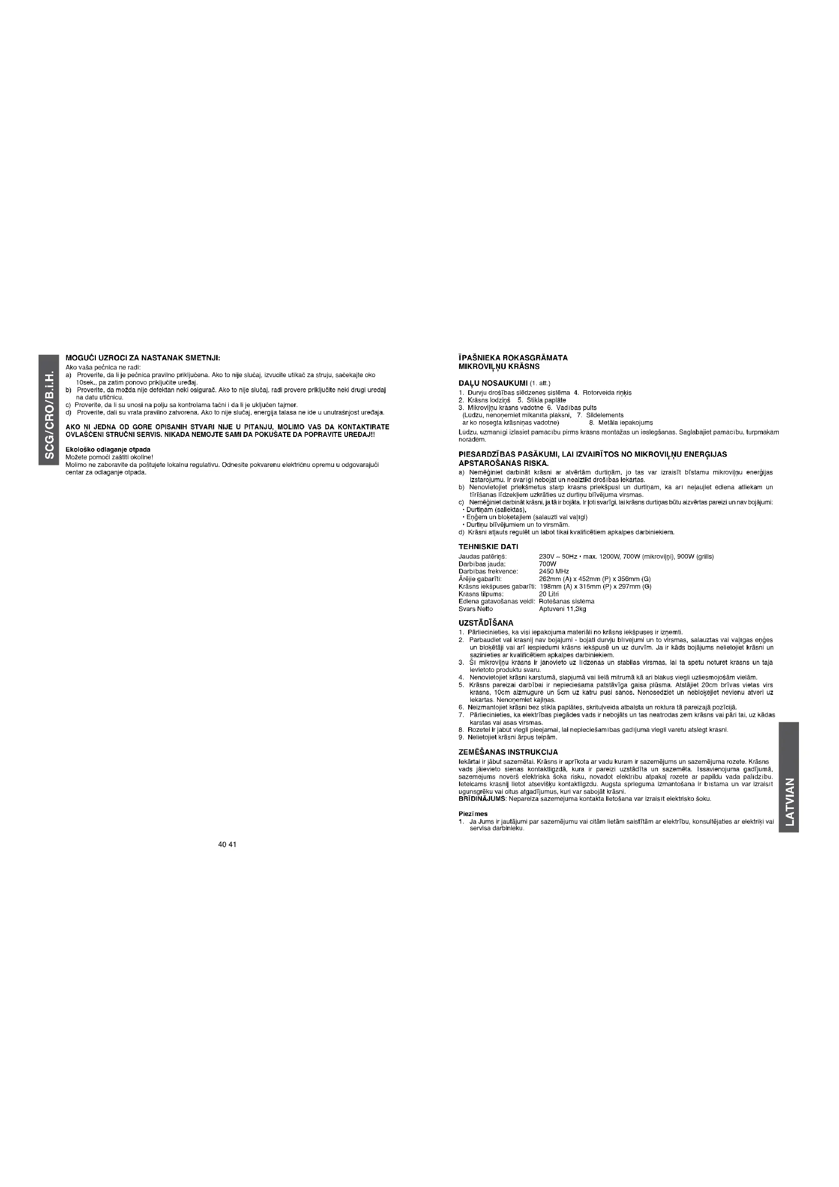 - Durtiņu blīvējumiem un to virsmām. d) Krāsni atļauts regulēt un labot tikai kvalicētiem apkalpes darbiniekiem. TeHniSKie DATi Jaudas patēriņš: 230V ~ 50Hz • max. 1200W, 700W (mikroviļņi), 900W (grills) Darbības jauda: 700W Darbības frekvence: 2450 MHz Ārējie gabarīti: 262mm (A) x 452mm (P) x 356mm (G) Krāsns iekšpuses gabarīti: 198mm (A) x 315mm (P) x 297mm (G) Krāsns tilpums: 20 Litri Ediena gatavošanas veidi: Rotēšanas sistēma Svars Netto Aptuveni 11,3kg