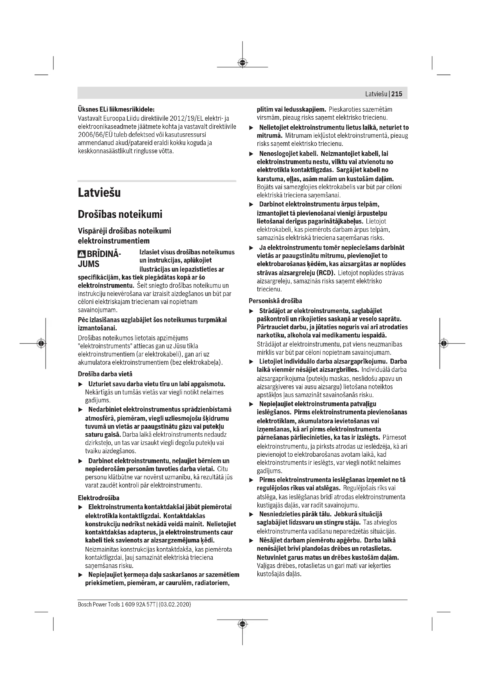 Šajā pamācībā norādītais vibrācijas līmenis un instrumenta radītā trokšņa vērtība ir izmērīta atbilstoši standartā noteiktajai procedūrai un var tikt izmantota elektroinstrumentu savstarpējai salīdzināšanai. To var izmantot arī vibrācijas un trokšņa radītās papildu slodzes iepriekšējai novērtēšanai. Šeit norādītais svārstību līmenis un instrumenta radītā trokšņa vērtība ir attiecināma uz elektroinstrumenta galvenajiem pielietojuma veidiem. Ja elektroinstruments tiek lietots netipiskiem mērķiem, kopā ar netipiskiem darbinstrumentiem vai nav vajadzīgajā veidā apkalpots, tā svārstību līmenis un radītā trokšņa vērtība var atšķirties no šeit norādītajām vērtībām. Tas var ievērojami palielināt svārstību un trokšņa radīto papildu slodzi kopējam darba laika posmam. Lai precīzi izvērtētu svārstību un trokšņa radīto papildu slodzi zināmam darba laika posmam, jāņem vērā arī laiks, kad elektroinstruments ir izslēgts vai arī darbojas, taču faktiski netiek izmantots paredzētā darba veikšanai. Tas var ievērojami samazināt svārstību un trokšņa radīto papildu slodzi kopējam darba laika posmam. Veiciet papildu pasākumus, lai pasargātu strādājošo personu no vibrācijas kaitīgās iedarbības, piemēram, savlaicīgi veiciet elektroinstrumenta un darbinstrumentu apkalpošanu, uzturiet rokas siltas un pareizi plānojiet darbu. Montāža u Pirms elektroinstrumenta apkopes vai apkalpošanas izvelciet tā elektrokabeļa kontaktdakšu no barojošā elektrotīkla kontaktligzdas. Frēzes iestiprināšana (skatīt attēluA) u Iestiprinot un nomainot frēzēšanas darbinstrumentus, ieteicams uzvilkt aizsargcimdus. Tirdzniecības vietās var iegādāties visdažādākās kvalitātes un izpildījuma frēzes. Frēzes no ātrgriezējtērauda (HSS) ir piemērotas mīkstu materiālu, piemēram, mīksta koka un plastmasas apstrādei. Frēzes ar cietmetāla griezējšķautnēm (HM) ir īpaši paredzētas cietu un abrazīvu materiālu, piemēram, cieta koka un alumīnija apstrādei. 1 609 92A 57T | (03.02.2020) Bosch Power ToolsLatviešu | 219 Oriģinālās frēzes no Bosch plašā piederumu klāsta var iegādāties specializētajās tirdzniecības vietās. Iestipriniet tikai nebojātas un tīras frēzes. – Līdz galam pagrieziet darbvārpstas fiksēšanas sviru (6) pretēji pulksteņa rādītāju kustības virzienam (➊). Vajadzības gadījumā ar roku pagrieziet darbvārpstu, līdz tā fiksējas ar skaidri sadzirdamu troksni. – Atskrūvējiet virsuzgriezni(4) ar vaļējā tipa uzgriežņu atslēgu (31) (atslēgas platums19mm), griežot to pulksteņa rādītāju kustības virzienā (➋). – Iebīdiet frēzes kātu spīļaptverē. Frēzes kātam jāievietojas spīļaptverē vismaz līdz marķējumam. – Stingri pievelciet virsuzgriezni(4) ar vaļējā tipa uzgriežņu atslēgu (31) (atslēgas platums19mm), griežot to pretēji pulksteņa rādītāju kustības virzienam. Pilnīgi iebīdiet darbvārpstas fiksēšanas sviru(6). u Ja nav iestiprināta kopējošā vadotne, neizmantojiet frēzi, kuras diametrs ir lielāks par50mm. Šādas frēzes neiziet caur atvērumu pamatnē. u Nepievelciet spīļaptveres virsuzgriezni, ja spīļaptverē nav ievietots frēzēšanas darbinstrumenta kāts. Pretējā gadījumā spīļaptvere var tikt bojāta. Putekļu un skaidu uzsūkšana Dažu materiālu, piemēram, svinu saturošu krāsu, dažu koksnes šķirņu, minerālu un metālu putekļi var būt kaitīgi veselībai. Pieskaršanās šādiem putekļiem vai to ieelpošana var izraisīt alerģiskas reakcijas vai elpošanas ceļu saslimšanu elektroinstrumenta lietotājam vai darba vietai tuvumā esošajām personām. Atsevišķu materiālu putekļi, piemēram, putekļi, kas rodas, zāģējot ozola vai dižskābarža koksni, var izraisīt vēzi, īpaši tad, ja koksne iepriekš ir tikusi ķīmiski apstrādāta (ar hromātu vai koksnes aizsardzības līdzekļiem). Azbestu saturošus materiālus drīkst apstrādāt vienīgi personas ar īpašām profesionālām iemaņām. – Pielietojiet apstrādājamajam materiālam vispiemērotāko putekļu uzsūkšanas metodi. – Darba vietai jābūt labi ventilējamai. – Darba laikā ieteicams izmantot masku elpošanas ceļu aizsardzībai ar filtrēšanas klasi P2. Ievērojiet jūsu valstī spēkā esošos priekšrakstus, kas attiecas uz apstrādājamo materiālu. u Nepieļaujiet putekļu uzkrāšanos darba vietā. Putekļi var viegli aizdegties. Putekļu nosūkšanas ierīces pievienošana (skatītattēluB) Uzbīdiet nosūkšanas šļūteni (Ø 35 mm)(32) (papildpiederums) uz samontētā nosūkšanas adaptera. Savienojiet nosūkšanas šļūteni(32) ar vakuumsūcēju (papildpiederums). Elektroinstrumentu var tieši pievienot Bosch universālā vakuumsūcēja papildu kontaktligzdai, caur kuru tiek realizēta tālvadība. Šis vakuumsūcējs ir apgādāts ar tālvadības funkciju, tāpēc, ieslēdzot elektroinstrumentu, automātiski ieslēdzas arī vakuumsūcējs. Vakuumsūcējam jābūt piemērotam, lai sūktu apstrādājamā materiāla putekļus. Veselībai īpaši kaitīgus, kancerogēnus vai saususputekļus savāciet ar speciālu vakuumsūcēju. Ekspluatācija u Pievadiet elektroinstrumentam pareizu spriegumu! Elektrobarošanas avota spriegumam jāatbilst vērtībai, kas norādīta uz elektroinstrumenta marķējuma plāksnītes. Elektroinstrumenti, kas paredzēti 230V spriegumam, var darboties arī no 220V elektrotīkla. Ekspluatācijas sākšana GOF1250LCE: pēc elektrotīkla sprieguma pievadīšanas pastāvīgi iedegas apgaismojošais gredzens (3), kas nodrošina apstrādājamā priekšmeta virsmas apgaismošanu. Ielieciet bateriju (skatīt „Baterijas nomaiņa (GOF1250LCE) (skatītattēluM)“, Lappuse222). Dažiem izpildījumiem baterija jau ir ievietota. Lai aktivizētu bateriju, noņemiet no tās izolējošo sloksnīti. Nospiežot taustiņu(17), izvēlieties vajadzīgo mērvi