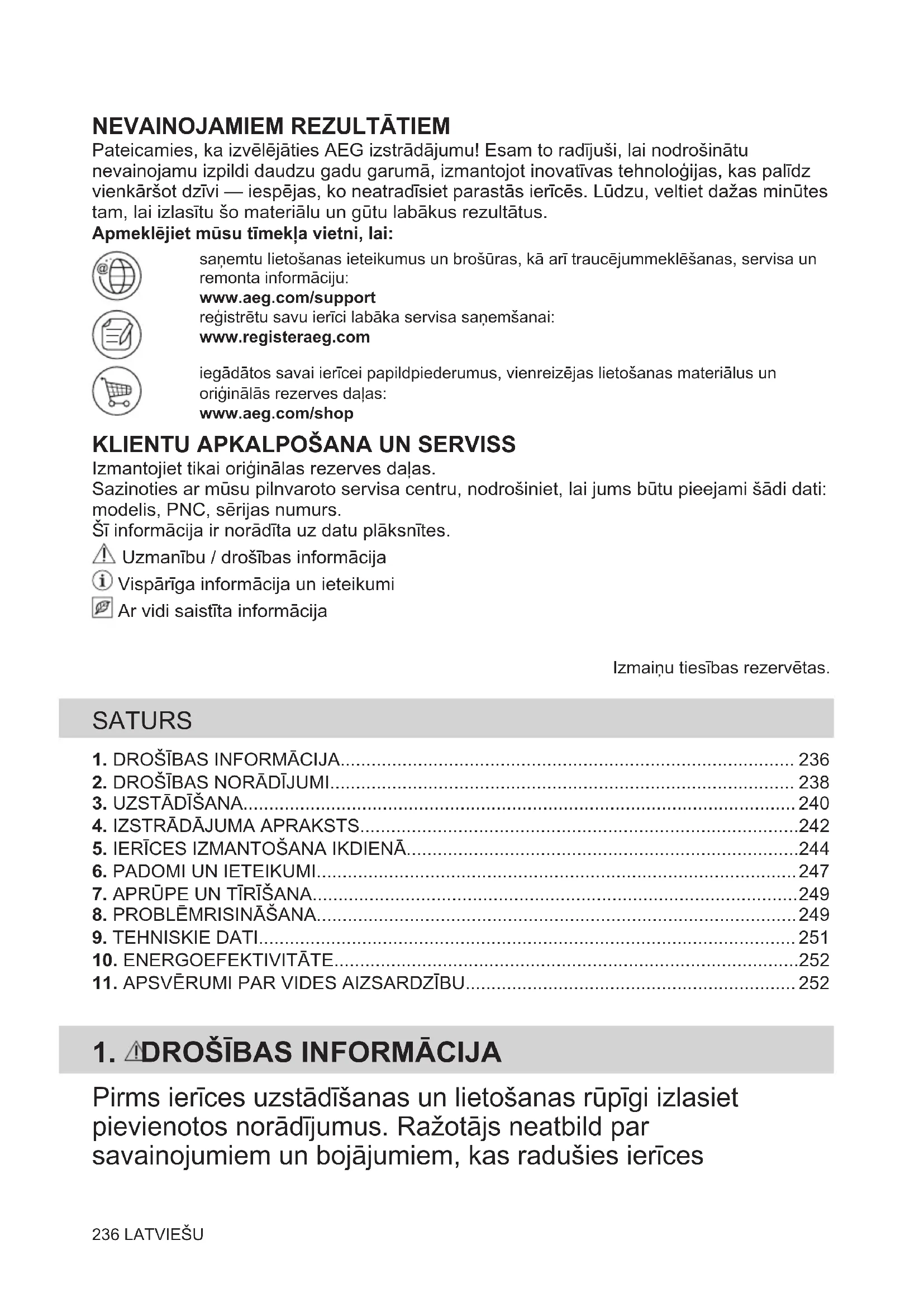 Pateicamies, ka izvēlējāties AEG izstrādājumu! Esam to radījuši, lai nodrošinātu nevainojamu izpildi daudzu gadu garumā, izmantojot inovatīvas tehnoloģijas, kas palīdz vienkāršot dzīvi — iespējas, ko neatradīsiet parastās ierīcēs. Lūdzu, veltiet dažas minūtes tam, lai izlasītu šo materiālu un gūtu labākus rezultātus. Apmeklējiet mūsu tīmekļa vietni, lai:saņemtu lietošanas ieteikumus un brošūras, kā arī traucējummeklēšanas, servisa unremonta informāciju:www.aeg.com/supportreģistrētu savu ierīci labāka servisa saņemšanai:www.registeraeg.comiegādātos savai ierīcei papildpiederumus, vienreizējas lietošanas materiālus unoriģinālās rezerves daļas:www.aeg.com/shop