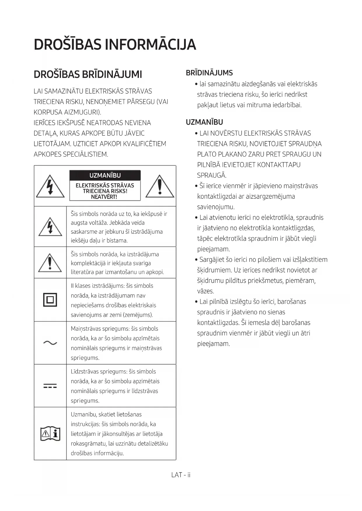 - Lai pilnībā izslēgtu šo ierīci, barošanas spraudnis ir jāatvieno no sienas kontaktligzdas. Šī iemesla dēļ barošanas spraudnim vienmēr ir jābūt viegli un ātri pieejamam.LAT - iii PIESARDZĪBAS PASĀKUMI