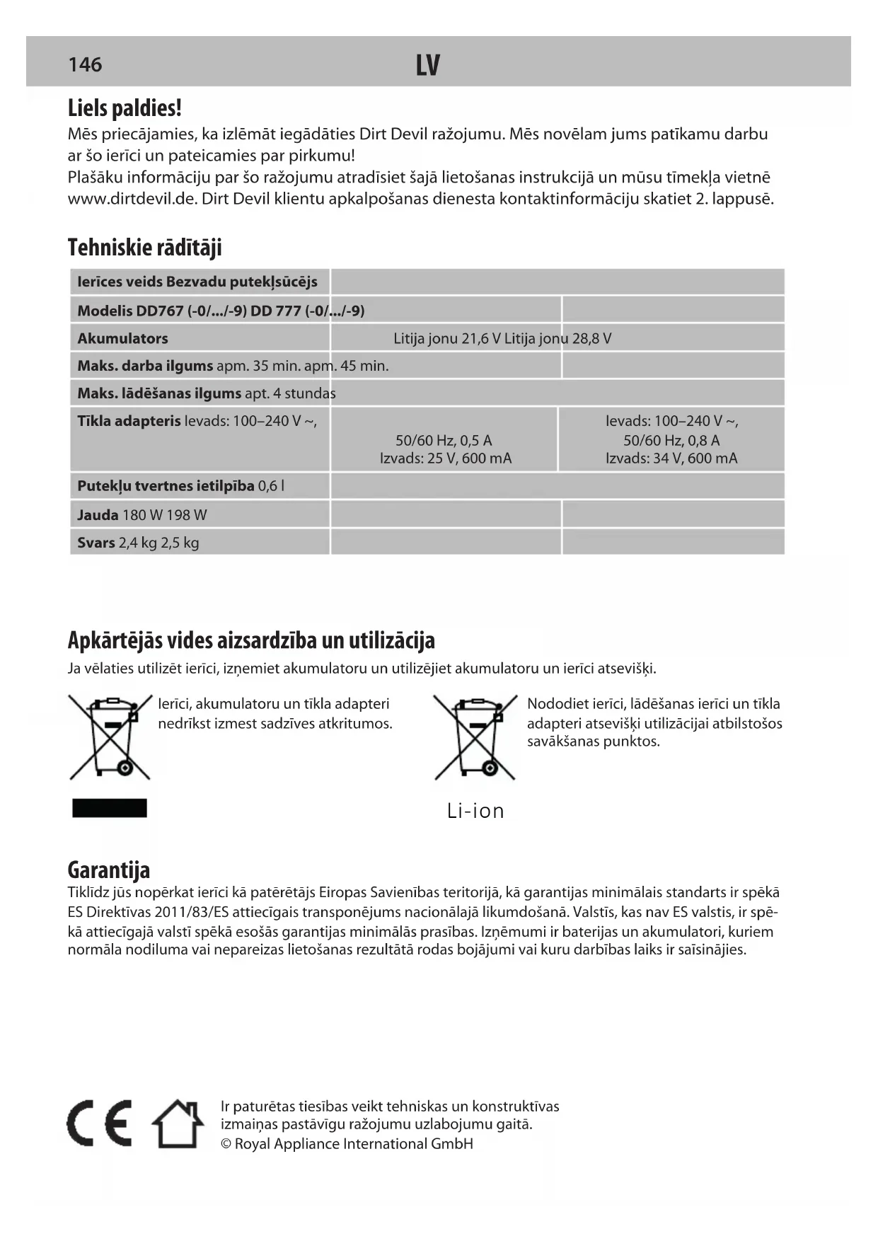 145Ir paturētas tiesības veikt tehniskas un konstruktīvas izmaiņas pastāvīgu ražojumu uzlabojumu gaitā.© Royal Appliance International GmbH Liels paldies! Mēs priecājamies, ka izlēmāt iegādāties Dirt Devil ražojumu. Mēs novēlam jums patīkamu darbu ar šo ierīci un pateicamies par pirkumu! Plašāku informāciju par šo ražojumu atradīsiet šajā lietošanas instrukcijā un mūsu tīmekļa vietnē www.dirtdevil.de. Dirt Devil klientu apkalpošanas dienesta kontaktinformāciju skatiet 2.lappusē. Tehniskie rādītāji Ierīces veids Bezvadu putekļsūcējsModelis DD767 (-0/.../-9) DD 777 (-0/.../-9)AkumulatorsLitija jonu 21,6 V Litija jonu 28,8 VMaks. darba ilgums apm. 35 min. apm. 45 min.Maks. lādēšanas ilgums apt. 4 stundasTīkla adapteris Ievads: 100–240 V ~, 50/60 Hz, 0,5 A Izvads: 25 V, 600 mAIevads: 100–240 V ~, 50/60 Hz, 0,8 A Izvads: 34 V, 600 mAPutekļu tvertnes ietilpība 0,6 lJauda 180 W 198 WSvars 2,4 kg 2,5 kg Apkārtējās vides aizsardzība un utilizācija Ja vēlaties utilizēt ierīci, izņemiet akumulatoru un utilizējiet akumulatoru un ierīci atsevišķi.Ierīci, akumulatoru un tīkla adapteri nedrīkst izmest sadzīves atkritumos.Nododiet ierīci, lādēšanas ierīci un tīkla adapteri atsevišķi utilizācijai atbilstošos savākšanas punktos. Garantija Tiklīdz jūs nopērkat ierīci kā patērētājs Eiropas Savienības teritorijā, kā garantijas minimālais standarts ir spēkā ES Direktīvas 2011/83/ES attiecīgais transponējums nacionālajā likumdošanā. Valstīs, kas nav ES valstis, ir spē-kā attiecīgajā valstī spēkā esošās garantijas minimālās prasības. Izņēmumi ir baterijas un akumulatori, kuriem normāla nodiluma vai nepareizas lietošanas rezultātā rodas bojājumi vai kuru darbības laiks ir saīsinājies. Li-ion