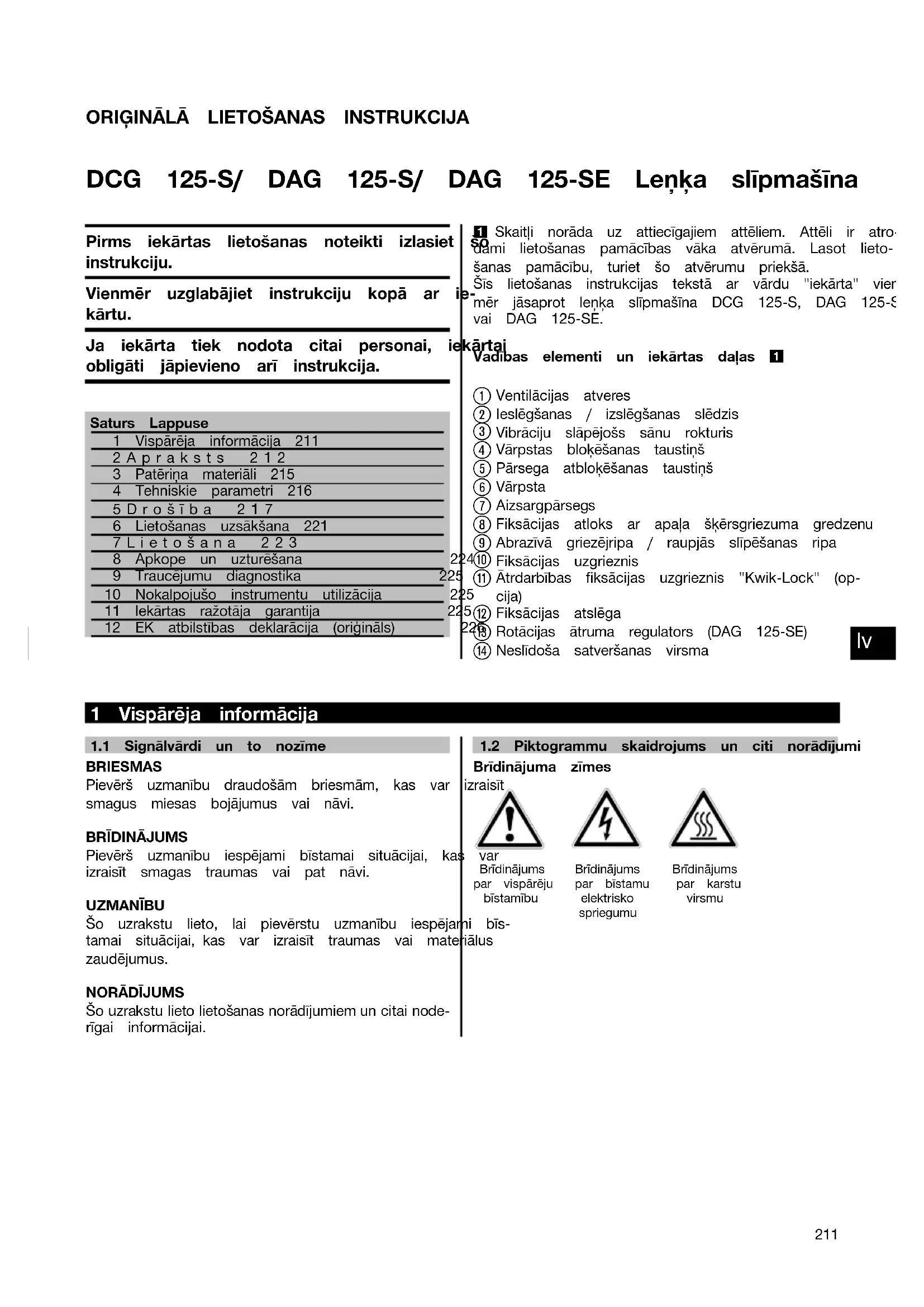 Printed: 20.11.2013 | Doc-Nr: PUB / 5069490 / 000 / 02ORIĢINĀLĀ LIETOŠANAS INSTRUKCIJA DCG 125‑S/ DAG 125‑S/ DAG 125‑SE Leņķa slīpmašīna Pirms iekārtas lietošanas noteikti izlasiet šo instrukciju. Vienmēr uzglabājiet instrukciju kopā ar ie- kārtu. Ja iekārta tiek nodota citai personai, iekārtai obligāti jāpievieno arī instrukcija. Saturs Lappuse1 Vispārēja informācija 2112Apraksts 2123 Patēriņa materiāli 2154 Tehniskie parametri 2165Drošība 2176 Lietošanas uzsākšana 2217Lietošana 2238 Apkope un uzturēšana 2249 Traucējumu diagnostika 22510 Nokalpojušo instrumentu utilizācija 22511 Iekārtas ražotāja garantija 22512 EK atbilstības deklarācija (oriģināls) 2261 Skaitļi norāda uz attiecīgajiem attēliem. Attēli ir atro-dami lietošanas pamācības vāka atvērumā. Lasot lieto-šanas pamācību, turiet šo atvērumu priekšā.Šīs lietošanas instrukcijas tekstā ar vārdu "iekārta" vien-mēr jāsaprot leņķa slīpmašīna DCG 125‑S, DAG 125‑Svai DAG 125‑SE.Vadības elementi un iekārtas daļas 1 Ventilācijas atveres Ieslēgšanas / izslēgšanas slēdzis Vibrāciju slāpējošs sānu rokturis Vārpstas bloķēšanas taustiņš Pārsega atbloķēšanas taustiņš Vārpsta Aizsargpārsegs Fiksācijas atloks ar apaļa šķērsgriezuma gredzenu Abrazīvā griezējripa / raupjās slīpēšanas ripa Fiksācijas uzgrieznis Ātrdarbības fiksācijas uzgrieznis "Kwik‑Lock" (op-cija) Fiksācijas atslēga Rotācijas ātruma regulators (DAG 125‑SE) Neslīdoša satveršanas virsma 1 Vispārēja informācija 1.1 Signālvārdi un to nozīmeBRIESMASPievērš uzmanību draudošām briesmām, kas var izraisītsmagus miesas bojājumus vai nāvi.BRĪDINĀJUMSPievērš uzmanību iespējami bīstamai situācijai, kas varizraisīt smagas traumas vai pat nāvi.UZMANĪBUŠo uzrakstu lieto, lai pievērstu uzmanību iespējami bīs-tamai situācijai, kas var izraisīt traumas vai materiāluszaudējumus.NORĀDĪJUMS Šo uzrakstu lieto lietošanas norādījumiem un citai node- rīgai informācijai.1.2 Piktogrammu skaidrojums un citi norādījumiBrīdinājuma zīmesBrīdinājumspar vispārējubīstamībuBrīdinājumspar bīstamuelektriskospriegumuBrīdinājumspar karstuvirsmu