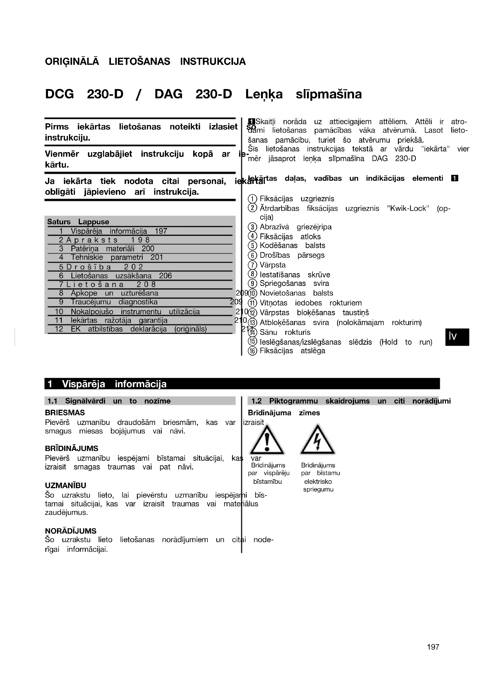 Printed: 20.11.2013 | Doc-Nr: PUB / 5069494 / 000 / 02ORIĢINĀLĀ LIETOŠANAS INSTRUKCIJA DCG 230‑D / DAG 230‑D Leņķa slīpmašīna Pirms iekārtas lietošanas noteikti izlasiet šo instrukciju. Vienmēr uzglabājiet instrukciju kopā ar ie- kārtu. Ja iekārta tiek nodota citai personai, iekārtai obligāti jāpievieno arī instrukcija. Saturs Lappuse1 Vispārēja informācija 1972Apraksts 1983 Patēriņa materiāli 2004 Tehniskie parametri 2015Drošība 2026 Lietošanas uzsākšana 2067Lietošana 2088 Apkope un uzturēšana 2099 Traucējumu diagnostika 20910 Nokalpojušo instrumentu utilizācija 21011 Iekārtas ražotāja garantija 21012 EK atbilstības deklarācija (oriģināls) 2111 Skaitļi norāda uz attiecīgajiem attēliem. Attēli ir atro-dami lietošanas pamācības vāka atvērumā. Lasot lieto-šanas pamācību, turiet šo atvērumu priekšā.Šīs lietošanas instrukcijas tekstā ar vārdu "iekārta" vien-mēr jāsaprot leņķa slīpmašīna DAG 230‑DIekārtas daļas, vadības un indikācijas elementi 1 Fiksācijas uzgrieznis Ātrdarbības fiksācijas uzgrieznis "Kwik-Lock" (op-cija) Abrazīvā griezējripa Fiksācijas atloks Kodēšanas balsts Drošības pārsegs Vārpsta Iestatīšanas skrūve Spriegošanas svira Novietošanas balsts Vītņotas iedobes rokturiem Vārpstas bloķēšanas taustiņš Atbloķēšanas svira (nolokāmajam rokturim) Sānu rokturis Ieslēgšanas/izslēgšanas slēdzis (Hold to run) Fiksācijas atslēga 1 Vispārēja informācija 1.1 Signālvārdi un to nozīmeBRIESMASPievērš uzmanību draudošām briesmām, kas var izraisītsmagus miesas bojājumus vai nāvi.BRĪDINĀJUMSPievērš uzmanību iespējami bīstamai situācijai, kas varizraisīt smagas traumas vai pat nāvi.UZMANĪBUŠo uzrakstu lieto, lai pievērstu uzmanību iespējami bīs-tamai situācijai, kas var izraisīt traumas vai materiāluszaudējumus.NORĀDĪJUMSŠo uzrakstu lieto lietošanas norādījumiem un citai node-rīgai informācijai.1.2 Piktogrammu skaidrojums un citi norādījumiBrīdinājuma zīmesBrīdinājumspar vispārējubīstamībuBrīdinājumspar bīstamuelektriskospriegumu
