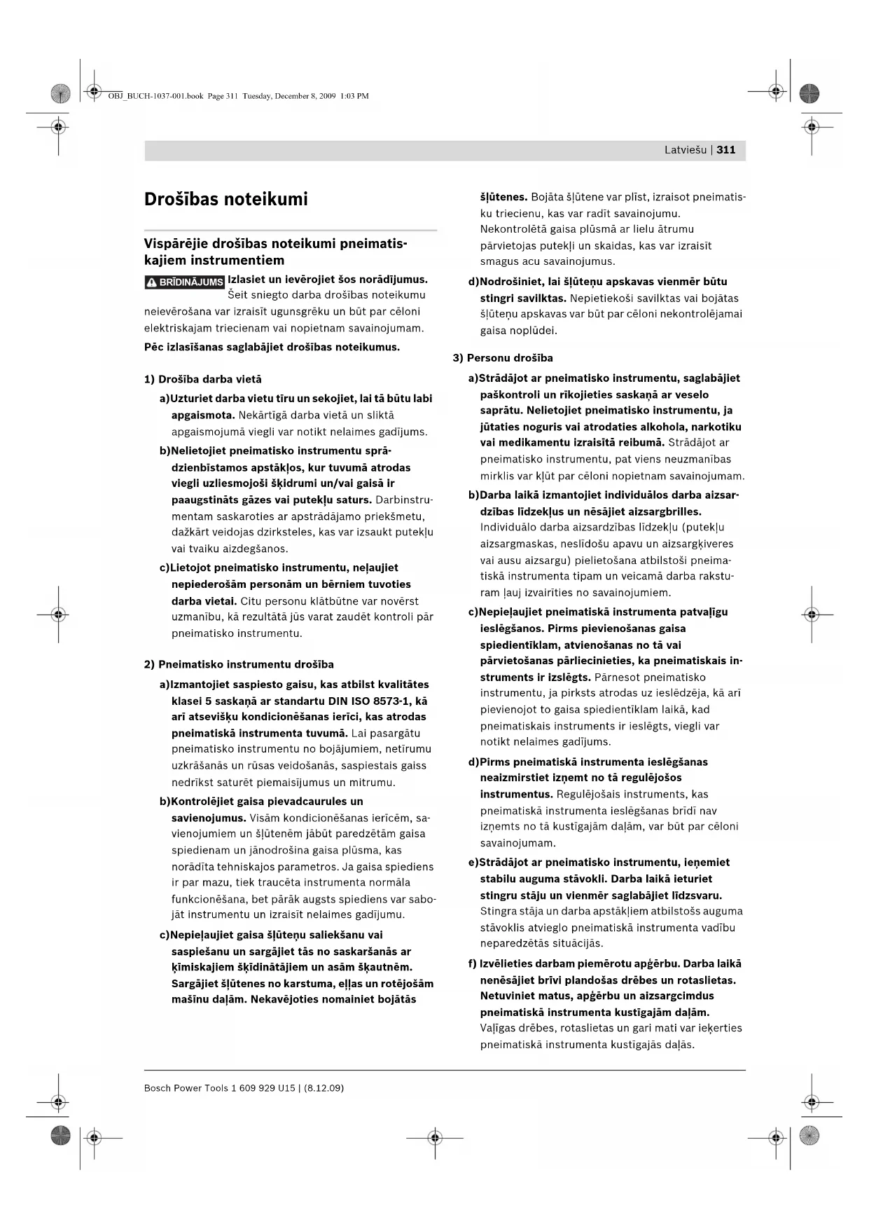 OBJ_BUCH-1037-001.book Page 311 Tuesday, December 8, 2009 1:03 PM1 609 929 U15 | (8.12.09) Bosch Power Tools 312 | Latviešu g)Ja pneimatiskā instrumenta konstrukcija ļauj tam pievienot ārējo putekļu uzsūkšanas vai savākšanas/uzkrāšanas ierīci, sekojiet, lai tā būtu pievienota un pareizi darbotos. Pielietojot minētās ierīces, samazinās putekļu kaitīgā ietekme uz lietotāja veselību. h)Tieši neieelpojiet izstrādāto gaisu. Nepieļaujiet, lai izstrādātā gaisa plūsma nonāktu acīs. Pneimatisko instrumentu izstrādātais gaiss var saturēt ūdens tvaikus, eļļu un metāla daļas vai kompresora tīrī- šanas līdzekļa paliekas. Šo sastāvdaļu ieelpošana var būt kaitīga veselībai.
