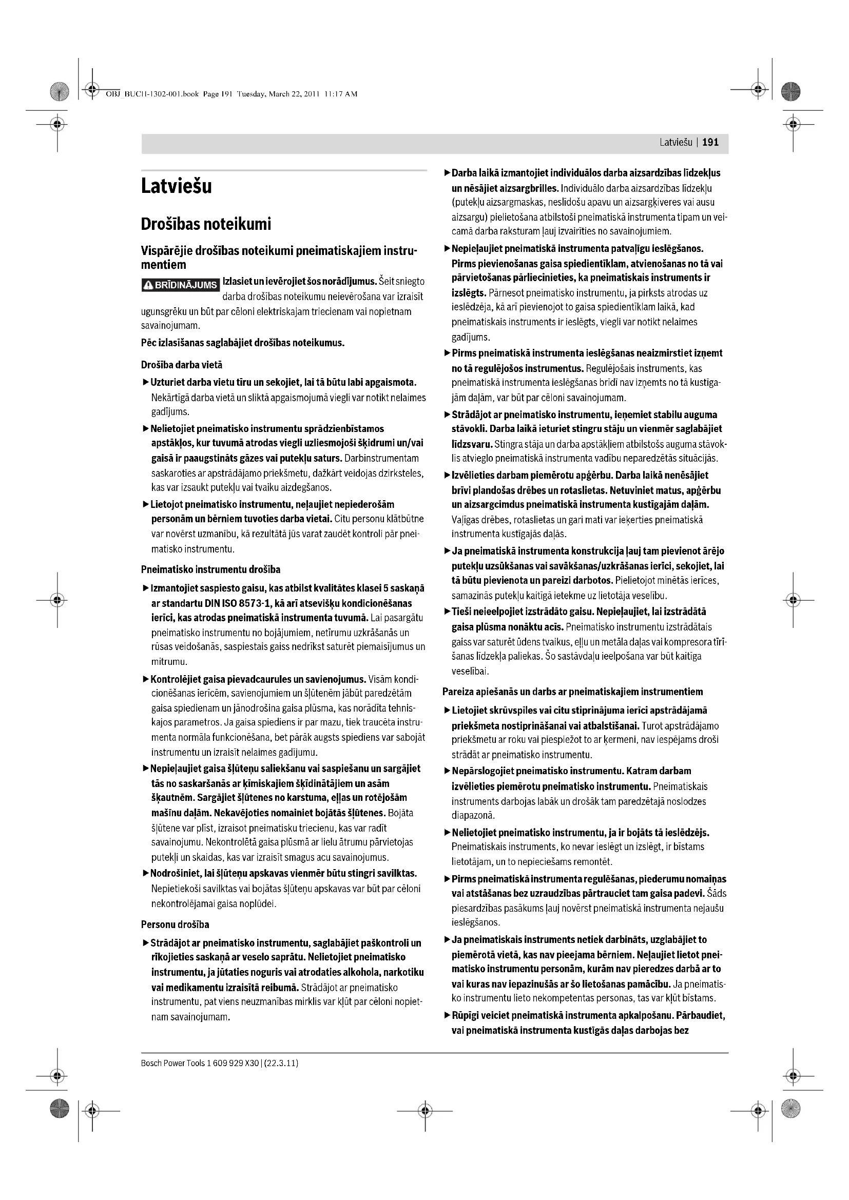 OBJ_BUCH-1302-001.book Page 191 Tuesday, March 22, 2011 11:17 AM1 609 929 X30 | (22.3.11) Bosch Power Tools 192 | Latviešu traucējumiem un nav iespiestas, vai kāda no daļām nav salauzta vai bojāta un vai katra no tām pareizi darbojas un nelabvēlīgi neietekmē pneimatiskā instrumenta funkcionēšanu. Pirms instru- menta lietošanas nodrošiniet, lai bojātās daļas tiktu savlaicīgi nomainītas vai izremontētas. Daudzi nelaimes gadījumi notiek tāpēc, ka pneimatiskais instruments pirms lietošanas nav ticis pienācīgi apkal- pots. fLietojiet vienīgi tādus pneimatiskos instrumentus, papildpiederumus, darbinstrumentus utt., kas atbilst šeit snieg- tajiem noteikumiem. Ņemiet vērā arī konkrētos darba apstākļus un pielietojuma īpatnības. Pneimatisko instrumentu lietošana citiem mērķiem, nekā to ir paredzējusi ražotājfirma, var būt bīstama un novest pie neparedzamām sekām. Apkalpošana fNodrošiniet, lai pneimatiskā instrumenta remontu veiktu kvalificēts personāls, nomaiņai izmantojot oriģinālās rezerves daļas. Tikai tā iespējams saglabāt vajadzīgo darba drošības līmeni, strādājot ar pneimatisko instrumentu. Drošības noteikumi pneimatiskajiem iedzīšanas instrumentiem Nēsājiet aizsargbrilles. fVienmēr uzskatiet, ka pneimatiskajā instrumentā ir iepildīti stiprinājuma elementi. Neuzmanīga apiešanās ar pneimatisko instrumentu var būt par cēloni iedzenamo stiprinājuma elementu pēkšņai izmešanai, kas var izraisīt savainojumu. fDarba laikā turiet pneimatisko instrumentu tā, lai netiktu savainota galva vai pārējās ķermeņa daļas iespējama atsitiena gadījumā, ja tiek pārtraukta enerģijas padeve vai notiek mēģinājums iedzīt stiprinājuma elementu cietā virsmā. fNevērsiet pneimatisko instrumentu pret sevi vai citām tuvumā esošajām personām. Ja nejauši nostrādā triecienmehānisms, var pēkšņi tikt izmests stiprinājuma elements, izraisot savainojumu. fNeiedarbiniet pneimatisko instrumentu, pirms tas nav cieši piespiests stiprināmajam priekšmetam. Ja pneimatiskais instruments nesaskaras ar stiprināmo priekšmetu, stiprinājuma elements var atlekt no stiprinājuma vietas, izraisot pneimatiskā instrumenta atkārtotu palaišanos. Nestrādājiet uz kāpnēm vai sastatnēm, ja ir izvēlēts palaišanas veids „kontaktpalaišana“. Īpaši jāizvairās veikt dažādus darbus, piemēram, aiznaglot kastes vai iežogojumus vai ierīkot transporta stiprinājumus automašīnās vai vagonos, stāvot uz sastatnēm, kāpnēm, redeļveida trepēm un citām līdzīgām konstrukcijām, piemēram, uz jumta līstēm, kā arī pārvietoties no vienas darba vietas uz citu pa šādām konstrukcijām. Izmantojot šo palaišanas veidu, stiprinājuma elements tiek iedzīts ik reizi, kad tiek nospiests palaidējs, pneimatiskajam instrumentam nejauši piespiežoties kādai virsmai. Tas var radīt savainojumus. fStrādājiet piemērotos apstākļos. Iedzenamais stiprinājuma elements var izkļūt cauri plāniem priekšmetiem vai arī noslīdēt no priekšmetu stūriem un malām, radot savainojumus. Pārtrauciet gaisa padevi, ja stiprinājuma elements iestrēgst pneimatiskajā instrumentā. Ja pneimatiskajam instrumentam tiek pievadīts saspiestais gaiss, iestrēgušā stiprinājuma elementa izņemšanas laikā var nejauši iedarboties triecienmehānisms. fIevērojiet piesardzību, mēģinot izņemt stingri iestrēgušu stiprinājuma elementu. Šādā gadījumā sistēma ir nospriegota, un, mēģinot izņemt stingri iestrēgušo stiprinājuma elementu, tas var tikt izmests ar lielu spēku. fNelietojiet šo pneimatisko instrumentu šādam uzdevumam. Tas nav paredzēts šādam uzdevumam, jo var tikt bojāta elektrisko vadu izolācija, radot elektriskā trieciena saņemšanas un aizdegšanās risku. fNekādā gadījumā neizmantojiet skābekli vai deggāzi kā enerģijas avotu pneimatiskā instrumenta darbināšanai. Deggāze ir kaitīga veselībai un var izraisīt sprādzienu pneimatiskajā instrumentā. fLietojiet piemērotu metālmeklētāju slēpto pievadlīniju atklāšanai vai arī griezieties pēc palīdzības vietējā komunālās saimniecības iestādē. Kontakta rezultātā ar elektrotīkla līniju, var izcelties ugunsgrēks un strādājošā persona var saņemt elektrisko triecienu. Gāzes vada bojājums var izraisīt sprādzienu. Kontakta rezultātā ar ūdensvada cauruli, var tikt bojātas materiālās vērtības. fPneimatisko instrumentu drīkst pievienot tikai pie tāda spiedienvada, kurā spiediens nepārsniedz pneimatiskā instrumenta maksimālo pieļaujamo spiedienu vairāk, kā par 10 %; ja spiediens ir lielāks, spiedienvadā jāierīko spiediena regulēšanas (samazināšanas) ventilis kopā ar spiediena ierobežošanas ventili, kas ieslēgts pēc tā. Pārāk augsts spiediens parasti ir par cēloni pneimatiskā instrumenta nepareizai darbībai vai pat tā salūšanai, izraisot savainojumu. Izstrādājuma un tā darbības apraksts Uzmanīgi izlasiet visus drošības noteikumus. Šeit sniegto drošības noteikumu un norādījumu neievērošana var izraisīt aizdegšanos un būt par cēloni elektriskajam triecienam vai nopietnam savainojumam. Pielietojums Pneimatiskais instruments ir paredzēts sastiprināšanas darbiem, veidojot jumta segumu, veidnes un koka apšuvumu, nostiprinot līstes un izgatavojot sienas vai griestu elementus, koka fasādes un žogus, paletes, prettrokšņa sienas un kastes. Instrumentu drīkst lietot vienīgi kopā ar tabulā „Tehniskie parametri“ norādītajiem stiprinājuma elementiem (naglām, skavām u.c.). Attēlotās sastāvdaļas Attēloto sastāvdaļu numerācija atbilst numuriem pneimatiskā instrumenta attēlā, kas sniegts grafiskajā lappusē. 1 Virsmas aizsargs 2 Palaidējs 3 Slēgsvira triecienkanāla atvēršanai un aizvēršanai 4 Izstrādātā gaisa izvadatvere ar regulējamu plūsmas virzītāju 5 Palaišanas taustiņš 6 Palaišanas veida pārslēdzējs 7 Roktur