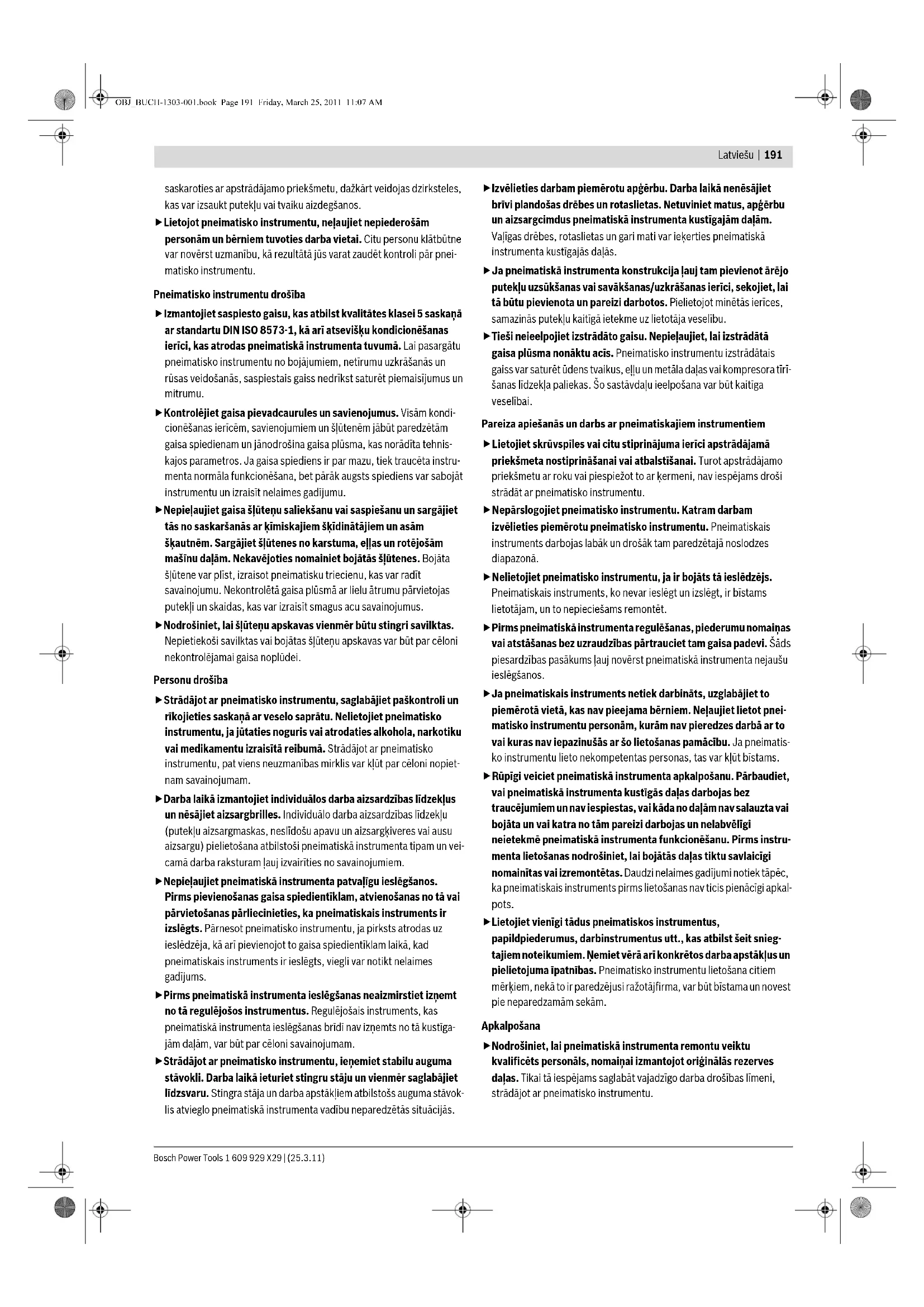 OBJ_BUCH-1303-001.book Page 190 Friday, March 25, 2011 11:07 AMLatviešu | 191 Bosch Power Tools 1 609 929 X29 | (25.3.11) saskaroties ar apstrādājamo priekšmetu, dažkārt veidojas dzirksteles, kas var izsaukt putekļu vai tvaiku aizdegšanos. fLietojot pneimatisko instrumentu, neļaujiet nepiederošām personām un bērniem tuvoties darba vietai. Citu personu klātbūtne var novērst uzmanību, kā rezultātā jūs varat zaudēt kontroli pār pnei- matisko instrumentu. Pneimatisko instrumentu drošība fIzmantojiet saspiesto gaisu, kas atbilst kvalitātes klasei 5 saskaņā ar standartu DIN ISO 8573-1, kā arī atsevišķu kondicionēšanas ierīci, kas atrodas pneimatiskā instrumenta tuvumā. Lai pasargātu pneimatisko instrumentu no bojājumiem, netīrumu uzkrāšanās un rūsas veidošanās, saspiestais gaiss nedrīkst saturēt piemaisījumus un mitrumu. fKontrolējiet gaisa pievadcaurules un savienojumus. Visām kondi- cionēšanas ierīcēm, savienojumiem un šļūtenēm jābūt paredzētām gaisa spiedienam un jānodrošina gaisa plūsma, kas norādīta tehnis- kajos parametros. Ja gaisa spiediens ir par mazu, tiek traucēta instru- menta normāla funkcionēšana, bet pārāk augsts spiediens var sabojāt instrumentu un izraisīt nelaimes gadījumu. fNepieļaujiet gaisa šļūteņu saliekšanu vai saspiešanu un sargājiet tās no saskaršanās ar ķīmiskajiem šķīdinātājiem un asām šķautnēm. Sargājiet šļūtenes no karstuma, eļļas un rotējošām mašīnu daļām. Nekavējoties nomainiet bojātās šļūtenes. Bojāta šļūtene var plīst, izraisot pneimatisku triecienu, kas var radīt savainojumu. Nekontrolētā gaisa plūsmā ar lielu ātrumu pārvietojas putekļi un skaidas, kas var izraisīt smagus acu savainojumus. fNodrošiniet, lai šļūteņu apskavas vienmēr būtu stingri savilktas. Nepietiekoši savilktas vai bojātas šļūteņu apskavas var būt par cēloni nekontrolējamai gaisa noplūdei. Personu drošība fStrādājot ar pneimatisko instrumentu, saglabājiet paškontroli un rīkojieties saskaņā ar veselo saprātu. Nelietojiet pneimatisko instrumentu, ja jūtaties noguris vai atrodaties alkohola, narkotiku vai medikamentu izraisītā reibumā. Strādājot ar pneimatisko instrumentu, pat viens neuzmanības mirklis var kļūt par cēloni nopiet- nam savainojumam. fDarba laikā izmantojiet individuālos darba aizsardzības līdzekļus un nēsājiet aizsargbrilles. Individuālo darba aizsardzības līdzekļu (putekļu aizsargmaskas, neslīdošu apavu un aizsargķiveres vai ausu aizsargu) pielietošana atbilstoši pneimatiskā instrumenta tipam un vei- camā darba raksturam ļauj izvairīties no savainojumiem. fNepieļaujiet pneimatiskā instrumenta patvaļīgu ieslēgšanos. Pirms pievienošanas gaisa spiedientīklam, atvienošanas no tā vai pārvietošanas pārliecinieties, ka pneimatiskais instruments ir izslēgts. Pārnesot pneimatisko instrumentu, ja pirksts atrodas uz ieslēdzēja, kā arī pievienojot to gaisa spiedientīklam laikā, kad pneimatiskais instruments ir ieslēgts, viegli var notikt nelaimes gadījums. fPirms pneimatiskā instrumenta ieslēgšanas neaizmirstiet izņemt no tā regulējošos instrumentus. Regulējošais instruments, kas pneimatiskā instrumenta ieslēgšanas brīdī nav izņemts no tā kustīga- jām daļām, var būt par cēloni savainojumam. fStrādājot ar pneimatisko instrumentu, ieņemiet stabilu auguma stāvokli. Darba laikā ieturiet stingru stāju un vienmēr saglabājiet līdzsvaru. Stingra stāja un darba apstākļiem atbilstošs auguma stāvok- lis atvieglo pneimatiskā instrumenta vadību neparedzētās situācijās. fIzvēlieties darbam piemērotu apģērbu. Darba laikā nenēsājiet brīvi plandošas drēbes un rotaslietas. Netuviniet matus, apģērbu un aizsargcimdus pneimatiskā instrumenta kustīgajām daļām. Vaļīgas drēbes, rotaslietas un gari mati var ieķerties pneimatiskā instrumenta kustīgajās daļās. fJa pneimatiskā instrumenta konstrukcija ļauj tam pievienot ārējo putekļu uzsūkšanas vai savākšanas/uzkrāšanas ierīci, sekojiet, lai tā būtu pievienota un pareizi darbotos. Pielietojot minētās ierīces, samazinās putekļu kaitīgā ietekme uz lietotāja veselību. fTieši neieelpojiet izstrādāto gaisu. Nepieļaujiet, lai izstrādātā gaisa plūsma nonāktu acīs. Pneimatisko instrumentu izstrādātais gaiss var saturēt ūdens tvaikus, eļļu un metāla daļas vai kompresora tīrī- šanas līdzekļa paliekas. Šo sastāvdaļu ieelpošana var būt kaitīga veselībai. Pareiza apiešanās un darbs ar pneimatiskajiem instrumentiem fLietojiet skrūvspīles vai citu stiprinājuma ierīci apstrādājamā priekšmeta nostiprināšanai vai atbalstīšanai. Turot apstrādājamo priekšmetu ar roku vai piespiežot to ar ķermeni, nav iespējams droši strādāt ar pneimatisko instrumentu. fNepārslogojiet pneimatisko instrumentu. Katram darbam izvēlieties piemērotu pneimatisko instrumentu. Pneimatiskais instruments darbojas labāk un drošāk tam paredzētajā noslodzes diapazonā. fNelietojiet pneimatisko instrumentu, ja ir bojāts tā ieslēdzējs. Pneimatiskais instruments, ko nevar ieslēgt un izslēgt, ir bīstams lietotājam, un to nepieciešams remontēt. fPirms pneimatiskā instrumenta regulēšanas, piederumu nomaiņas vai atstāšanas bez uzraudzības pārtrauciet tam gaisa padevi. Šāds piesardzības pasākums ļauj novērst pneimatiskā instrumenta nejaušu ieslēgšanos. fJa pneimatiskais instruments netiek darbināts, uzglabājiet to piemērotā vietā, kas nav pieejama bērniem. Neļaujiet lietot pnei- matisko instrumentu personām, kurām nav pieredzes darbā ar to vai kuras nav iepazinušās ar šo lietošanas pamācību. Ja pneimatis- ko instrumentu lieto nekompetentas personas, tas var kļūt bīstams. fRūpīgi veiciet pneimatiskā instrumenta apkalpošanu. Pārbaudiet, vai pneimatiskā instrumenta kustīgās daļas darbojas bez traucējumiem un nav iesp
