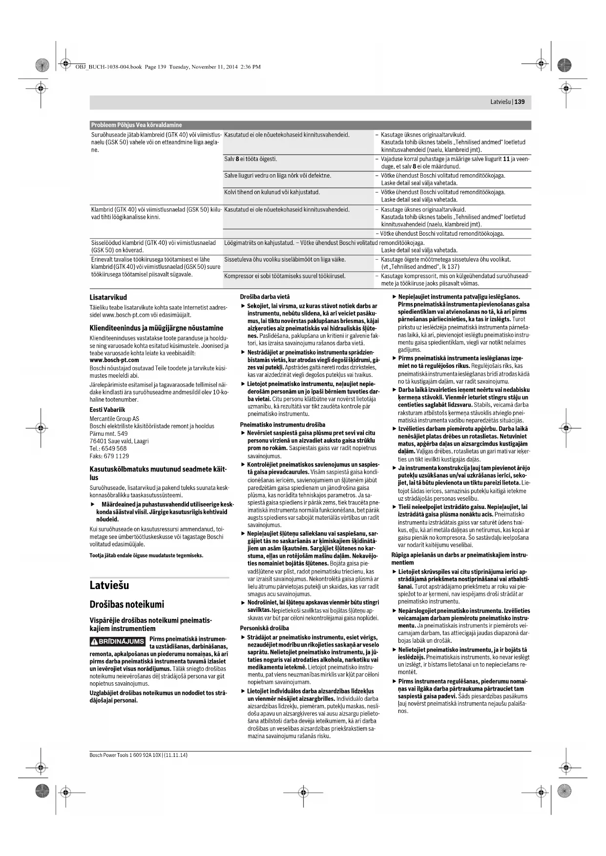 Pirms instrumenta regulēšanas, piederumu nomai- ņas vai ilgāka darba pārtraukuma pārtrauciet tam saspiestā gaisa padevi. Šāds piesardzības pasākums ļauj novērst pneimatiskā instrumenta nejaušu palaiša- nos. Suruõhuseade jätab klambreid (GTK 40) või viimistlus- naelu (GSK 50) vahele või on etteandmine liiga aegla- ne. Kasutatud ei ole nõuetekohaseid kinnitusvahendeid. – Kasutage üksnes originaaltarvikuid. Kasutada tohib üksnes tabelis „Tehnilised andmed“ loetletud kinnitusvahendeid (naelu, klambreid jmt). Salv 8 ei tööta õigesti. – Vajaduse korral puhastage ja määrige salve liugurit 11 ja veen- duge, et salv 8 ei ole määrdunud. Salve liuguri vedru on liiga nõrk või defektne. – Võtke ühendust Boschi volitatud remonditöökojaga. Laske detail seal välja vahetada. Kolvi tihend on kulunud või kahjustatud. – Võtke ühendust Boschi volitatud remonditöökojaga. Laske detail seal välja vahetada. Klambrid (GTK 40) või viimistlusnaelad (GSK 50) kiilu- vad tihti löögikanalisse kinni. Kasutatud ei ole nõuetekohaseid kinnitusvahendeid. – Kasutage üksnes originaaltarvikuid. Kasutada tohib üksnes tabelis „Tehnilised andmed“ loetletud kinnitusvahendeid (naelu, klambreid jmt). – Võtke ühendust Boschi volitatud remonditöökojaga. Sisselöödud klambrid (GTK 40) või viimistlusnaelad (GSK 50) on kõverad. Löögimatriits on kahjustatud. – Võtke ühendust Boschi volitatud remonditöökojaga. Laske detail seal välja vahetada. Erinevalt tavalise töökiirusega töötamisest ei lähe klambrid (GTK 40) või viimistlusnaelad (GSK 50) suure töökiirusega töötamisel piisavalt sügavale. Sissetuleva õhu vooliku siseläbimõõt on liiga väike. – Kasutage õigete mõõtmetega sissetuleva õhu voolikut. (vt „Tehnilised andmed“, lk 137) Kompressor ei sobi töötamiseks suurel töökiirusel. – Kasutage kompressorit, mis on külgeühendatud suruõhusead- mete ja töökiiruse jaoks piisavalt võimas. Probleem Põhjus Vea kõrvaldamine BRIDINAJUMS OBJ_BUCH-1038-004.book Page 139 Tuesday, November 11, 2014 2:36 PM1 609 92A 10X | (11.11.14) Bosch Power Tools 140 | Latviešu Ja pneimatiskais instruments netiek lietots, uzgla- bājiet to vietā, kas nav pieejama bērniem. Neļaujiet lietot pneimatisko instrumentu personām, kuras ne- prot ar to rīkoties vai nav izlasījušas šos norādīju- mus. Ja pneimatiskos instrumentus lieto nekompeten- tas personas, tie var kļūt bīstami cilvēku veselībai. Rūpīgi kopiet pneimatisko instrumentu. Pārbaudiet, vai kustīgās instrumenta daļas darbojas bez traucē- jumiem un nav iespiestas, vai kāda no daļām nav sa- lauzta vai bojāta tādā veidā, ka tas ietekmē pneima- tiskā instrumenta pareizu funkcionēšanu. Nodroši- niet, lai bojātās daļas pirms pneimatiskā instrumen- ta lietošanas tiktu izremontētas. Daudzi nelaimes ga- dījumi notiek tāpēc, ka pneimatiskie instrumenti nav ti- kuši pienācīgi apkalpoti. Savlaicīgi notīriet un uzasiniet griezošos darbinstru- mentus. Rūpīgi kopti griezošie darbinstrumenti ar asām griezējšķautnēm retāk iestrēgst un ir vieglāk vadāmi. Lietojiet pneimatiskos instrumentus, piederumus, darbinstrumentus utt. atbilstoši šeit sniegtajiem no- rādījumiem. Ņemiet vērā arī konkrētos darba aps- tākļus un pielietojuma īpatnības. Tas ļaus iespēju ro- bežās samazināt putekļu veidošanos, kā arī svārstību un trokšņa rašanos. Pneimatisko instrumentu drīkst uzstādīt, regulēt un lietot tikai kvalificēti un labi apmācīti lietotāji. Pneimatiskā instrumenta konstrukciju nedrīkst ne- kādā veidā mainīt. Izmaiņas var samazināt drošības pa- sākumu efektivitāti un paaugstināt risku instrumenta lie- totājam. Apkalpošana Nodrošiniet, lai pneimatisk ā instrumenta remontu veiktu kvalificēts personāls, nomaiņai izmantojot oriģinālās rezerves daļas. Tikai tā iespējams saglabāt vajadzīgo darba drošības līmeni, strādājot ar pneimatis- ko instrumentu. Drošības noteikumi pneimatiskajiem iedzīša- nas instrumentiem Nēsājiet aizsargbrilles. Vienmēr uzskatiet, ka pneimatiskajā instrumentā ir iepildīti stiprinājuma elementi. Neuzmanīga apieša- nās ar pneimatisko instrumentu var būt par cēloni iedze- namo stiprinājuma elementu pēkšņai izmešanai, kas var izraisīt savainojumu. Darba laikā turiet pneimatisko instrumentu tā, lai netiktu savainota galva vai pārējās ķermeņa daļas iespējama atsitiena gadījumā, ja tiek pārtraukta enerģijas padeve vai notiek mēģinājums iedzīt stip- rinājuma elementu cietā virsmā. Nevērsiet pneimatisko instrumentu pret sevi vai ci- tām tuvumā esošajām personām. Ja nejauši nostrādā triecienmehānisms, var pēkšņi tikt izmests stiprinājuma elements, izraisot savainojumu. Neiedarbiniet pneimatisko instrumentu, pirms tas nav cieši piespiests stiprin āmajam priekšmetam. Ja pneimatiskais instruments nesaskaras ar stiprināmo priekšmetu, stiprinājuma elements var atlekt no stipri- nājuma vietas, izraisot pneimatiskā instrumenta atkār- totu palaišanos. Nestrādājiet uz kāpnēm vai sastatnēm, ja ir izvēlēts palaišanas veids „kontakt- palaišana“. Īpaši jāizvairās veikt dažā- dus darbus, piemēram, aiznaglot kastes vai iežogojumus vai ierīkot transporta stiprinājumus automašīnās vai vagonos, stāvot uz sa- statnēm, kāpnēm, redeļveida trepēm un citām līdzīgām konstrukcijām, piemēram, uz jumta līstēm, kā arī pār- vietoties no vienas darba vietas uz citu pa šādām kons- trukcijām. Izmantojot šo palaišanas veidu, stiprinājuma elements tiek iedzīts ik reizi, kad tiek nospiests palaidējs, pneimatiskajam instrumentam nejauši piespiežoties kādai virsmai. Tas var radī t savainojumus. Strādājiet piemērotos apstākļos. Iedzenamais stipri- nājuma elements var izkļūt cauri plāniem priekšmetiem vai arī noslīdēt no priekšmetu stūriem un malām, radot savainojumus. Pārtrauciet gaisa p