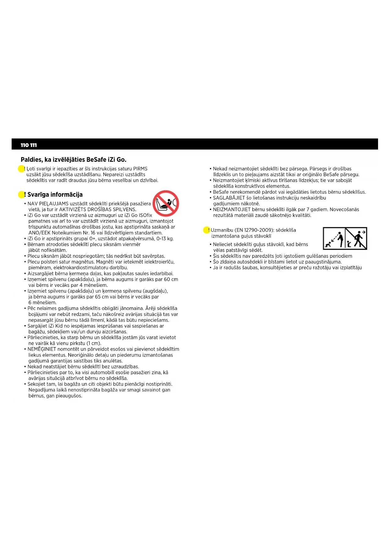 - Sekojiet tam, lai bagāža un citi objekti būtu pienācīgi nostiprināti. Negadījuma laikā nenostiprināta bagāža var smagi savainot gan bērnus, gan pieaugušos. Paldies, ka izvēlējāties BeSafe iZi Go. ! Ļoti svarīgi ir iepazīties ar šīs instrukcijas saturu PIRMS uzsākt jūsu sēdeklīša uzstādīšanu. Nepareizi uzstādīts sēdeklītis var radīt draudus jūsu bērna veselībai un dzīvībai. ! Uzmanību (EN 12790-2009): sēdeklīša izmantošana guļus stāvoklī