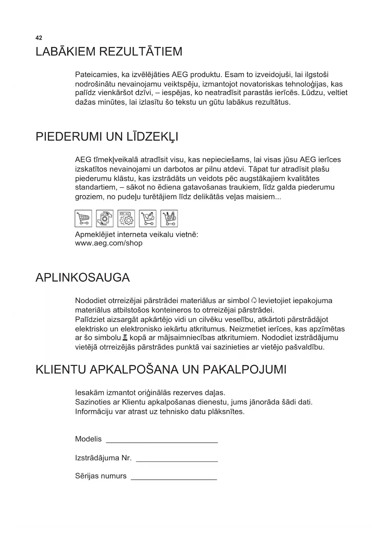 AEG tīmekļveikalā atradīsit visu, kas nepieciešams, lai visas jūsu AEG ierīces izskatītos nevainojami un darbotos ar pilnu atdevi. Tāpat tur atradīsit plašu piederumu klāstu, kas izstrādāts un veidots pēc augstākajiem kvalitātes standartiem, – sākot no ēdiena gatavošanas traukiem, līdz galda piederumu groziem, no pudeļu turētājiem līdz delikātās veļas maisiem... Apmeklējiet interneta veikalu vietnē: www.aeg.com/shop APLINKOSAUGA Nododiet otrreizējai pārstrādei materiālus ar simbol . Ievietojiet iepakojuma materiālus atbilstošos konteineros to otrreizējai pārstrādei. Palīdziet aizsargāt apkārtējo vidi un cilvēku veselību, atkārtoti pārstrādājot elektrisko un elektronisko iekārtu atkritumus. Neizmetiet ierīces, kas apzīmētas ar šo simbolu , kopā ar mājsaimniecības atkritumiem. Nododiet izstrādājumu vietējā otrreizējās pārstrādes punktā vai sazinieties ar vietējo pašvaldību.