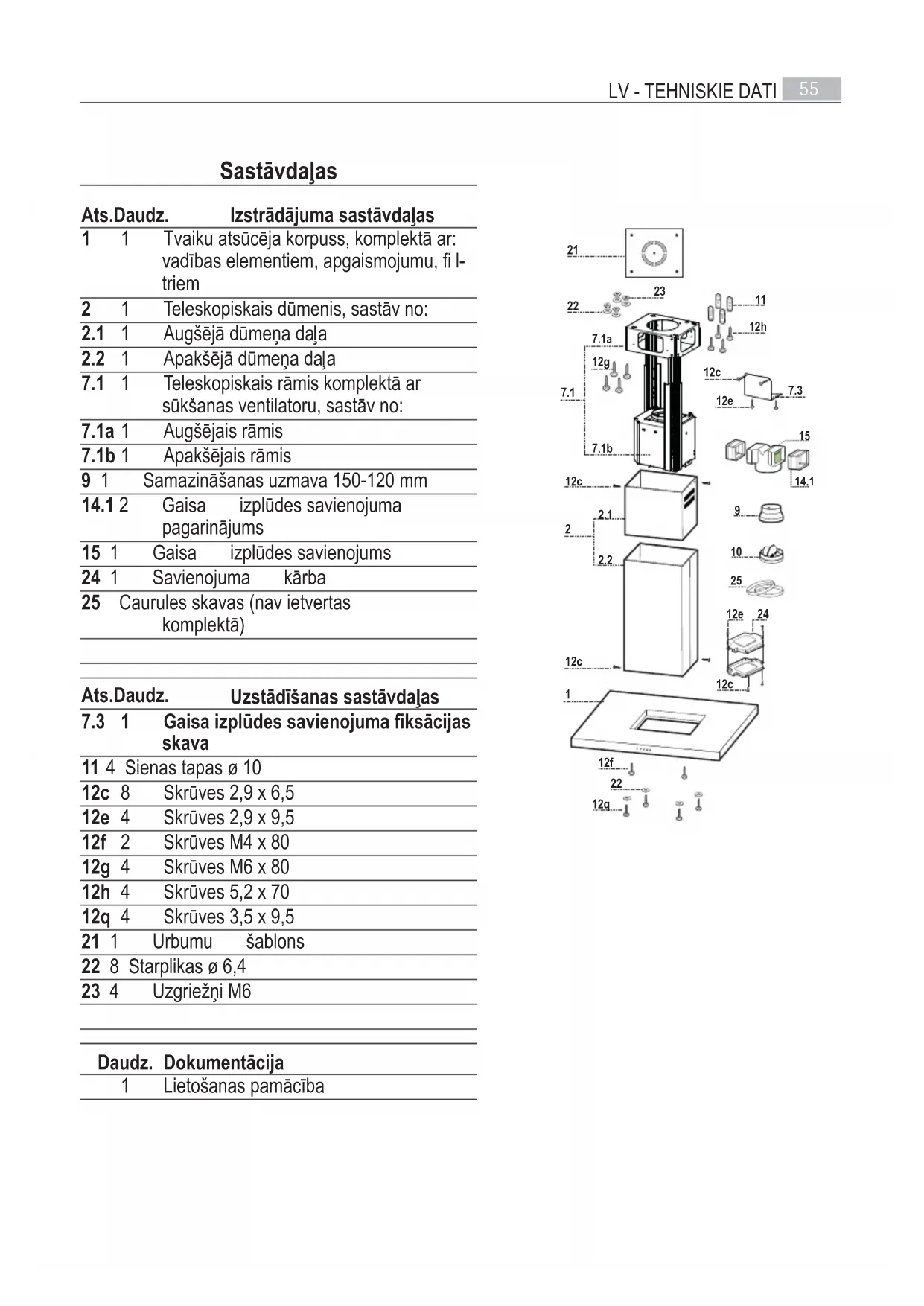 Sastāvdaļas Ats. Daudz. Izstrādājuma sastāvdaļas 1 1 Tvaiku atsūcēja korpuss, komplektā ar: vadības elementiem, apgaismojumu, fi l- triem 2 1 Teleskopiskais dūmenis, sastāv no: