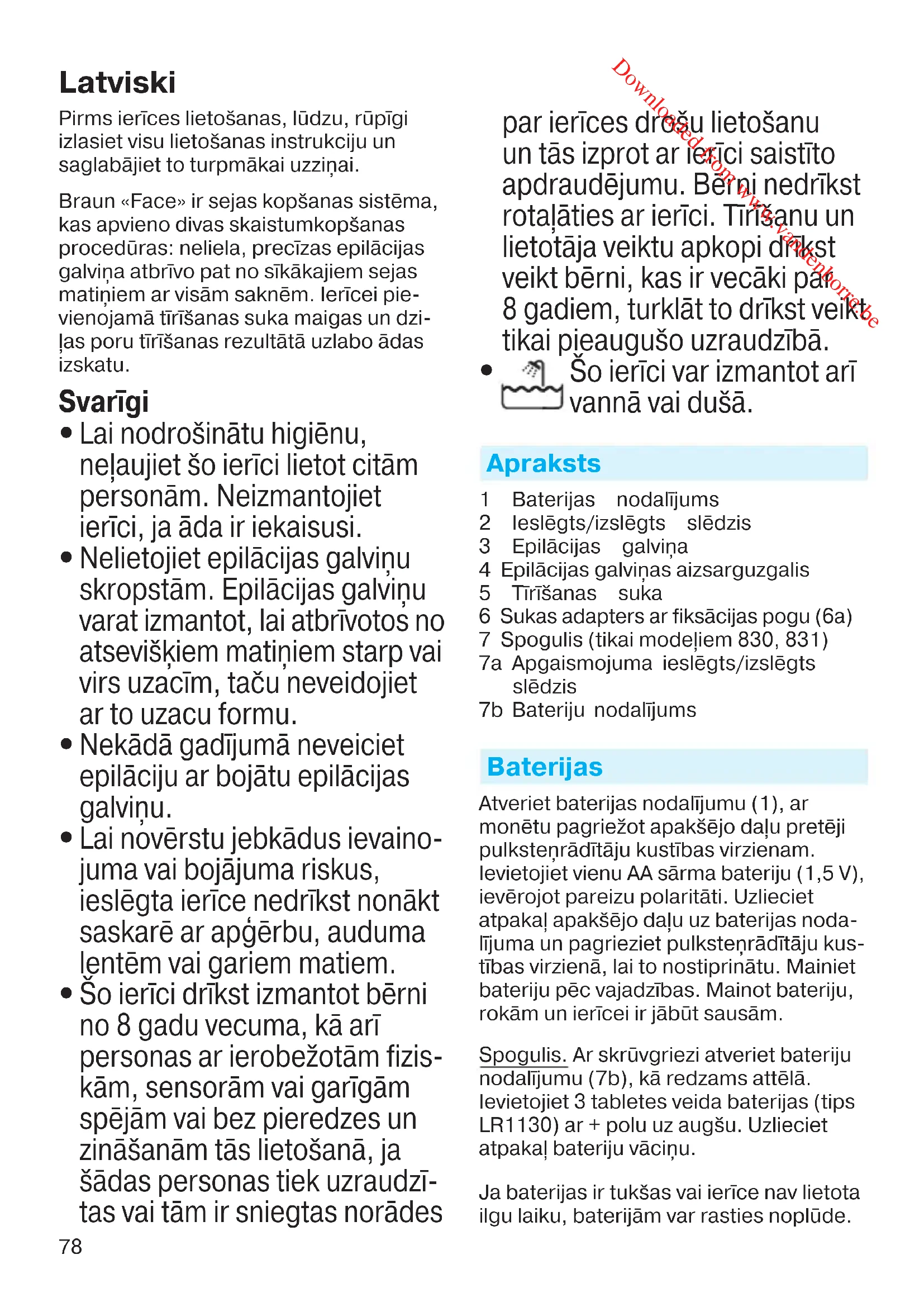 Šo ierīci var izmantot arī vannā vai dušā. Apraksts 1 Baterijas nodalījums 2 Ieslēgts/izslēgts slēdzis 3 Epilācijas galviņa 4 Epilācijas galviņas aizsarguzgalis 5 Tīrīšanas suka 6 Sukas adapters ar fiksācijas pogu (6a) 7 Spogulis (tikai modeļiem 830, 831) 7a Apgaismojuma ieslēgts/izslēgts slēdzis 7b Bateriju nodalījums Baterijas Atveriet baterijas nodalījumu (1), ar monētu pagriežot apakšējo daļu pretēji pulksteņrādītāju kustības virzienam. Ievietojiet vienu AA sārma bateriju (1,5 V), ievērojot pareizu polaritāti. Uzlieciet atpakaļ apakšējo daļu uz baterijas noda- lījuma un pagrieziet pulksteņrādītāju kus- tības virzienā, lai to nostiprinātu. Mainiet bateriju pēc vajadzības. Mainot bateriju, rokām un ierīcei ir jābūt sausām. Spogulis. Ar skrūvgriezi atveriet bateriju nodalījumu (7b), kā redzams attēlā. Ievietojiet 3 tabletes veida baterijas (tips LR1130) ar + polu uz augšu. Uzlieciet atpakaļ bateriju vāciņu. Ja baterijas ir tukšas vai ierīce nav lietota ilgu laiku, baterijām var rasties noplūde. 96892473_SE810_S4-110.indd 7896892473_SE810_S4-110.indd 78 27.02.14 15:3327.02.14 15:33 CSS APPROVED Effective Date 5Mar2014 GMT - Printed 02Oct2014 Page 78 of 110 Downloaded from www.vandenborre.be79 Lai pasargātu sevi un ierīci, lūdzu, laikus izņemiet noplūdušās baterijas un izvairie- ties no to saskares ar ādu. Sejas epilācija