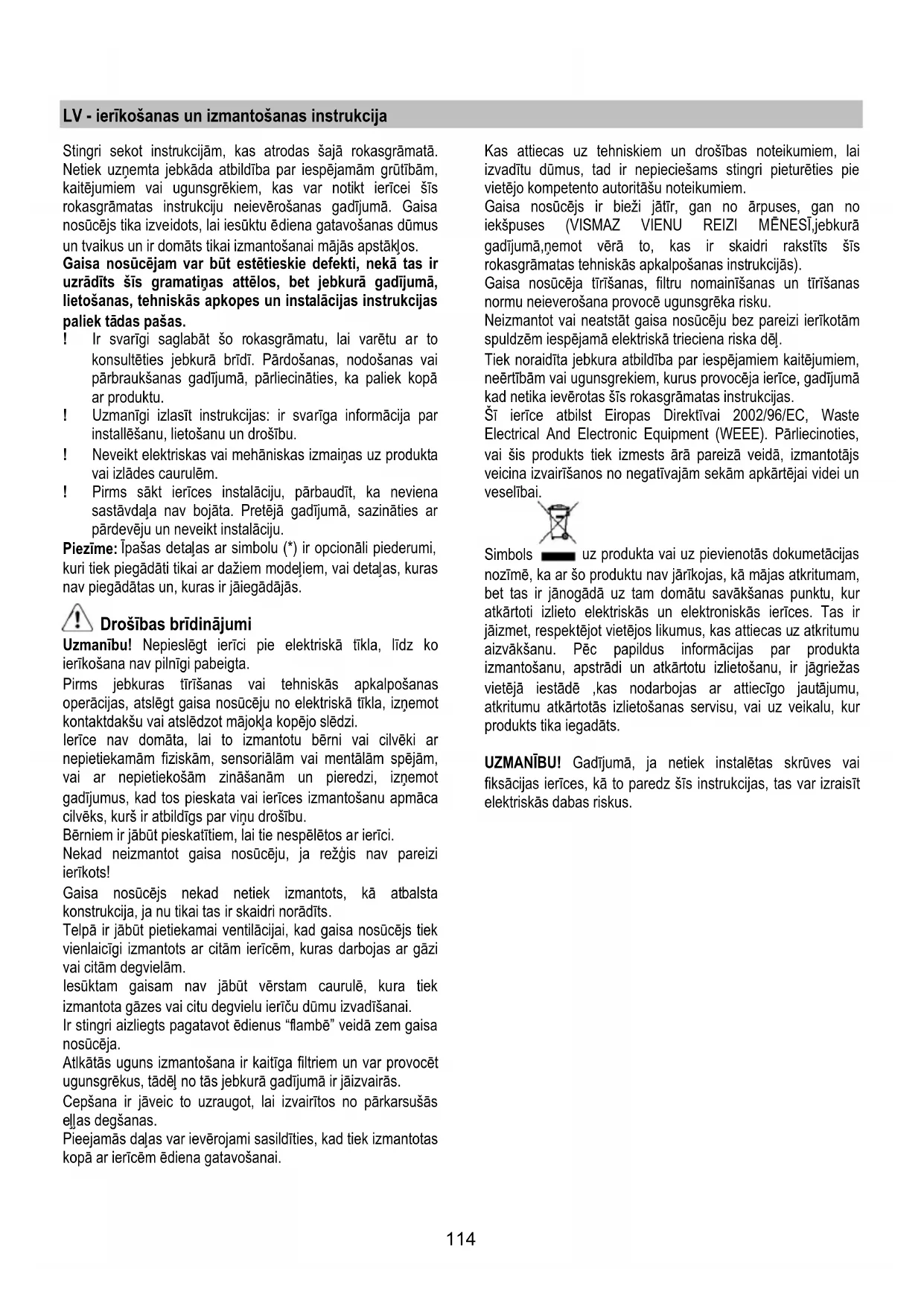- Neplaunamas aktyviosios anglies filtras. Plaunamas aktyviosios anglies filtras Anglies filtrą galima plauti kas antrą mėnesį šiltu vandeniu specialiai tam pritaikytais plovikliais arba indaplovėje, 65°C temperatūroje (jei filtrą plaunate indaplovėje, nustatykite visą plovimo ciklą, filtrą plaukite atskirai nuo kitų indų). Susikaupusį vandenį nupilkite nepažeisdami filtro, tada nuimkite pagalvėlę, esančią plastmasiniame rėme, ir 10 minučių ją džiovinkite orkaitėje, įkaitintoje iki 100° C. Pagalvėlę keiskite kas 3 metus arba anksčiau, jei pastebėjote, kad audeklas pažeistas. Neplaunamas aktyviosios anglies filtras Anglies filtras prisipildo naudojant jį ilgą laiką, priklausomai nuo virtuvės tipo ir riebalų filtro valymo reguliarumo. Bet kokiu atveju, kapsulę reikia keisti mažiausiai kas keturis mėnesius. NEGALIMA plauti ar regeneruoti. Montavimas Iš pradžių prikabinkite aktyviosios anglies filtro galinę dalį prie metalinio gaubto kabliuko, o tada filtro priekį pritvirtinkite prie dviejų rankenėlių. Išmontavimas Išimkite aktyviosios anglies filtrą 90° kampu sukdami rankenėles, kurios jį prilaiko prie gaubto. Lempų keitimas Gartraukyje įrengta diodų technologijos apšvietimo sistema. Diodai užtikrina optimalų apšvietimą, be to, jų naudojimo laikas iki 10 kartų ilgesnis nei tradicinių lempučių, taigi sutaupoma 90 % elektros energijos. Jei norite juos pakeisti, kreipkitės į techninio aptarnavimo tarnybą.114 LV - ierīkošanas un izmantošanas instrukcija Stingri sekot instrukcijām, kas atrodas šajā rokasgrāmatā. Netiek uzņemta jebkāda atbildība par iespējamām grūtībām, kaitējumiem vai ugunsgrēkiem, kas var notikt ierīcei šīs rokasgrāmatas instrukciju neievērošanas gadījumā. Gaisa nosūcējs tika izveidots, lai iesūktu ēdiena gatavošanas dūmus un tvaikus un ir domāts tikai izmantošanai mājās apstākļos. Gaisa nosūcējam var būt estētieskie defekti, nekā tas ir uzrādīts šīs gramatiņas attēlos, bet jebkurā gadījumā, lietošanas, tehniskās apkopes un instalācijas instrukcijas paliek tā das pašas. ! Ir svarīgi saglabāt šo rokasgrāmatu, lai varētu ar to konsultēties jebkurā brīdī. Pārdošanas, nodošanas vai pārbraukšanas gadījumā, pārliecināties, ka paliek kopā ar produktu. ! Uzmanīgi izlasīt instrukcijas: ir svarīga informācija par installēšanu, lietošanu un drošību. ! Neveikt elektriskas vai mehāniskas izmaiņas uz produkta vai izlādes caurulēm. ! Pirms sākt ierīces instalāciju, pārbaudīt, ka neviena sastāvdaļa nav bojāta. Pretējā gadījumā, sazināties ar pārdevēju un neveikt instalāciju. Piezīme: Īpašas detaļas ar simbolu (*) ir opcionāli piederumi, kuri tiek piegādāti tikai ar dažiem modeļiem, vai detaļas, kuras nav piegādātas un, kuras ir jāiegādājās. Drošības brīdinājumi Uzmanību! Nepieslēgt ierīci pie elektriskā tīkla, līdz ko ierīkošana nav pilnīgi pabeigta. Pirms jebkuras tīrīšanas vai tehniskās apkalpošanas operācijas, atslēgt gaisa nosūcēju no elektriskā tīkla, izņemot kontaktdakšu vai atslēdzot mājokļa kopējo slēdzi. Ierīce nav domāta, lai to izmantotu bērni vai cilvēki ar nepietiekamām fiziskām, sensoriālām vai mentālām spējām, vai ar nepietiekošām zināšanām un pieredzi, izņemot gadījumus, kad tos pieskata vai ierīces izmantošanu apmāca cilvēks, kurš ir atbildīgs par viņu droš ību. Bērniem ir jābūt pieskatītiem, lai tie nespēlētos ar ierīci. Nekad neizmantot gaisa nosūcēju, ja režģis nav pareizi ierīkots! Gaisa nosūcējs nekad netiek izmantots, kā atbalsta konstrukcija, ja nu tikai tas ir skaidri norādīts. Telpā ir jābūt pietiekamai ventilācijai, kad gaisa nosūcējs tiek vienlaicīgi izmantots ar citām ierīcēm, kuras darbojas ar gāzi vai citām degvielām. Iesūktam gaisam nav jābūt vērstam caurulē, kura tiek izmantota gāzes vai citu degvielu ierīču dūmu izvadīšanai. Ir stingri aizliegts pagatavot ēdienus “flambē” veidā zem gaisa nosūcēja. Atlk ātās uguns izmantošana ir kaitīga filtriem un var provocēt ugunsgrēkus, tādēļ no tās jebkurā gadījumā ir jāizvairās. Cepšana ir jāveic to uzraugot, lai izvairītos no pārkarsušās eļļas degšanas. Pieejamās daļas var ievērojami sasildīties, kad tiek izmantotas kopā ar ierīcēm ēdiena gatavošanai. Kas attiecas uz tehniskiem un drošības noteikumiem, lai izvadītu dūmus, tad ir nepieciešams stingri pieturēties pie vietējo kompetento autoritāšu noteikumiem. Gaisa nosūcējs ir bieži jātīr, gan no ārpuses, gan no iekšpuses (VISMAZ VIENU REIZI MĒNESĪ,jebkurā gadījumā,ņemot vērā to, kas ir skaidri rakst īts šīs rokasgrāmatas tehniskās apkalpošanas instrukcijās). Gaisa nosūcēja tīrīšanas, filtru nomainīšanas un tīrīšanas normu neieverošana provocē ugunsgrēka risku. Neizmantot vai neatstāt gaisa nosūcēju bez pareizi ierīkotām spuldzēm iespējamā elektriskā trieciena riska dēļ. Tiek noraidīta jebkura atbildība par iespējamiem kaitējumiem, neērtībām vai ugunsgrekiem, kurus provocēja ierīce, gadījumā kad netika ievērotas šīs rokasgrāmatas instrukcijas. Šī ierīce atbilst Eiropas Direktīvai 2002/96/EC, Waste Electrical And Electronic Equipment (WEEE). Pārliecinoties, vai šis produkts tiek izmests ārā pareizā veidā, izmantotājs veicina izvairīšanos no negatīvajām sekām apkārtējai videi un veselībai. Simbols uz produkta vai uz pievienotās dokumetācijas nozīmē, ka ar šo produktu nav jārīkojas, kā mājas atkritumam, bet tas ir jānogādā uz tam domātu savākšanas punktu, kur atkārtoti izlieto elektriskās un elektroniskās ierīces. Tas ir jāizmet, respektējot vietējos likumus, kas attiecas uz atkritumu aizvākšanu. Pēc papildus informācijas par produkta izmantošanu, apstrādi un atkārtotu izlietošanu, ir jāgriežas vietējā iestādē ,kas nodarbo